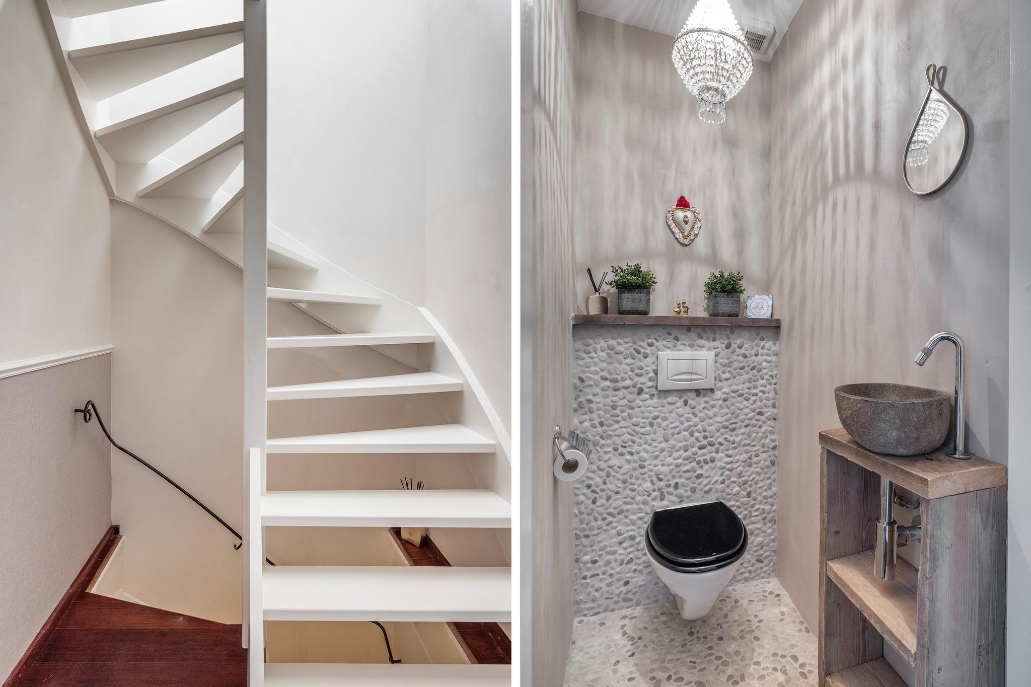 Overloop met toilet, hangend closet met hardstenen waskom, kiezelvloer en gestukte wanden.