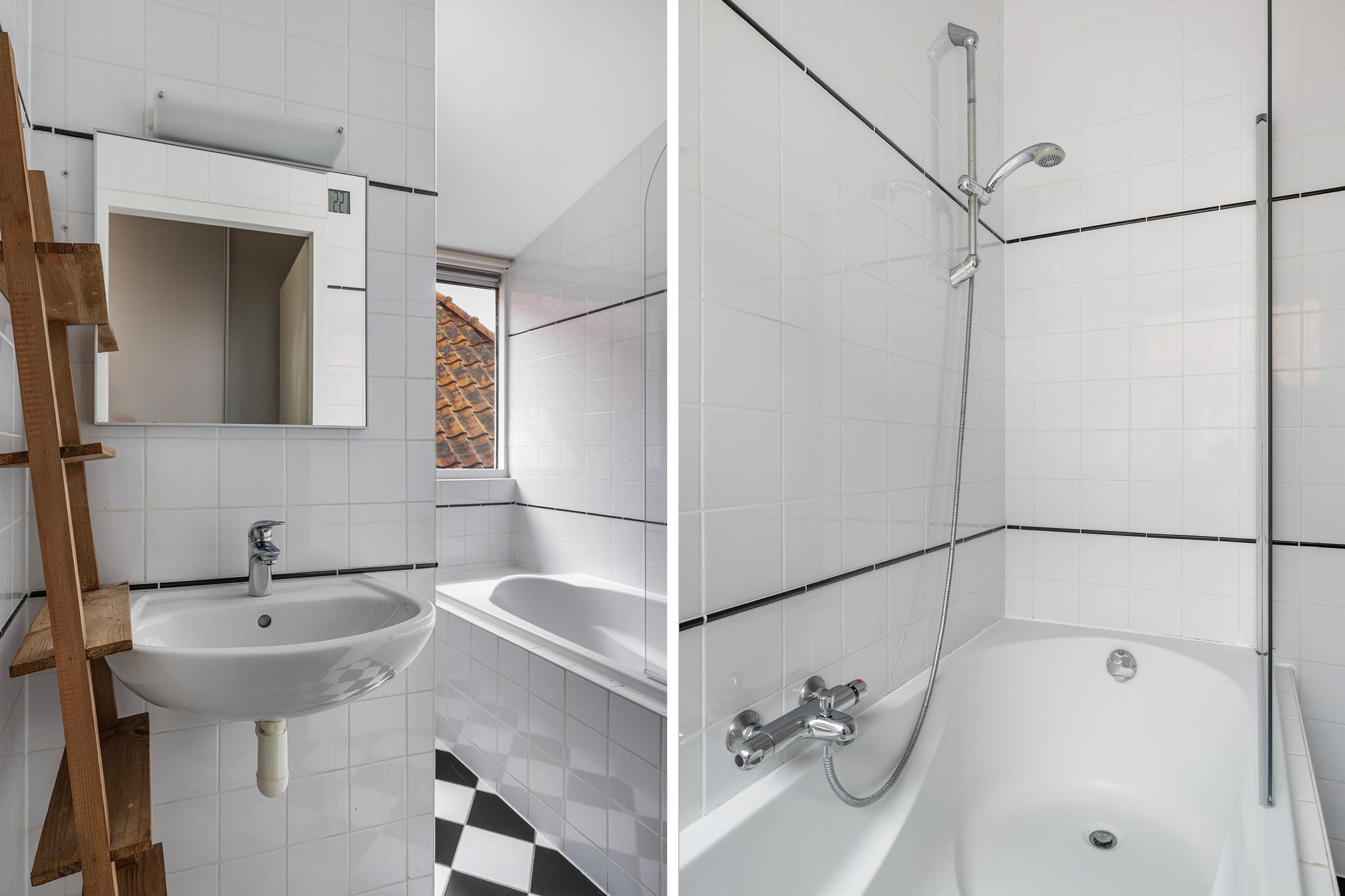 Fijne badkamer (volledig betegeld) met ligbad, wastafel en designradiator.