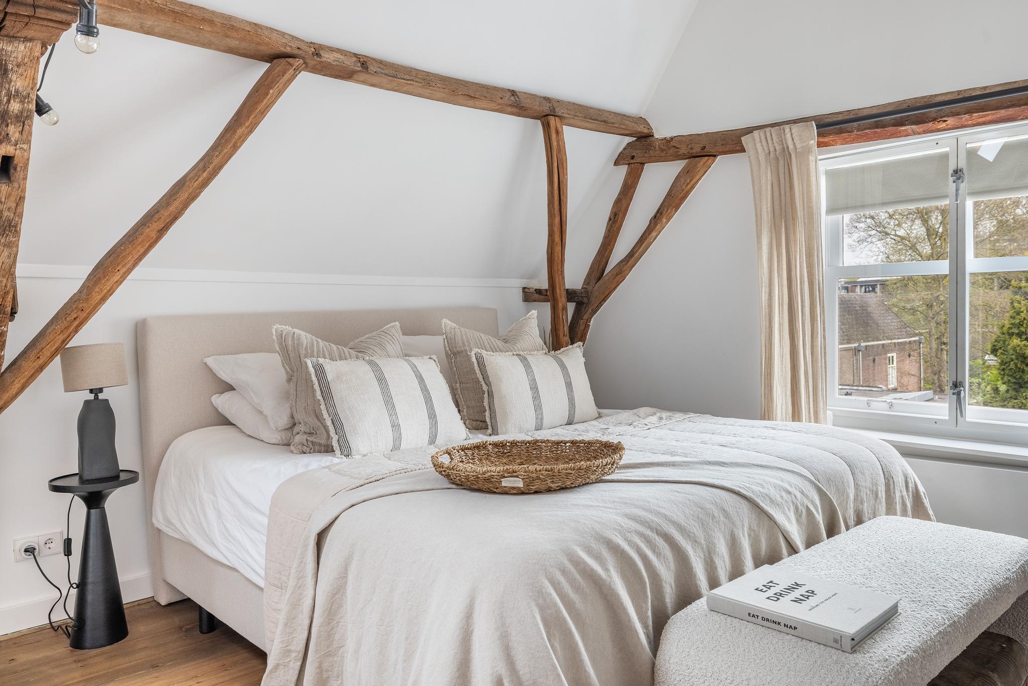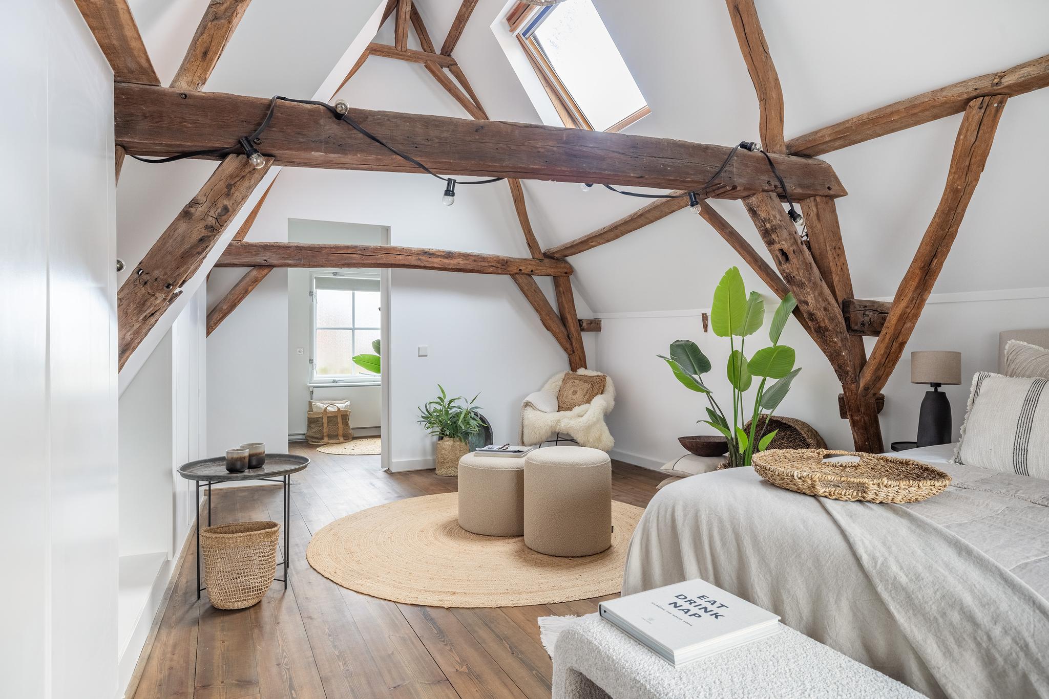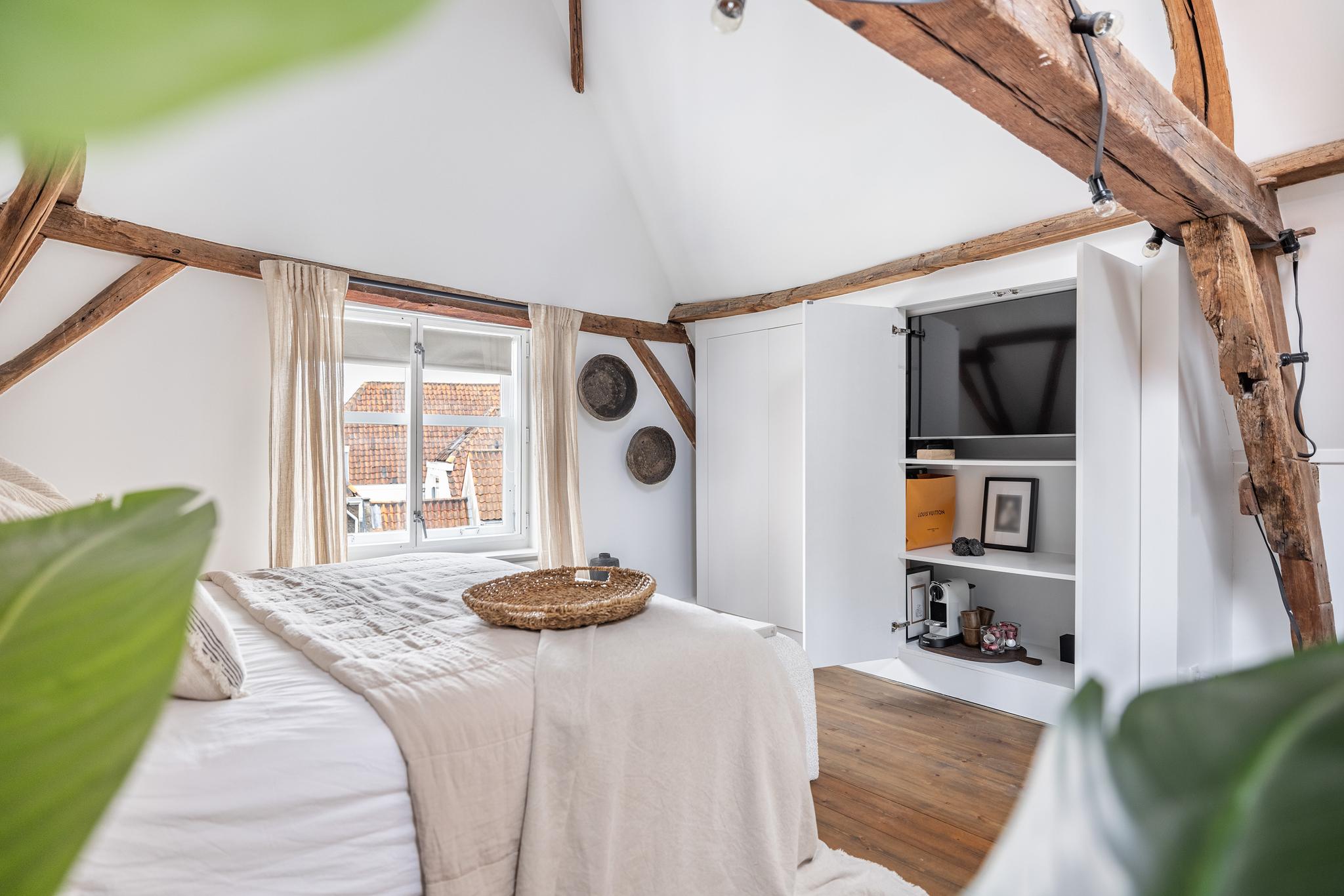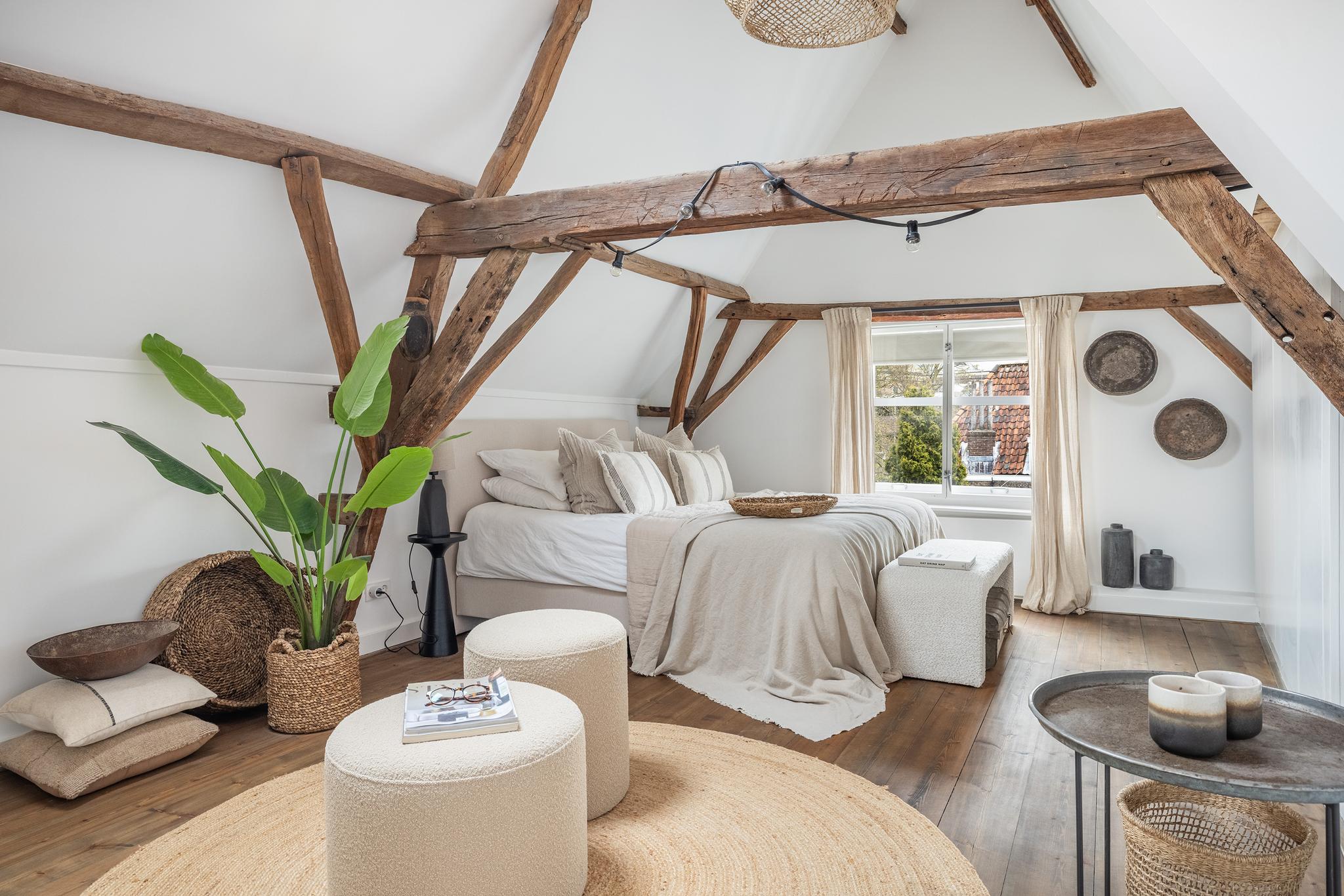 Dan slaapkamer nummer 3 welke is gelegen onder het zadeldak van de woning met de sfeervolle dakbalken in het zicht. Dit is voor de verkoopster de lastigste plek om los te laten, zo'n heerlijke oase van rust met zelfs een eigen koffie hoekje, plek voor een tv en ook hier weer de op maat gemaakte vaste kasten. Bij het binnenstappen van deze ruimte valt alle stress van de dag van je af!
