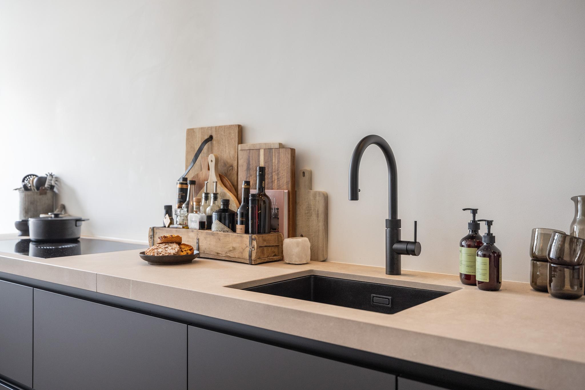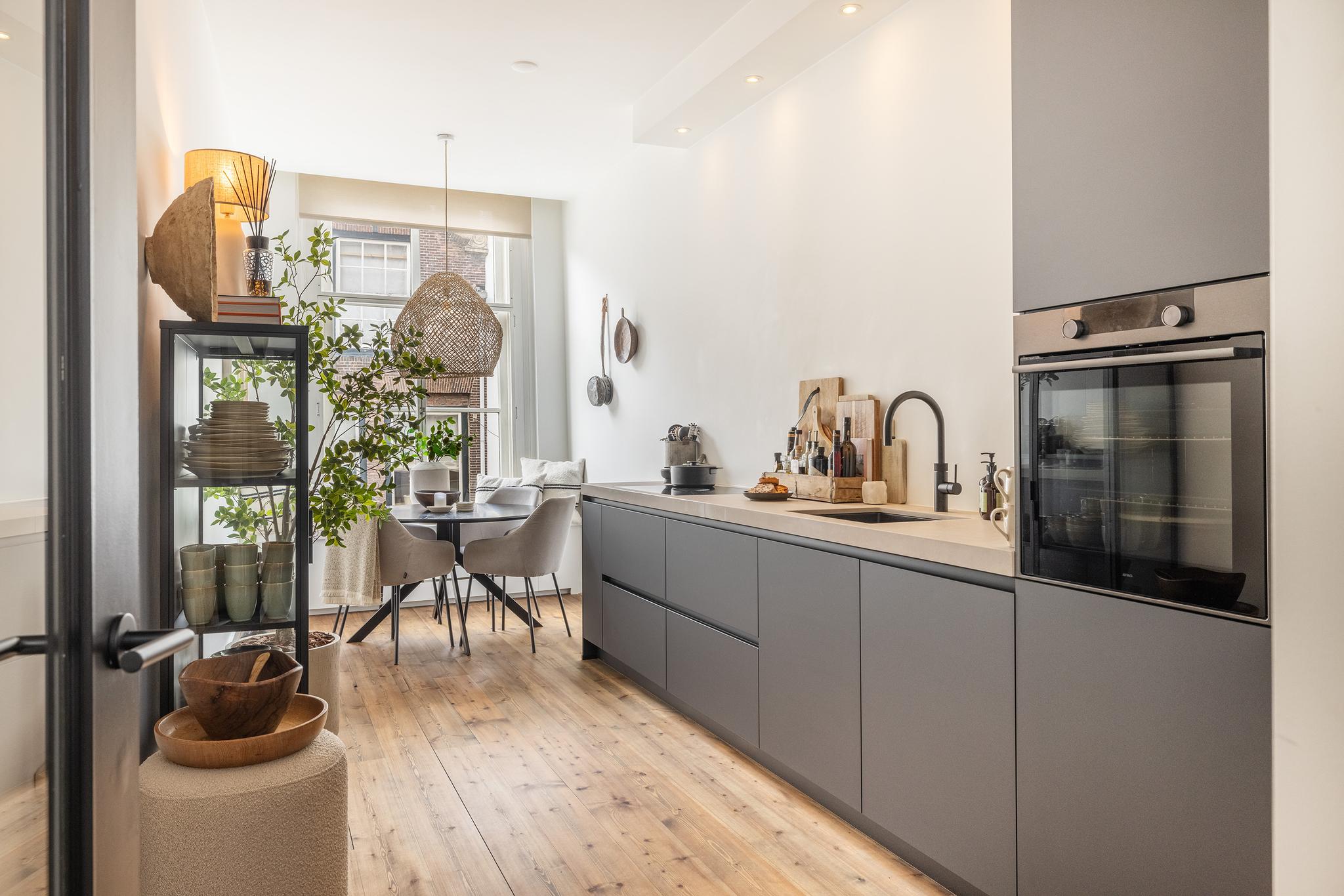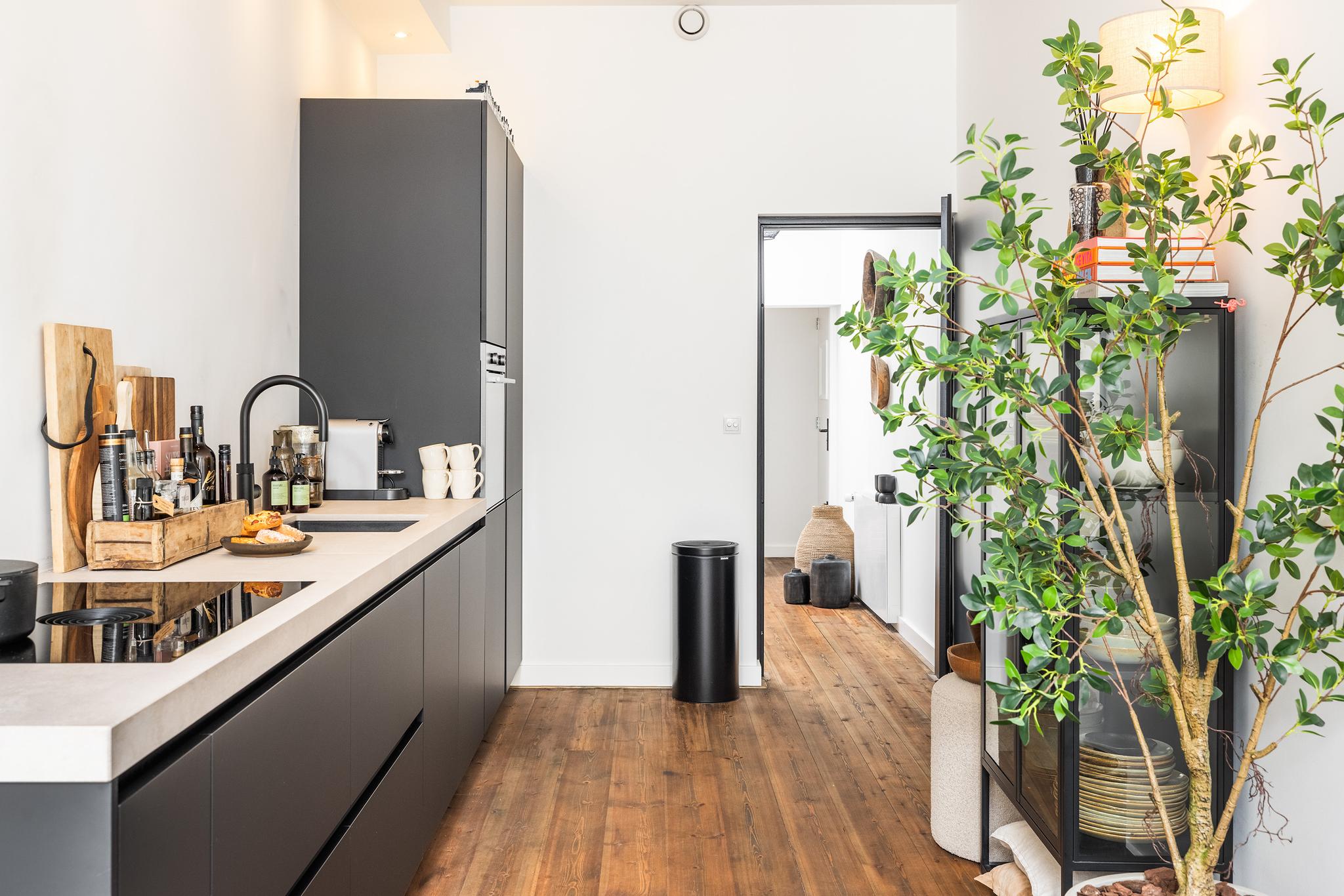 De wand opgestelde keuken is in 2022 geheel nieuw geplaatst en voorzien van een Bora kookplaat met ingebouwde afzuigkap, Quooker kraan, grote oven, vaatwasser, spoelbak, koelkast en vriezer. Het geheel is afgewerkt met een licht composiet blad.