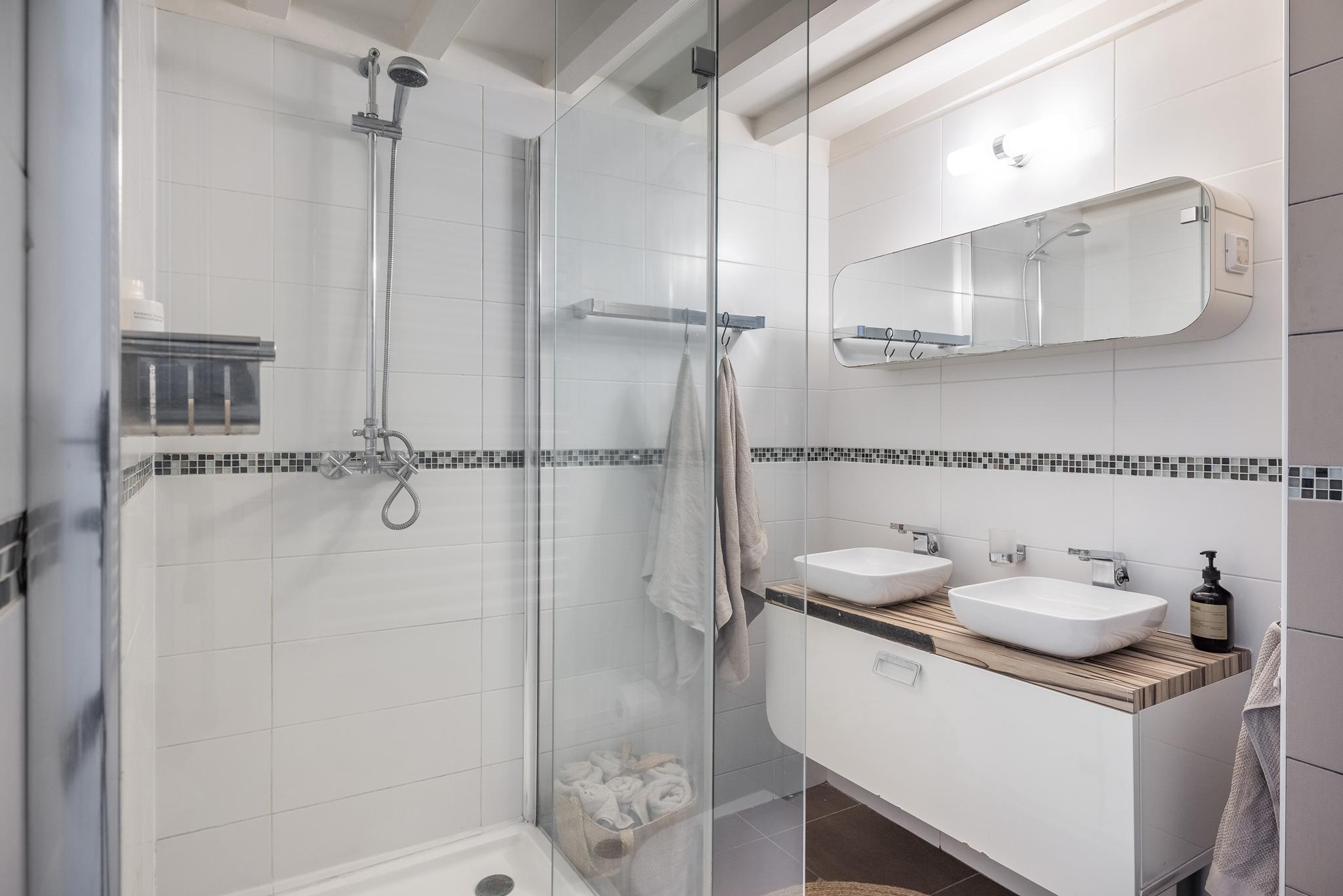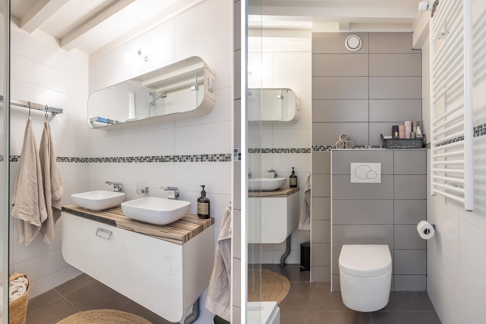 Badkamer met vrijhangend toilet, 2x waskom met meubel, designradiator, geheel betegelde wanden en eigen ventilatie unit.