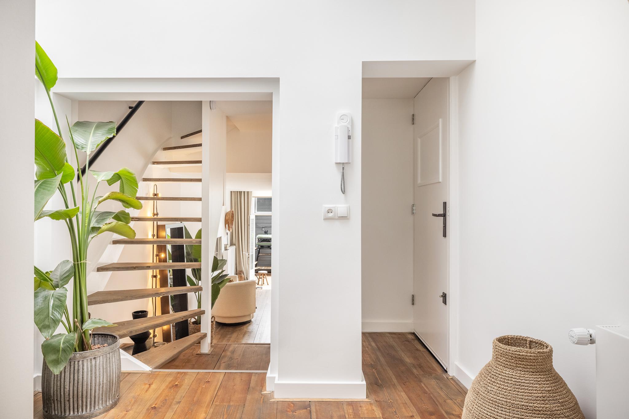 Entree van de woning in de hal met het toilet en de trapopgang. Aan de voorzijde toegang tot de keuken en aan de achterzijde de woonkamer.