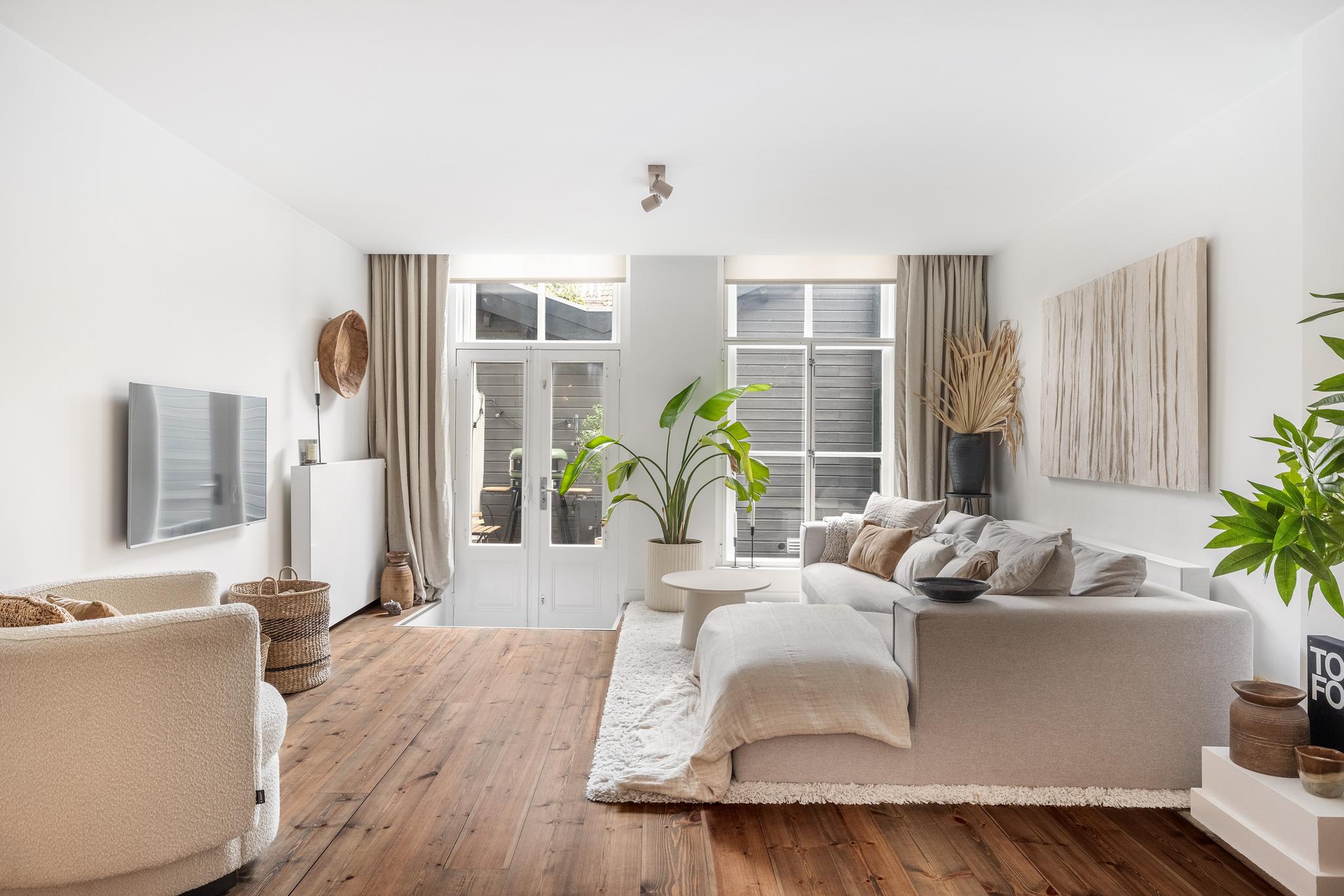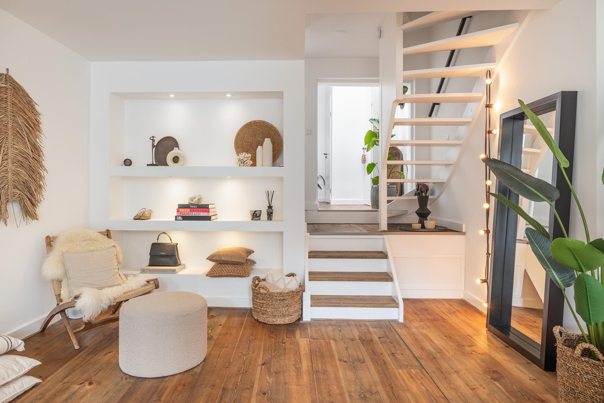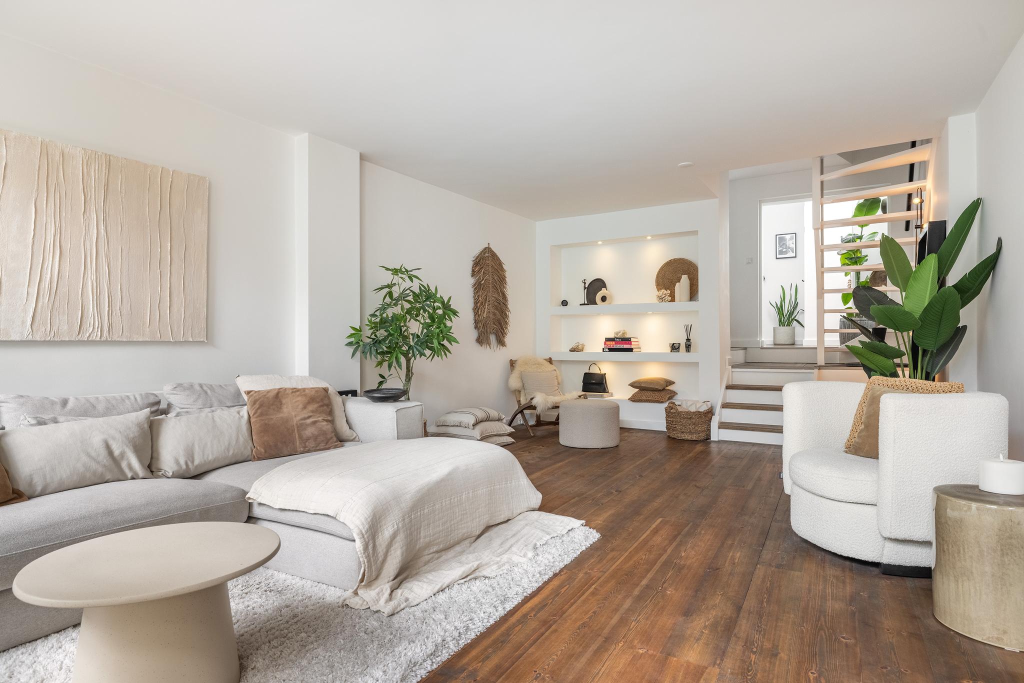 Aan de achterzijde ligt de woonkamer, een oase van rust, de kamer heeft een Ibiza vibe en biedt via openslaande deuren toegang tot het eigen dakterras aan de achterzijde. In de kamer is een mooie op maat gemaakte en volledig gestucte kast aanwezig met sfeerverlichting en een enorme bergruimte onder de trap.