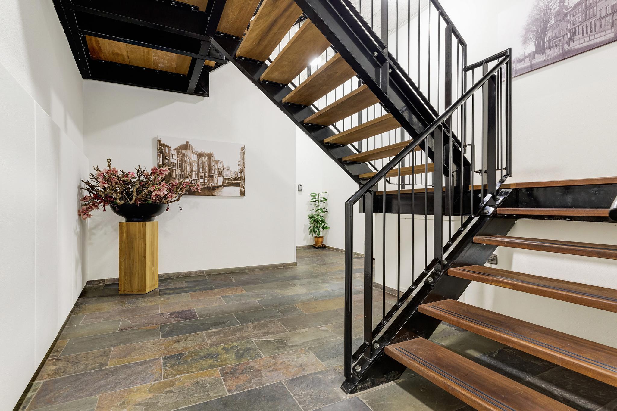 Entree in de afgesloten hal met brievenbussen en bellen tableau, lift en trap naar de verdiepingen.