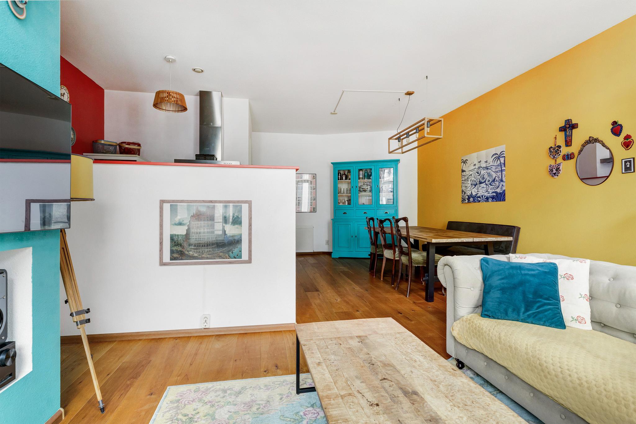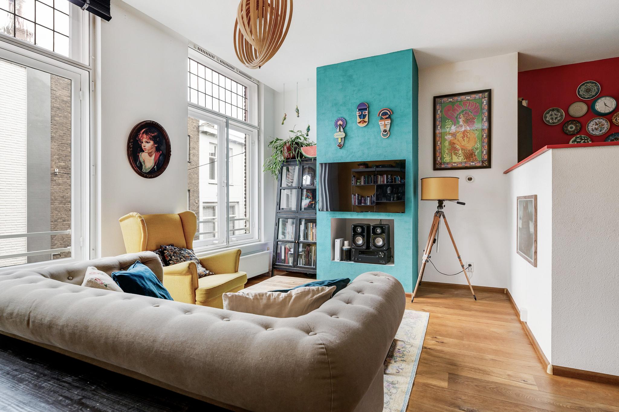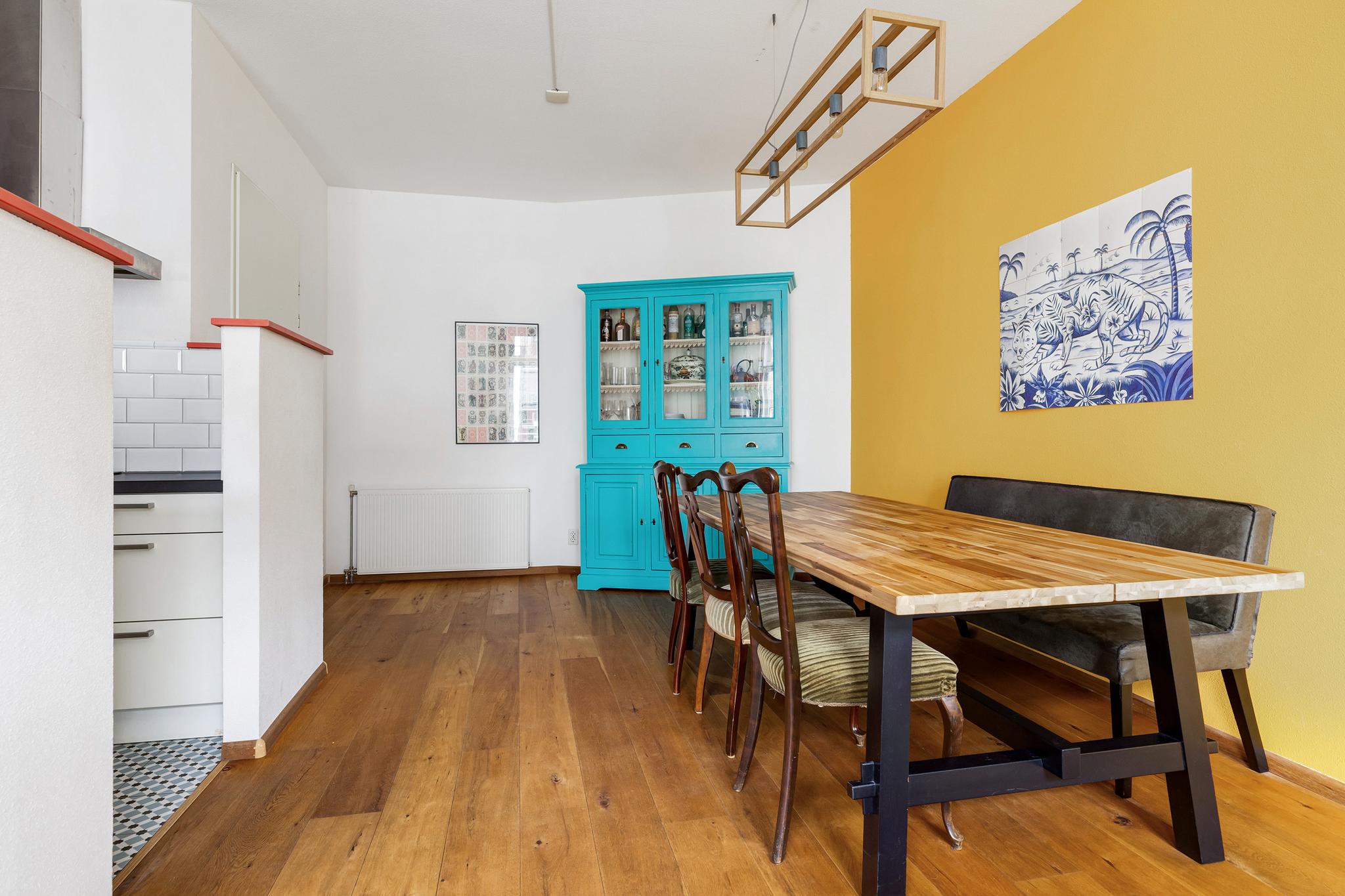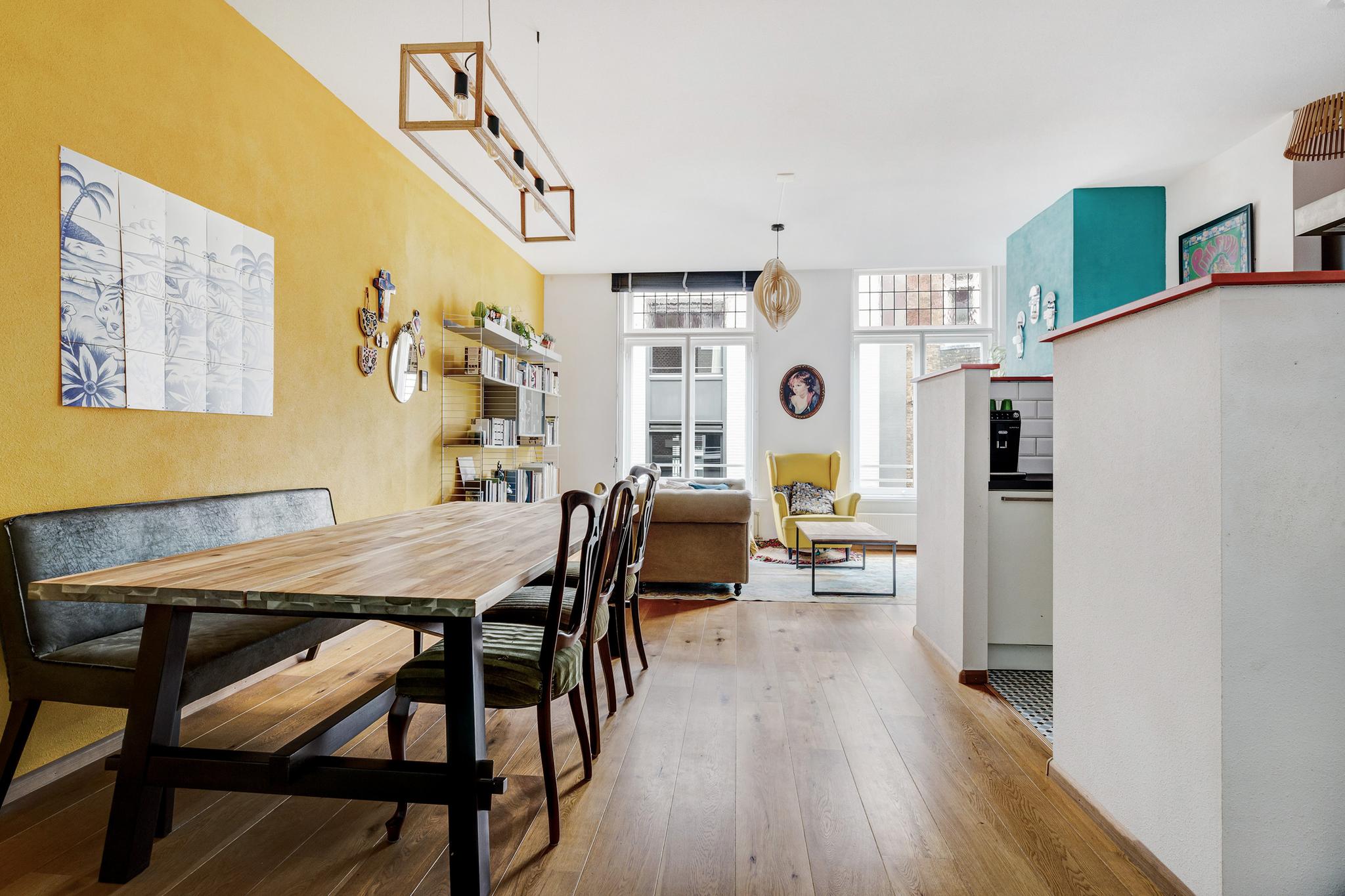 Gezellige woonkamer met hoge plafonds en half open keuken. Mooie grote schuiframen die uitkijken op de Voorstraat en natuurlijk mag glas-in-lood niet ontbreken! De gehele woning is voorzien van eiken vloeren en structuur wanden.