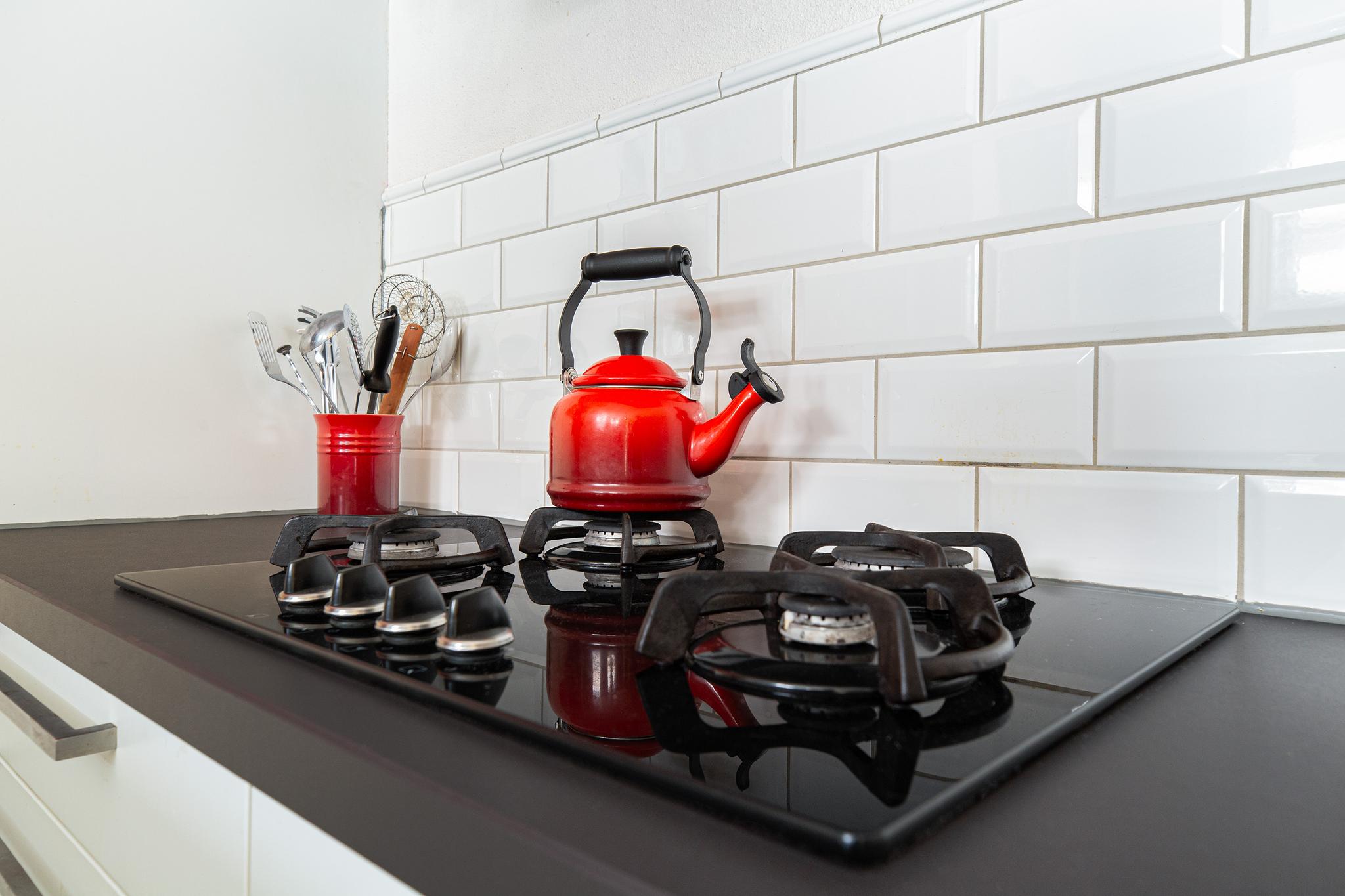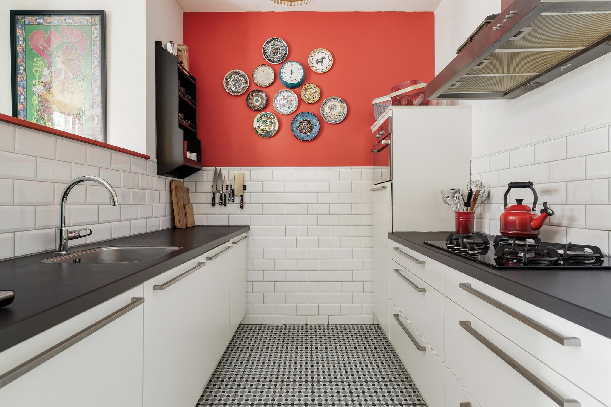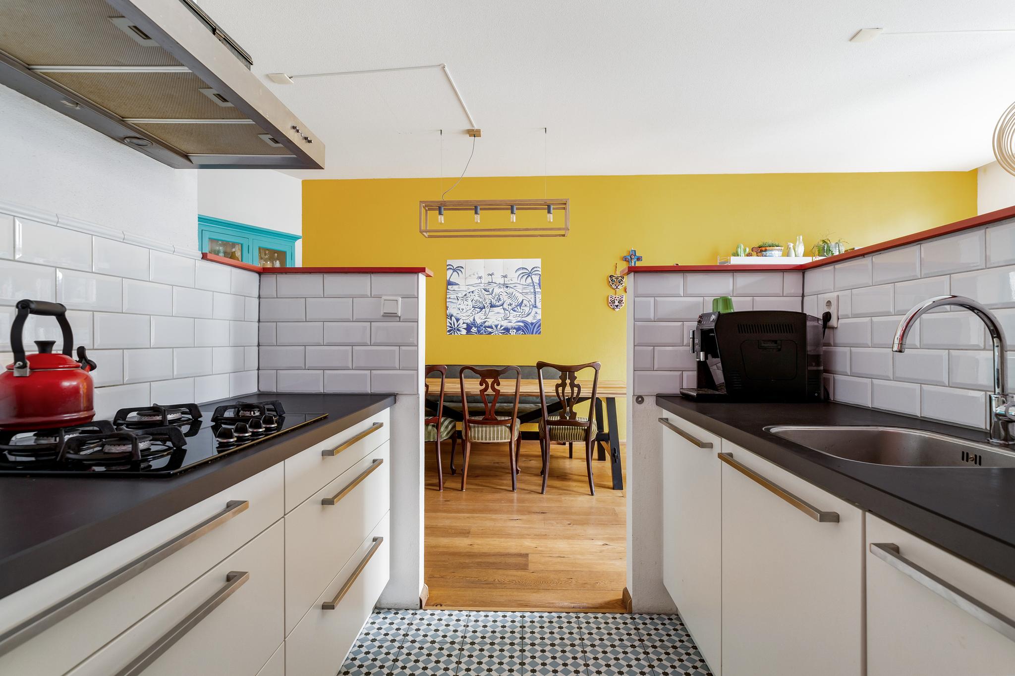 Keuken in dubbele wandopstelling met in 2019 opnieuw betegelde wanden en vloer. De keuken is voorzien van een spoelbak, rvs motorloze afzuigkap, 4 pits gaskookplaat, combi oven, koelkast, vriesvak, vaatwasser en ruimte voor apparatuur.