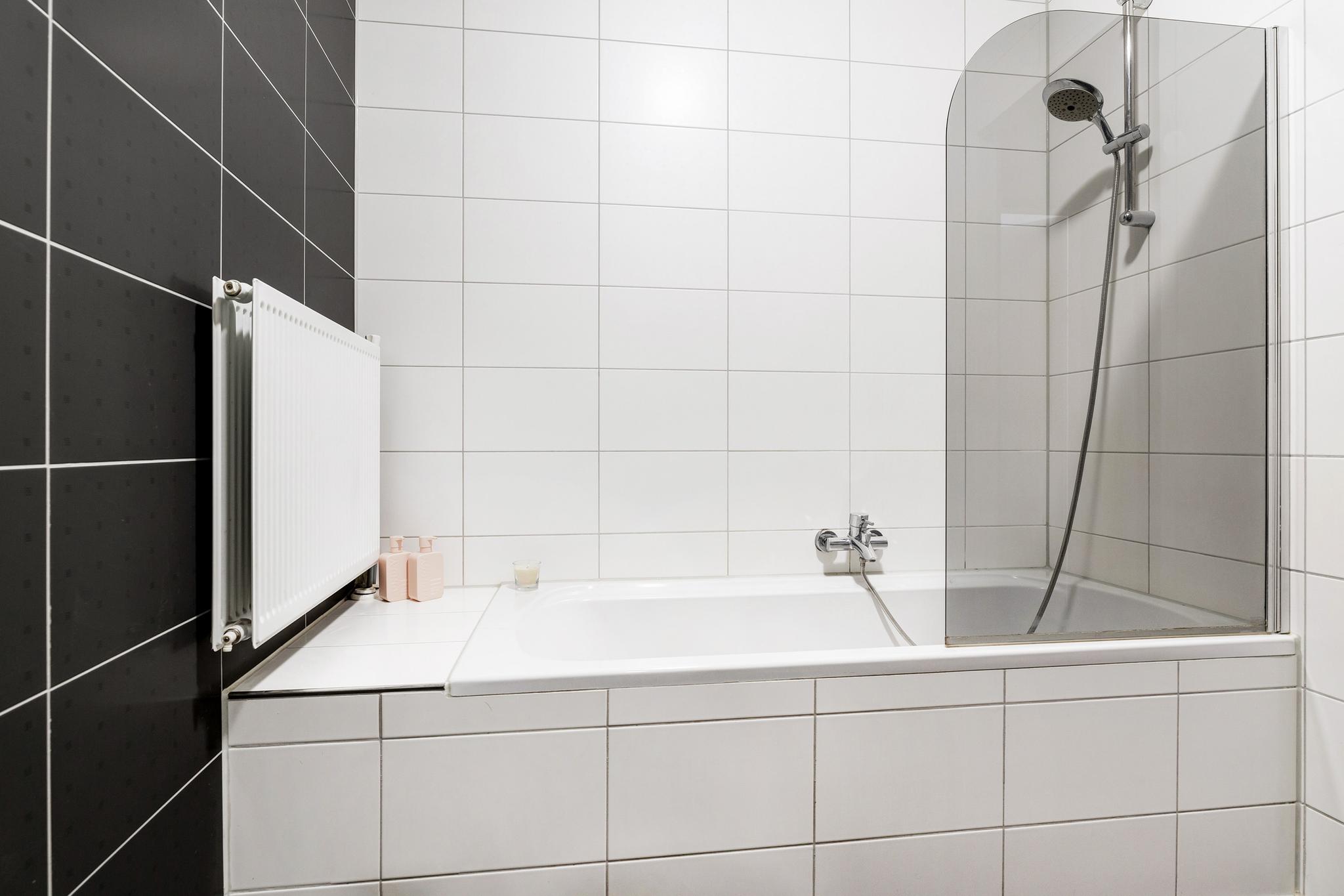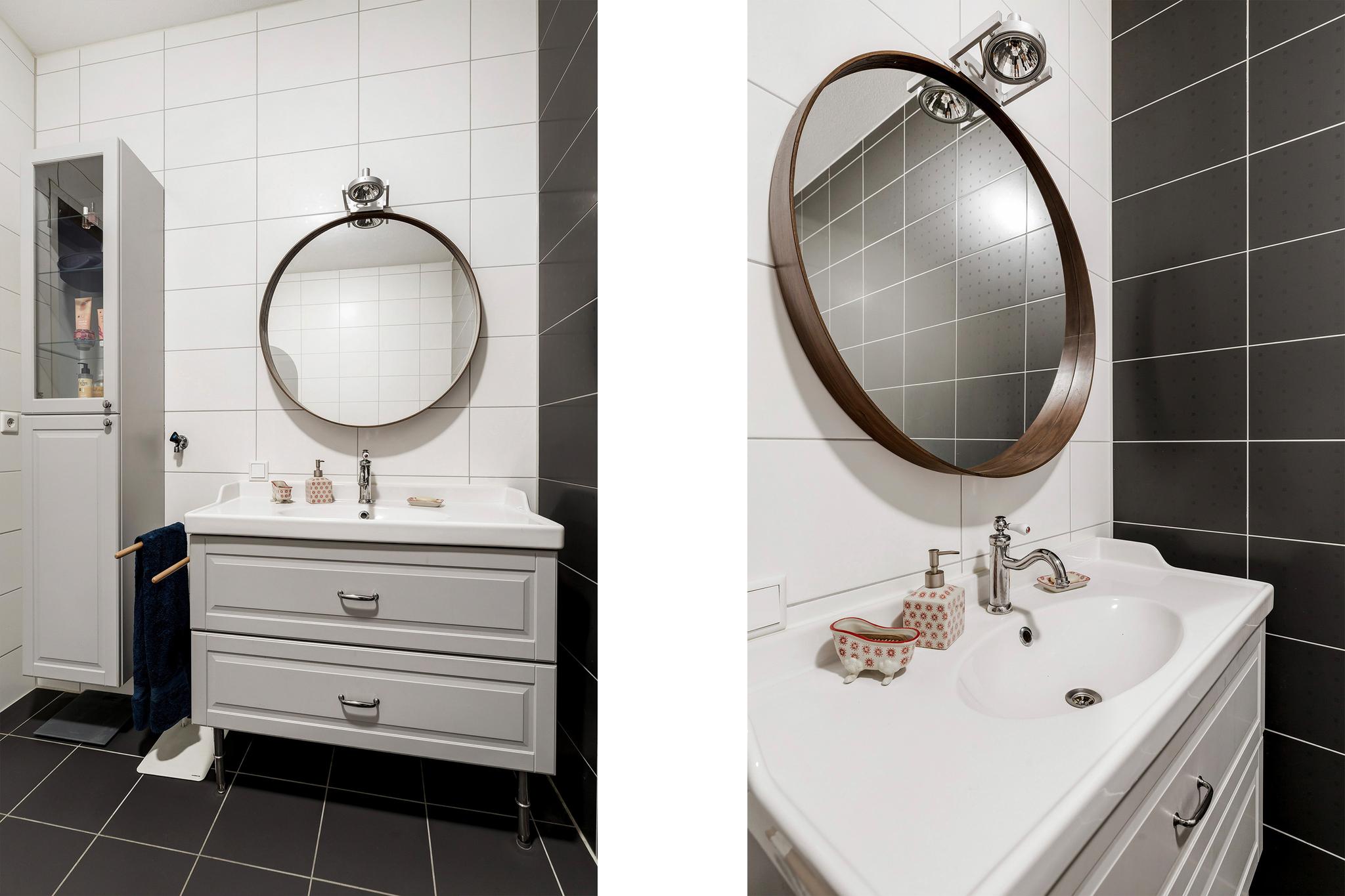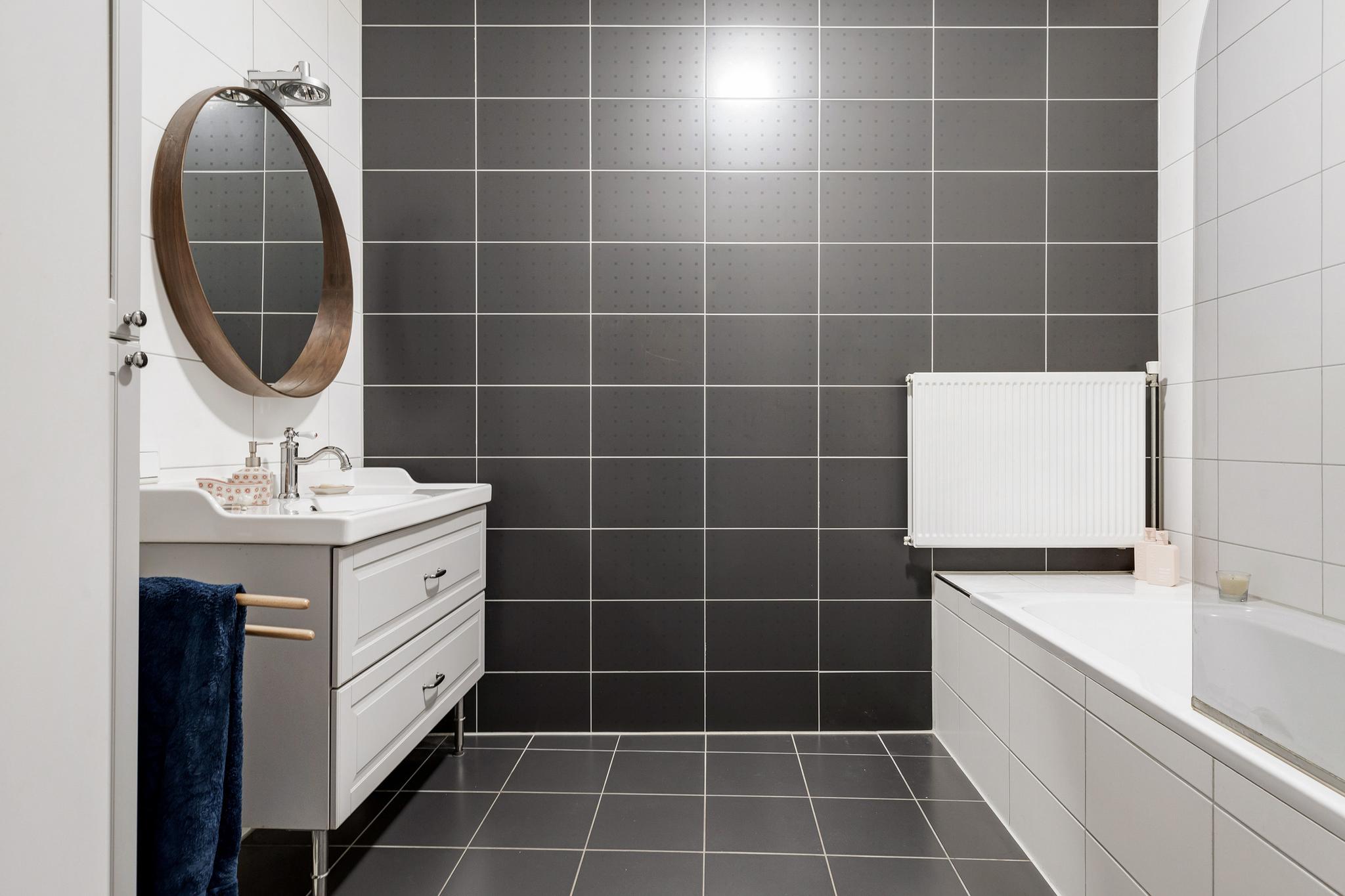 Nette badkamer met wastafel en meubel, bad met douchescherm, ronde spiegel en gedeeltelijk betegelde wanden.