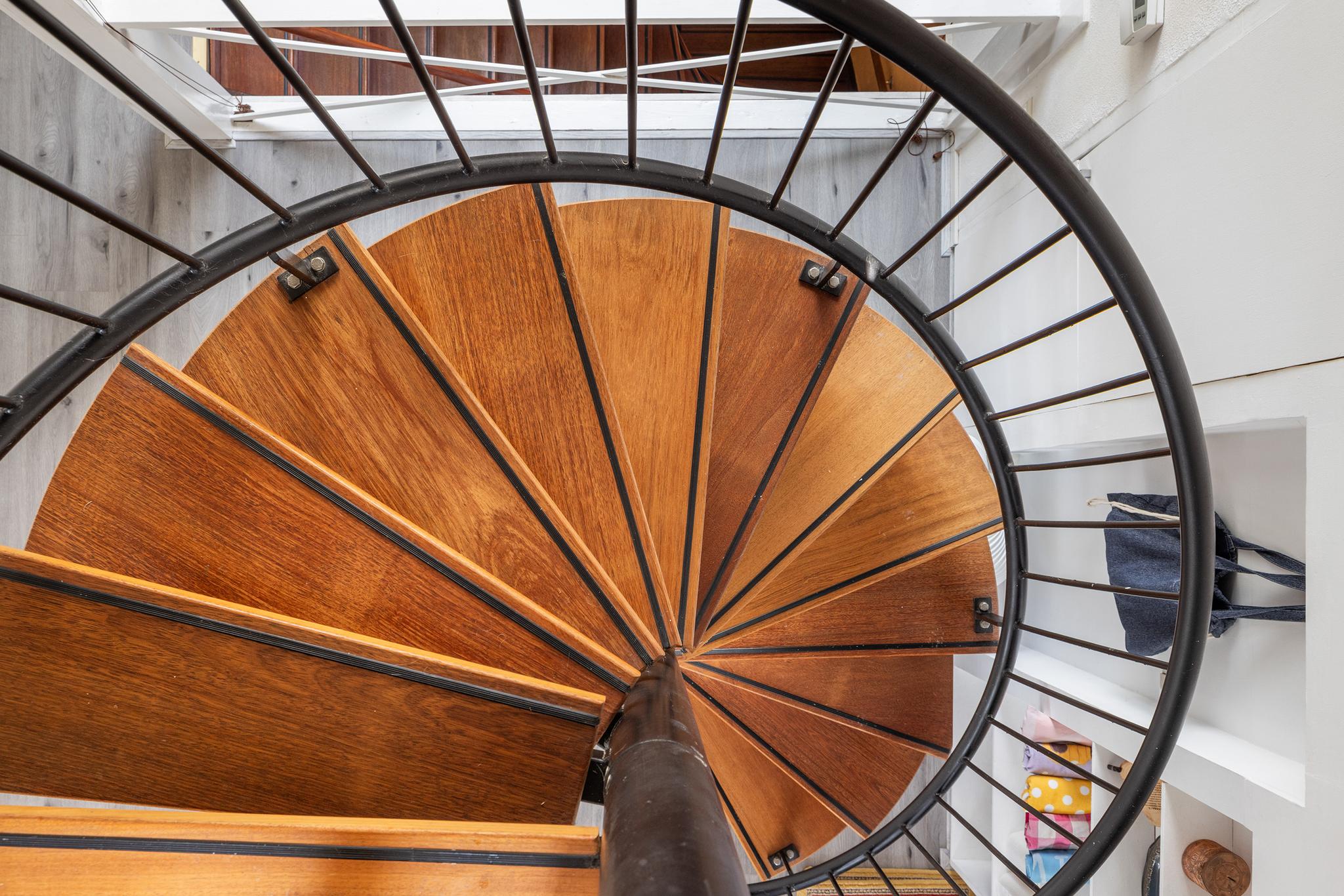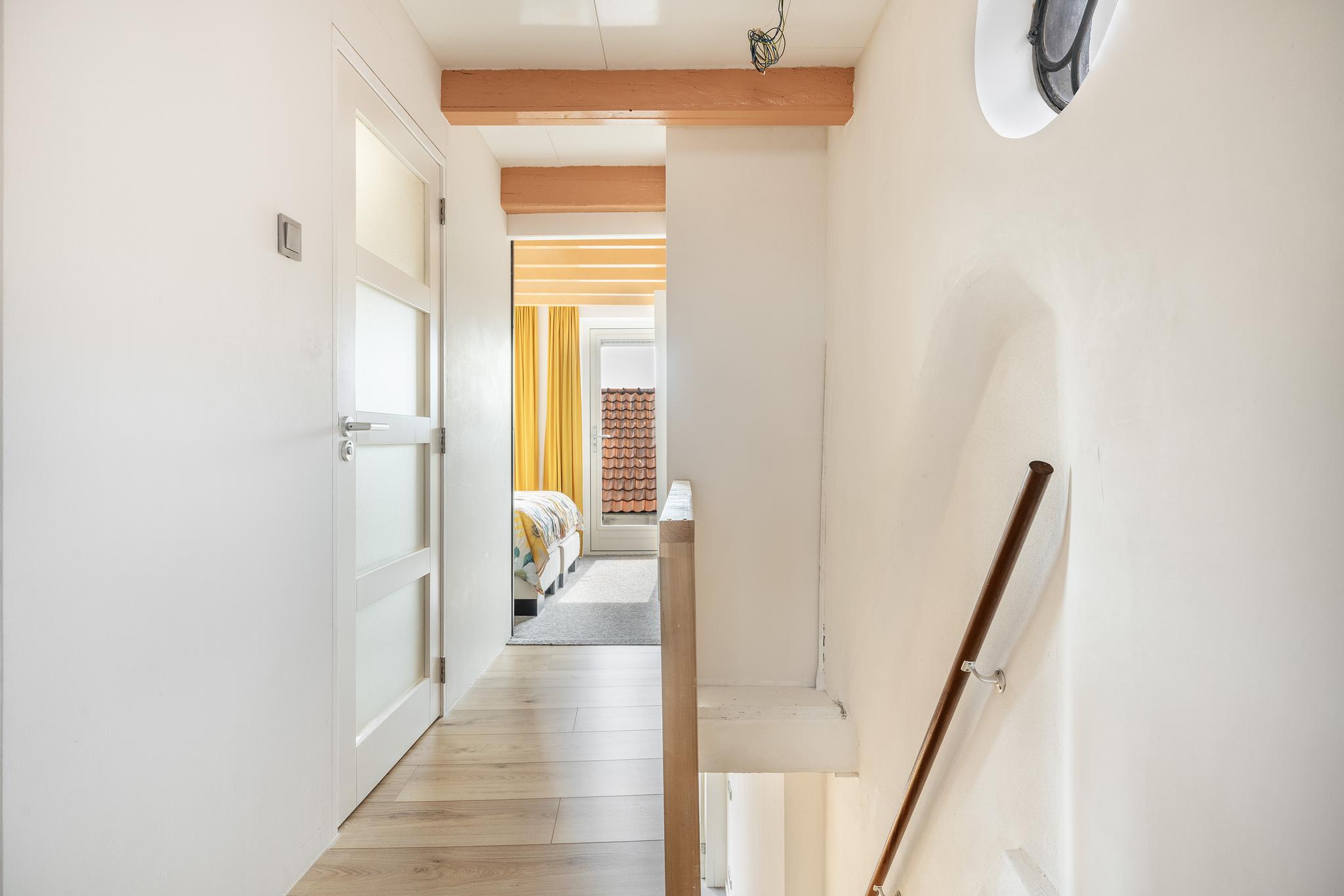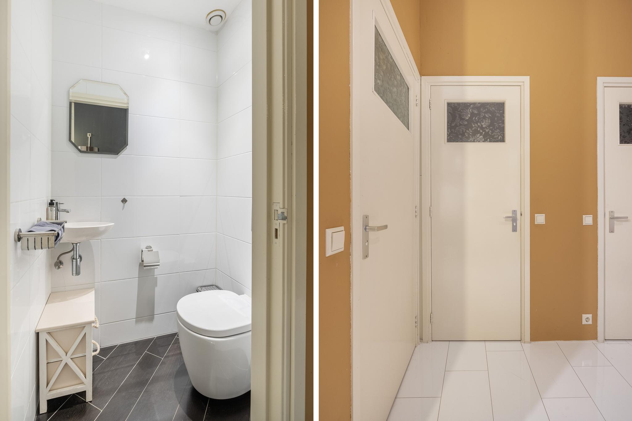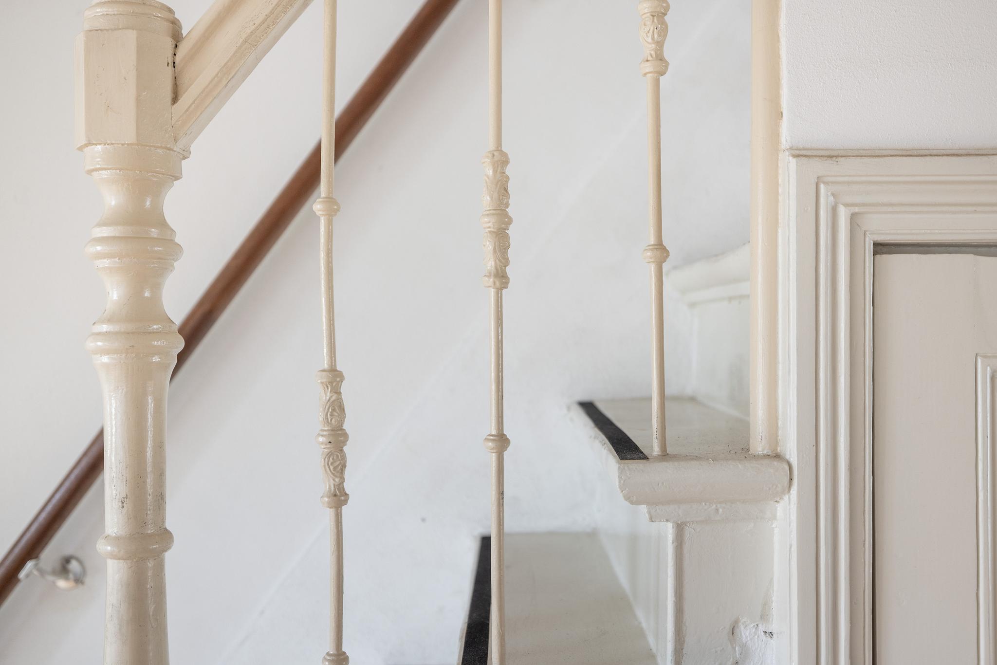 Overloop met toiletruimte, wasaansluiting en trap naar 3e verdieping. Vanaf de overloop zijn bijzondere elementen waarneembaar, zoals een rond stalen stalraam met bloemmotief en gewelven waarvan het bouwjaar niet is achterhaald.