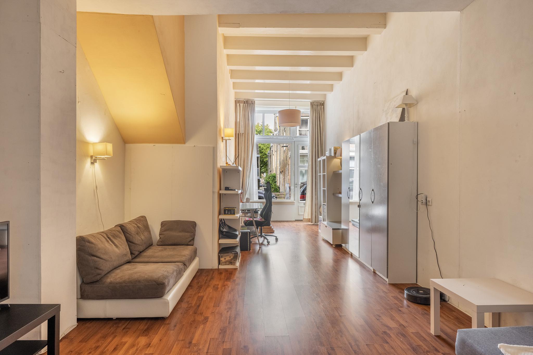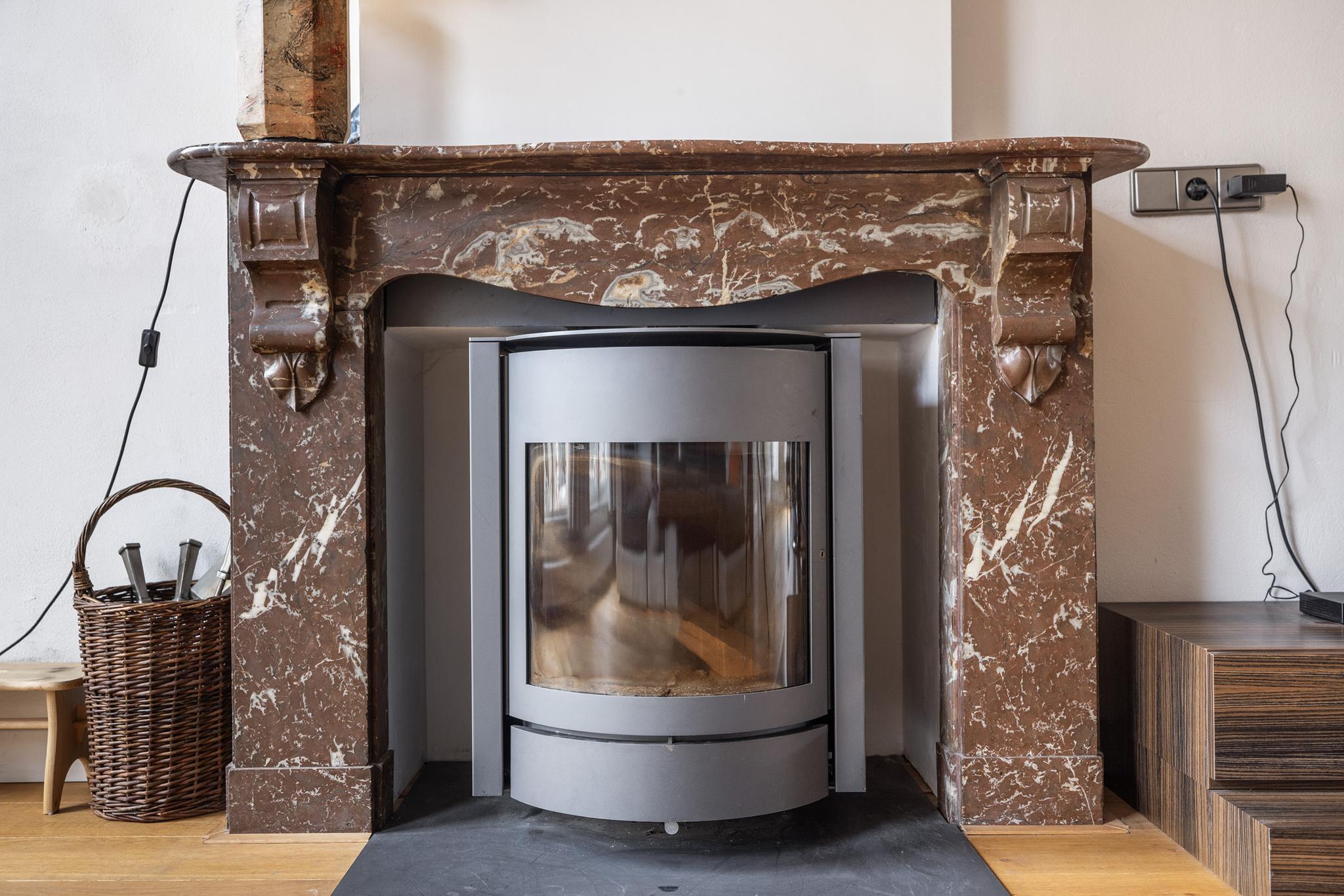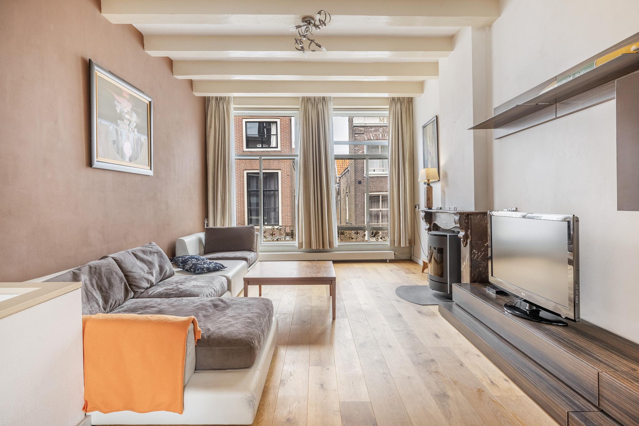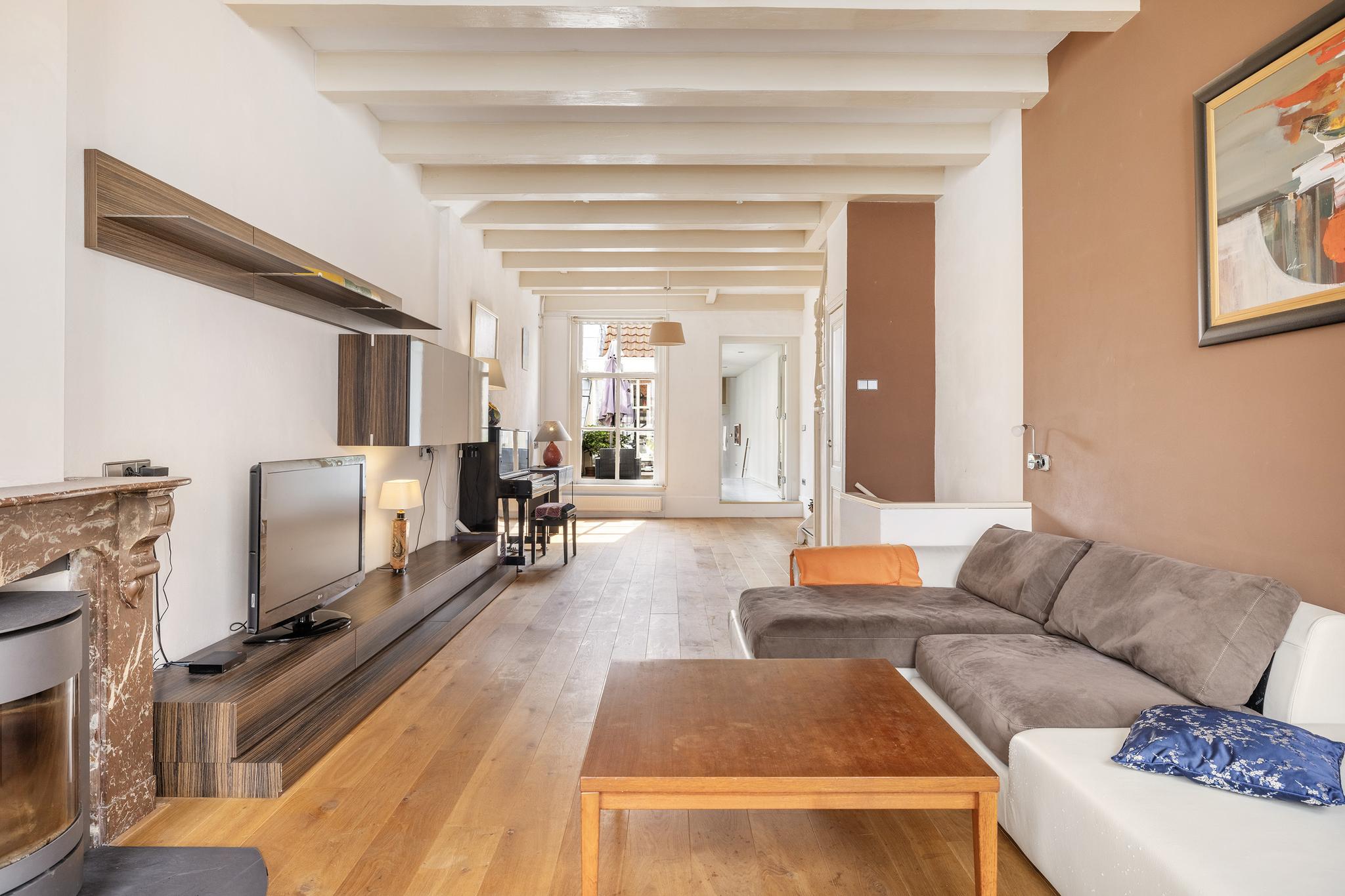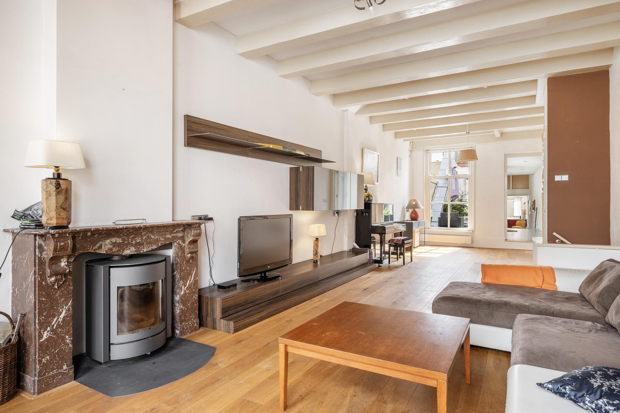 Ruime woonkamer aan voorzijde, voorzien van mooi balkenplafond, een eiken parketvloer, natuurstenen schouw met draaibare houtkachel, trapkast. De hijsramen aan voorzijde zijn voorzien van enkel glas met voorzetglas, aan de buitenzijde zijn de ramen voorzien van monumentale raamhekjes.