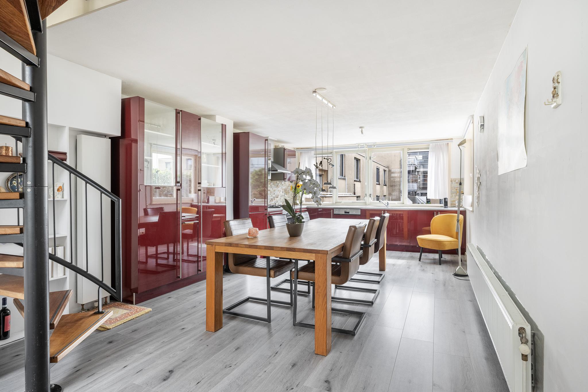 Royale woonruimte met hoog plafond, laminaatvloer, structuurverf wandafwerking en een trapkast. Aan achterzijde toegang tot keukenruimte.