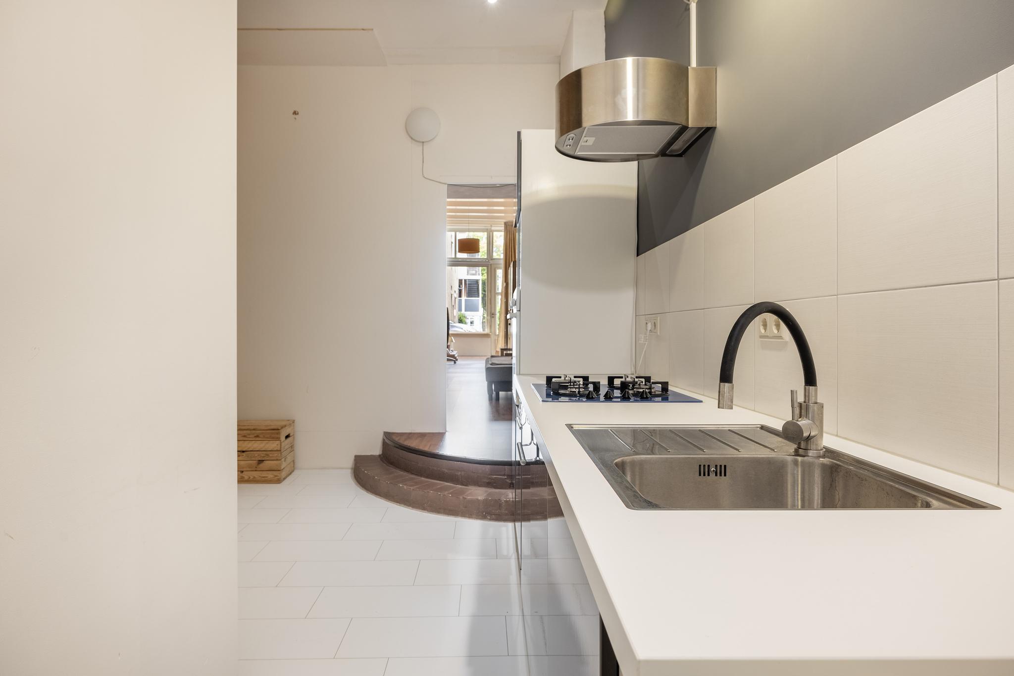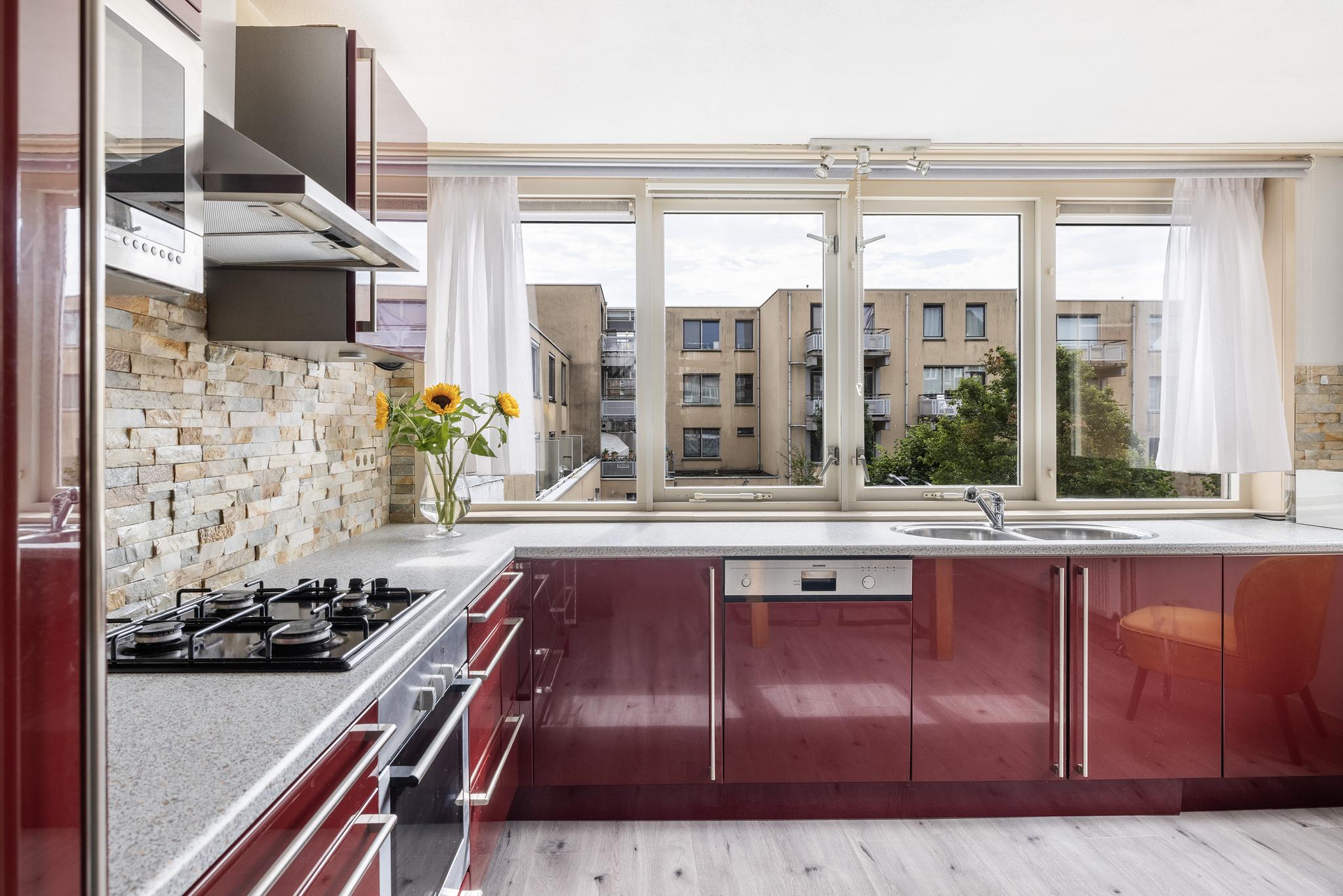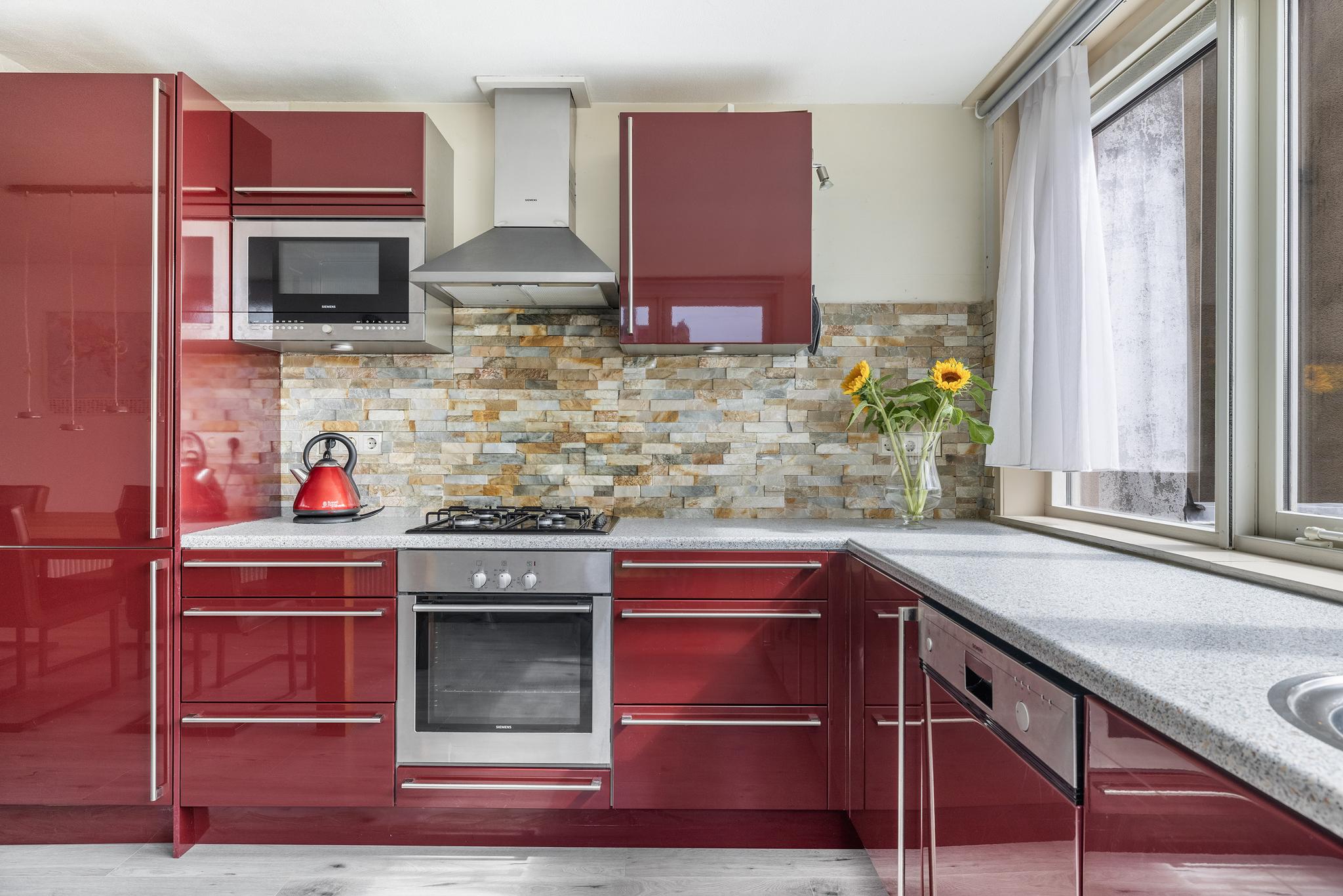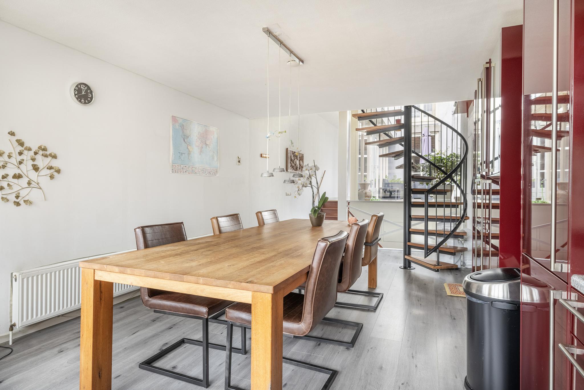 Woonkeuken aan achterzijde met ruime keuken in L-opstelling + kastenmeubel (2007), voorzien van een 4 pit gaskookplaat met afzuigkap, oven, vaatwasser, magnetron, koelkast, vriezer, dubbele spoelbak, apothekerskast, steenstrips wandafwerking en veel bergruimte. Verder beschikt deze ruimte over een designradiator, bergruimte, trap naar de tussenhal bij garage en een spiltrap naar de slaapkamer boven deze woonkeuken.