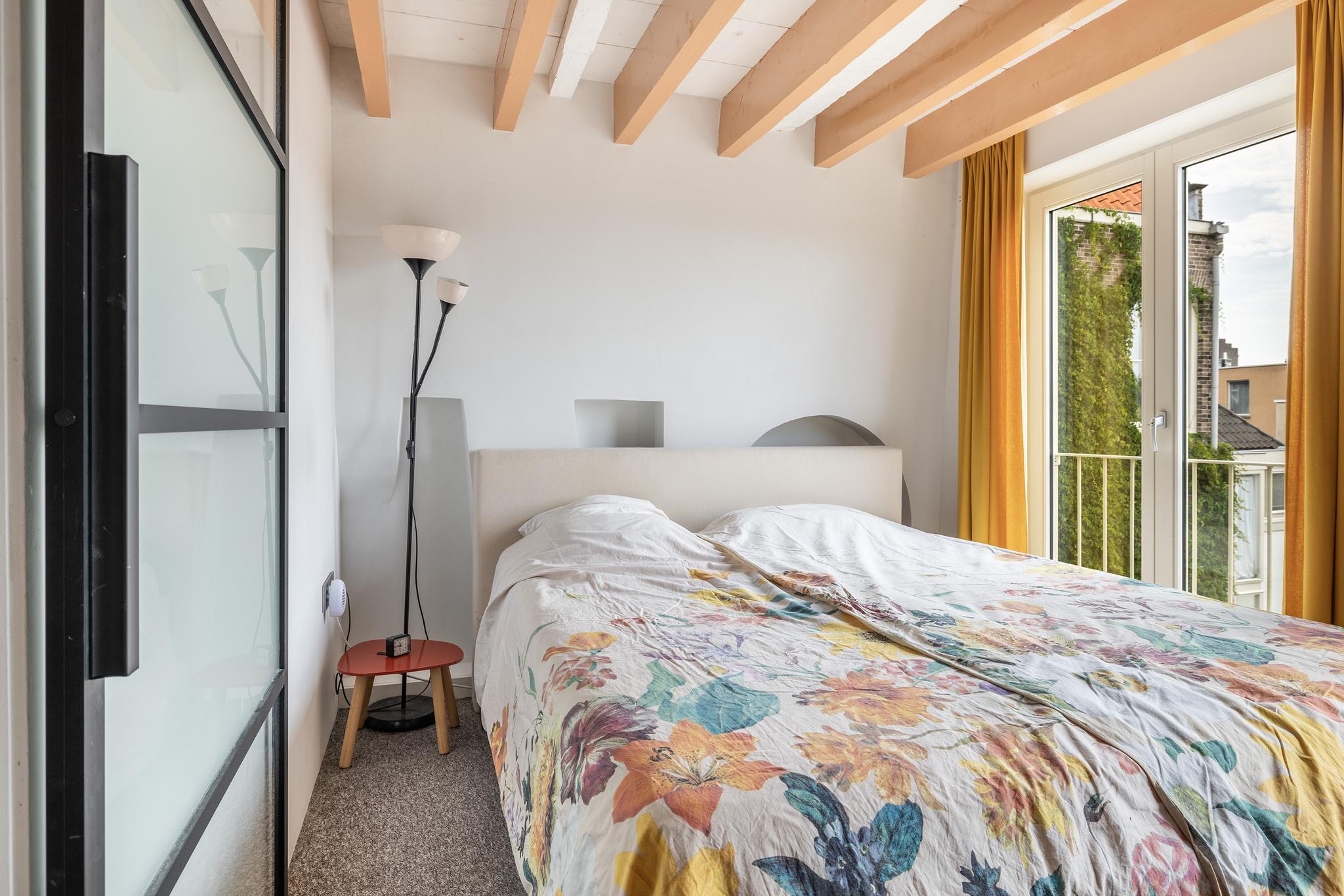 Slaapkamer aan achterzijde, voorzien van vloerbedekking, schuifdeur, frans balkon met dubbele deuren en een loopdeur.
