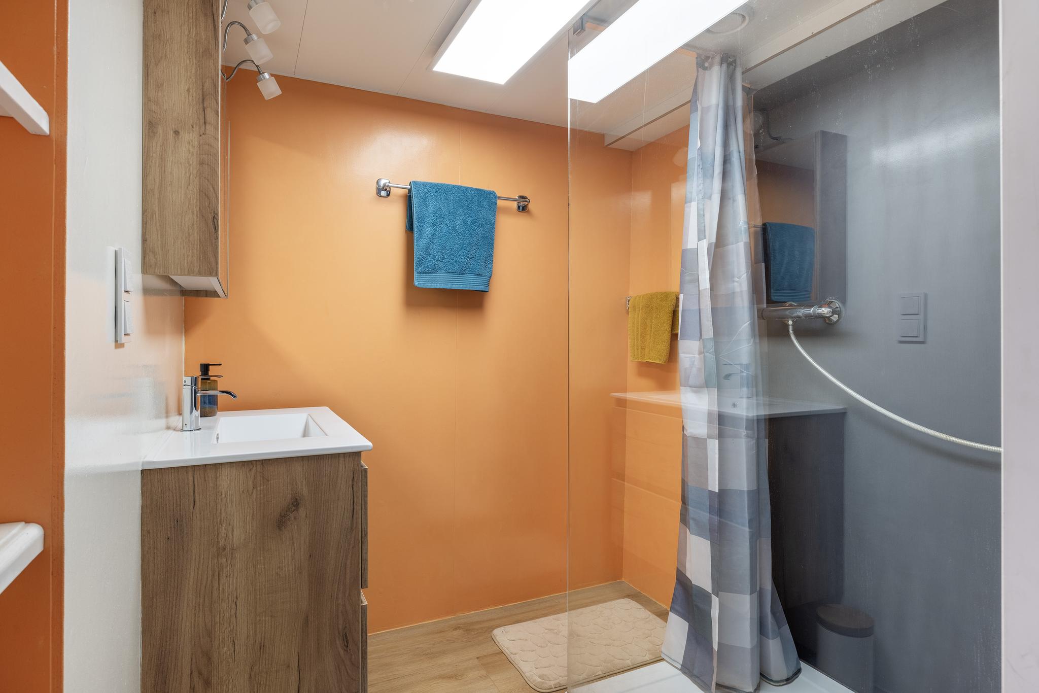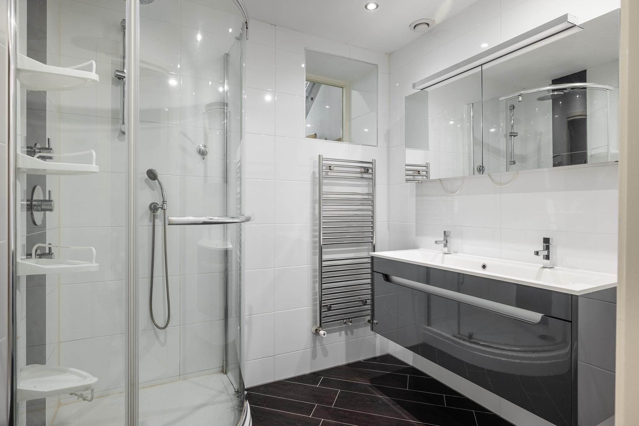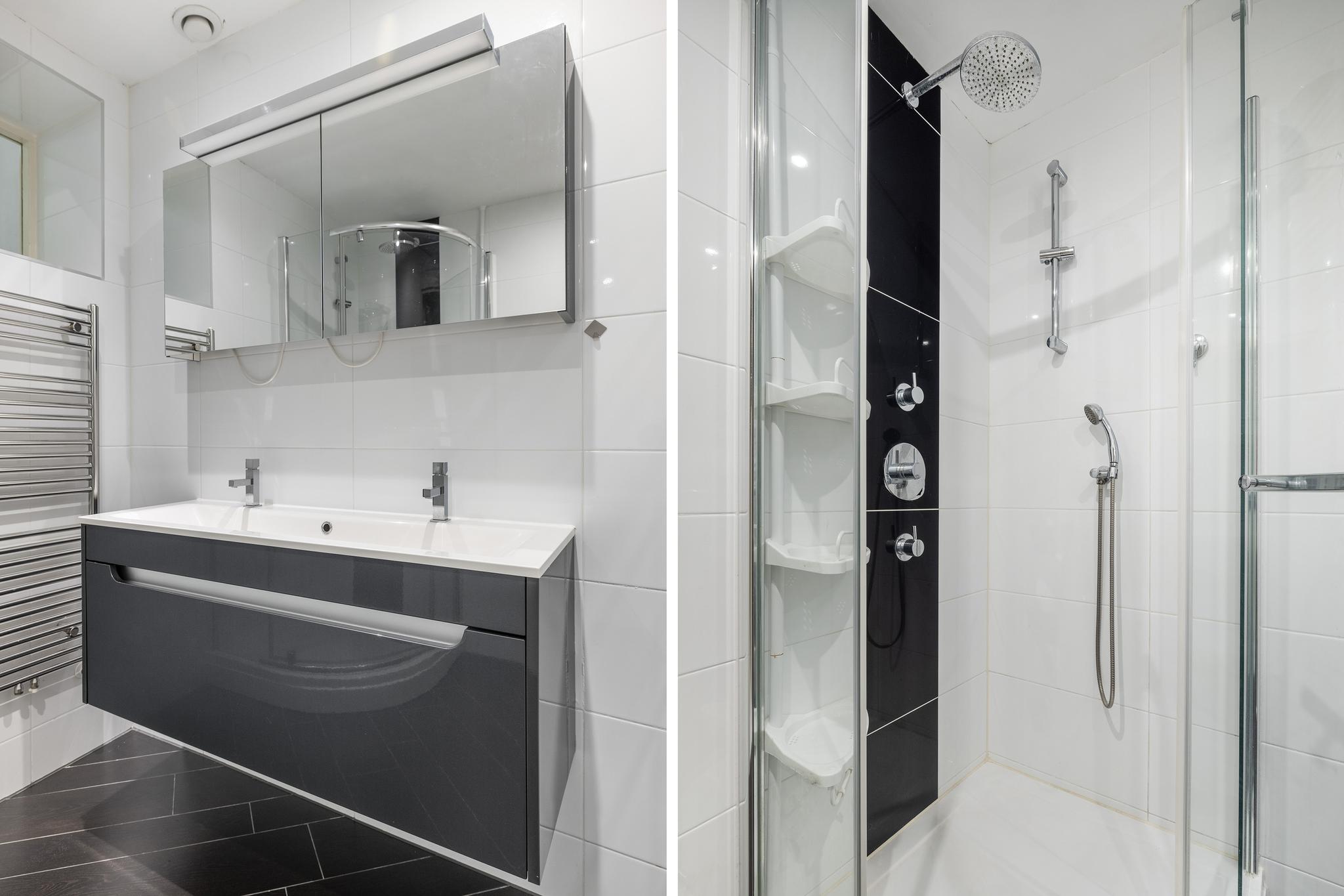 Badkamer (volledig betegeld), brede wastafel met dubbele kraan, douchecabine met inbouwkraan, designradiator en mechanische ventilatie