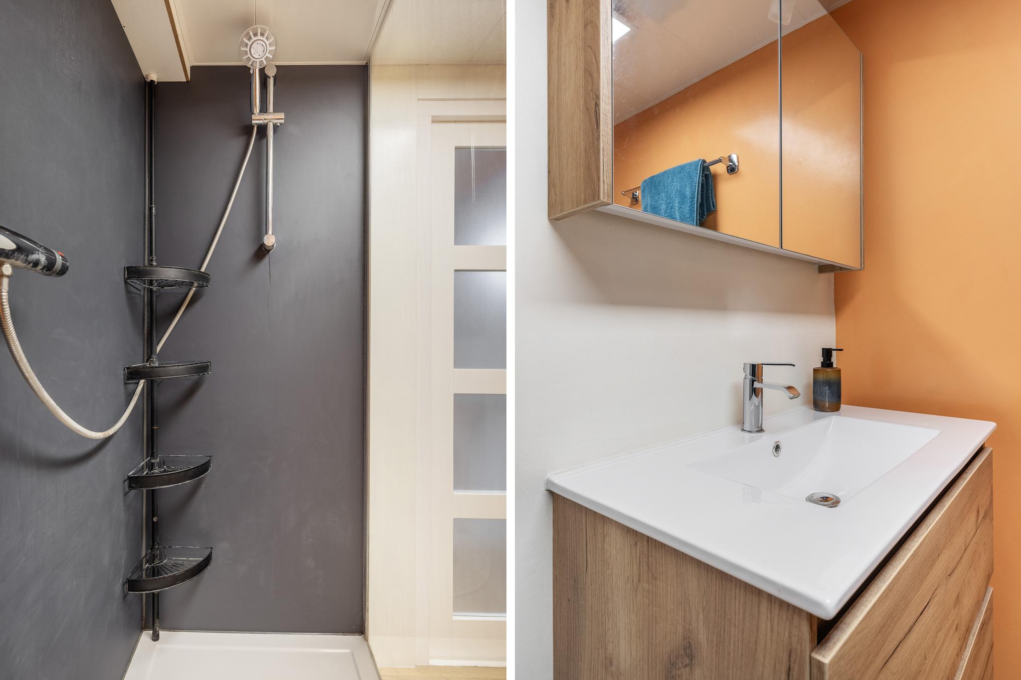 Badkamer met wastafelmeubel, spiegelkast, inloopdouche met thermostaatkraan.