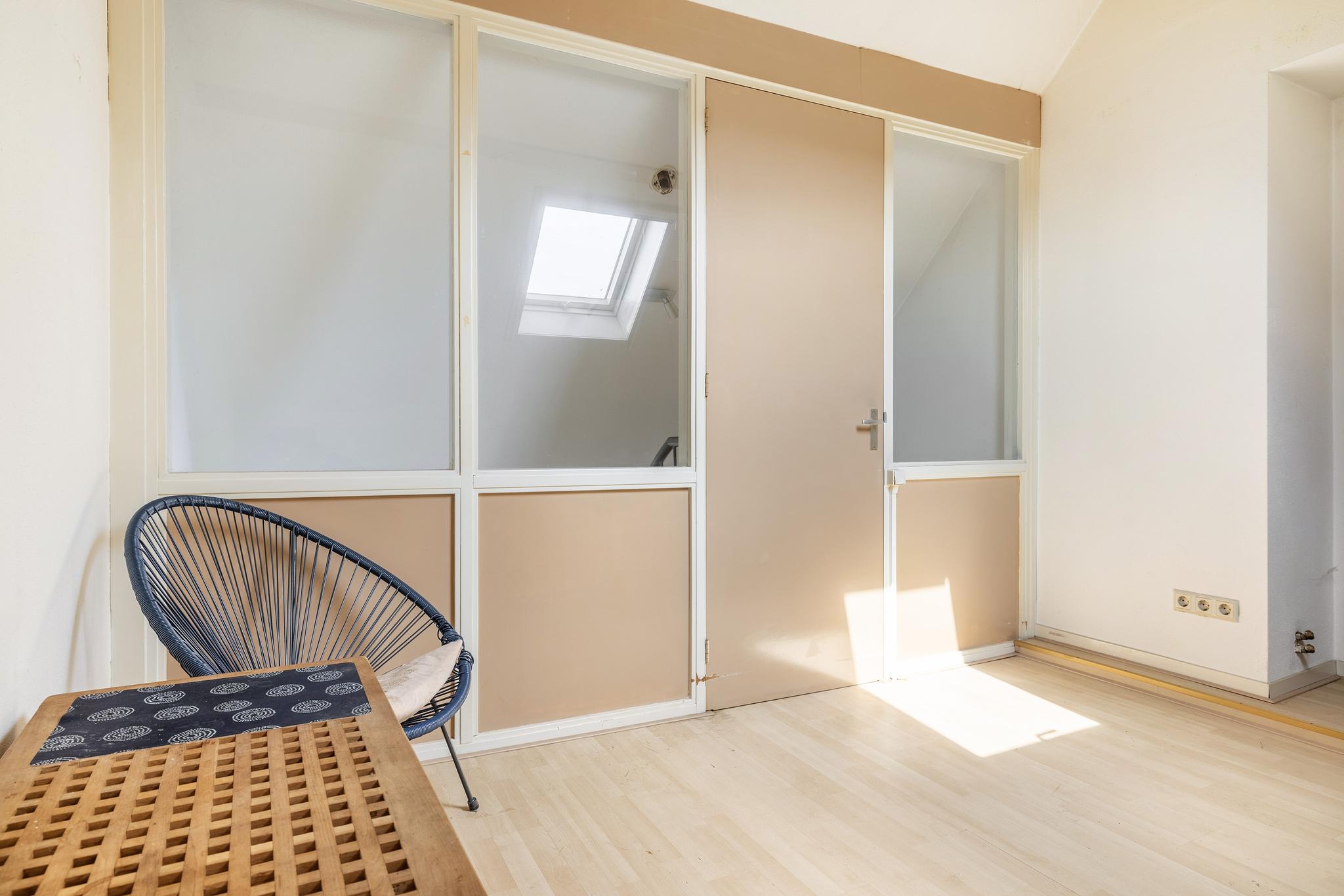 Slaapkamer boven woonkeuken, voorzien van een laminaatvloer en kunststof dakraam.