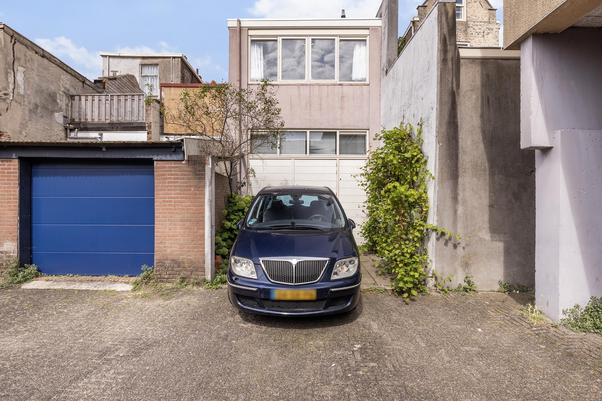 Enorme inpandige garage waar met gemak twee auto's kunnen worden gestald. Aan achterzijde ontsluit de garage op de Van der Kooghplaats en Nieuwekerkstraat. De garage is voorzien van een trapkast, dubbele deuren + loopdeur naar buiten en een betonvloer. De garage biedt tevens monumentale elementen als een oude schouw en een houten plafond met bijzondere tekeningen. In de garage bevindt zich de opstelplaats CV-ketel (Remeha, 2016), deze dient voor de begane grond verdieping en de woonkeuken op de 1e verdieping. Daarnaast is een grote bergvliering bereikbaar die zich boven de woonruimte op de begane grond bevindt.