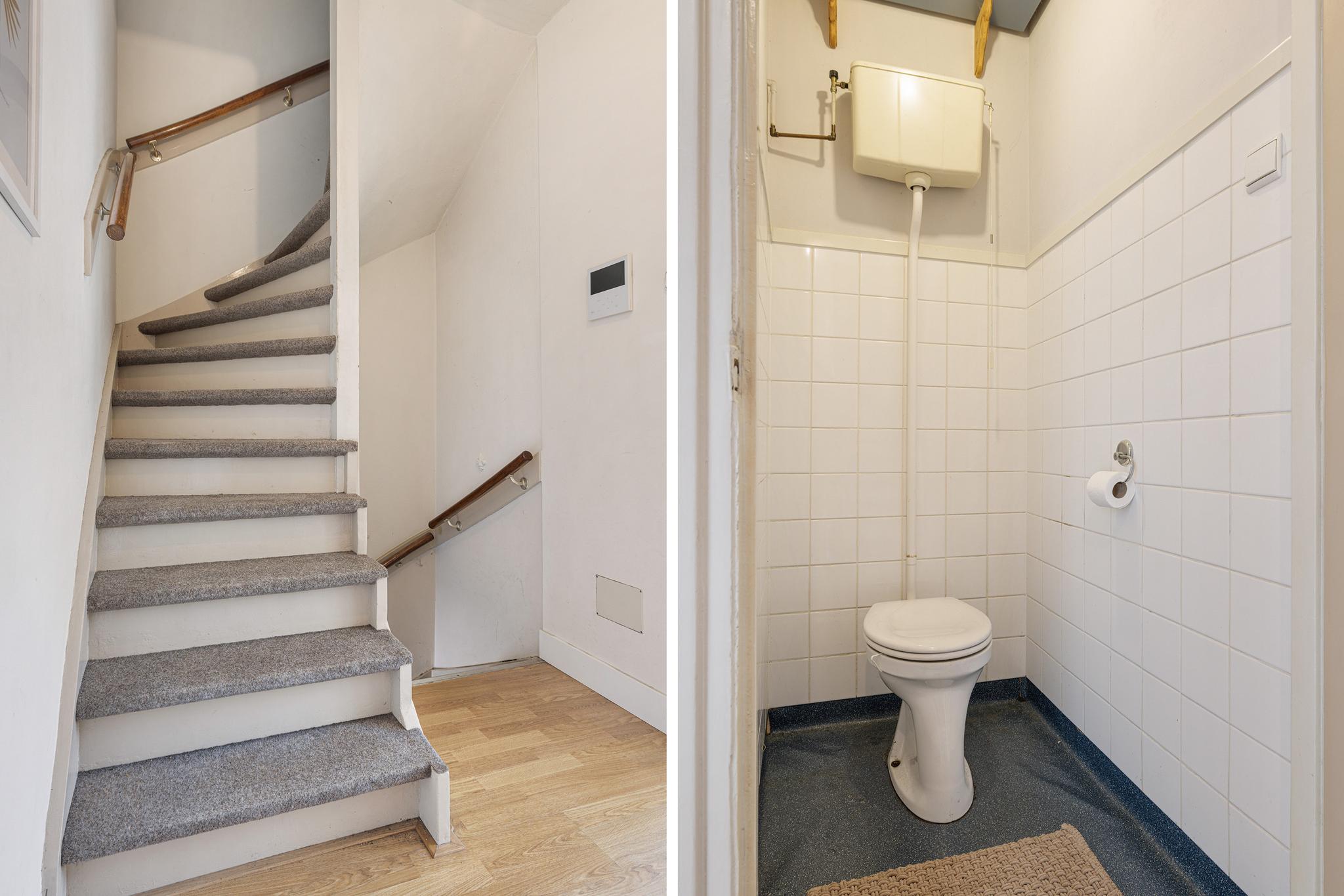 Hal met trap opgang naar de tweede verdieping, ruimte voor de garderobe en toilet.