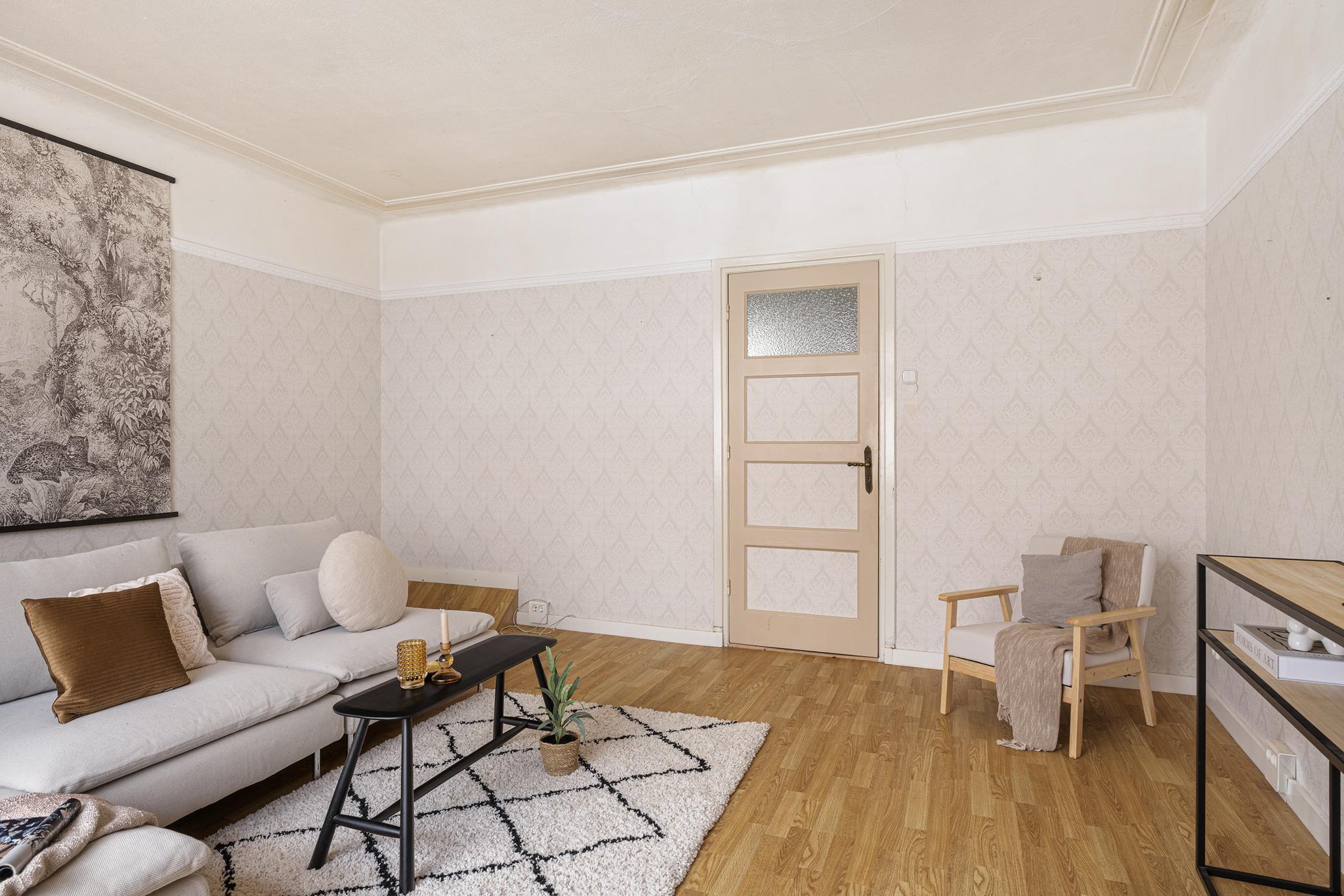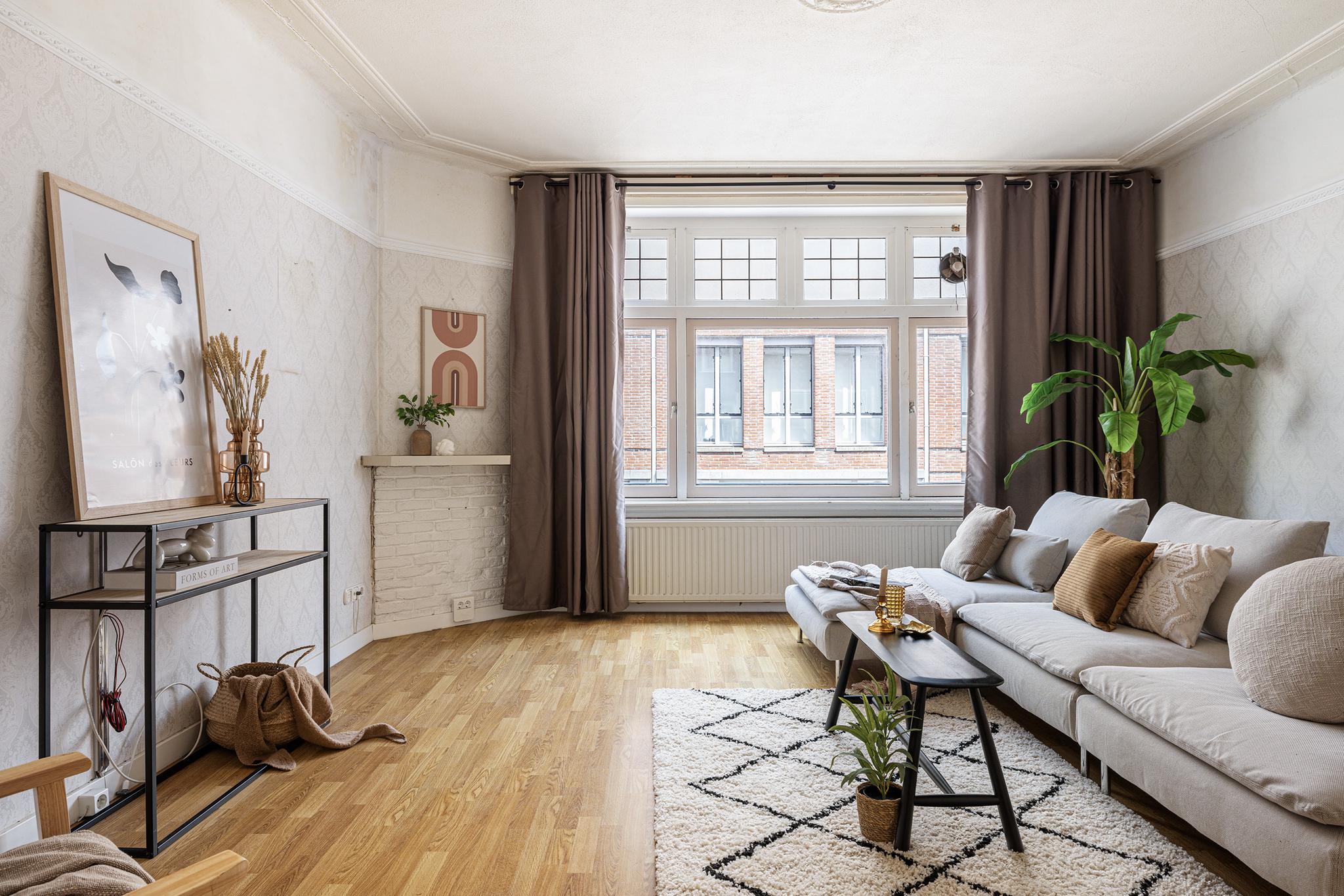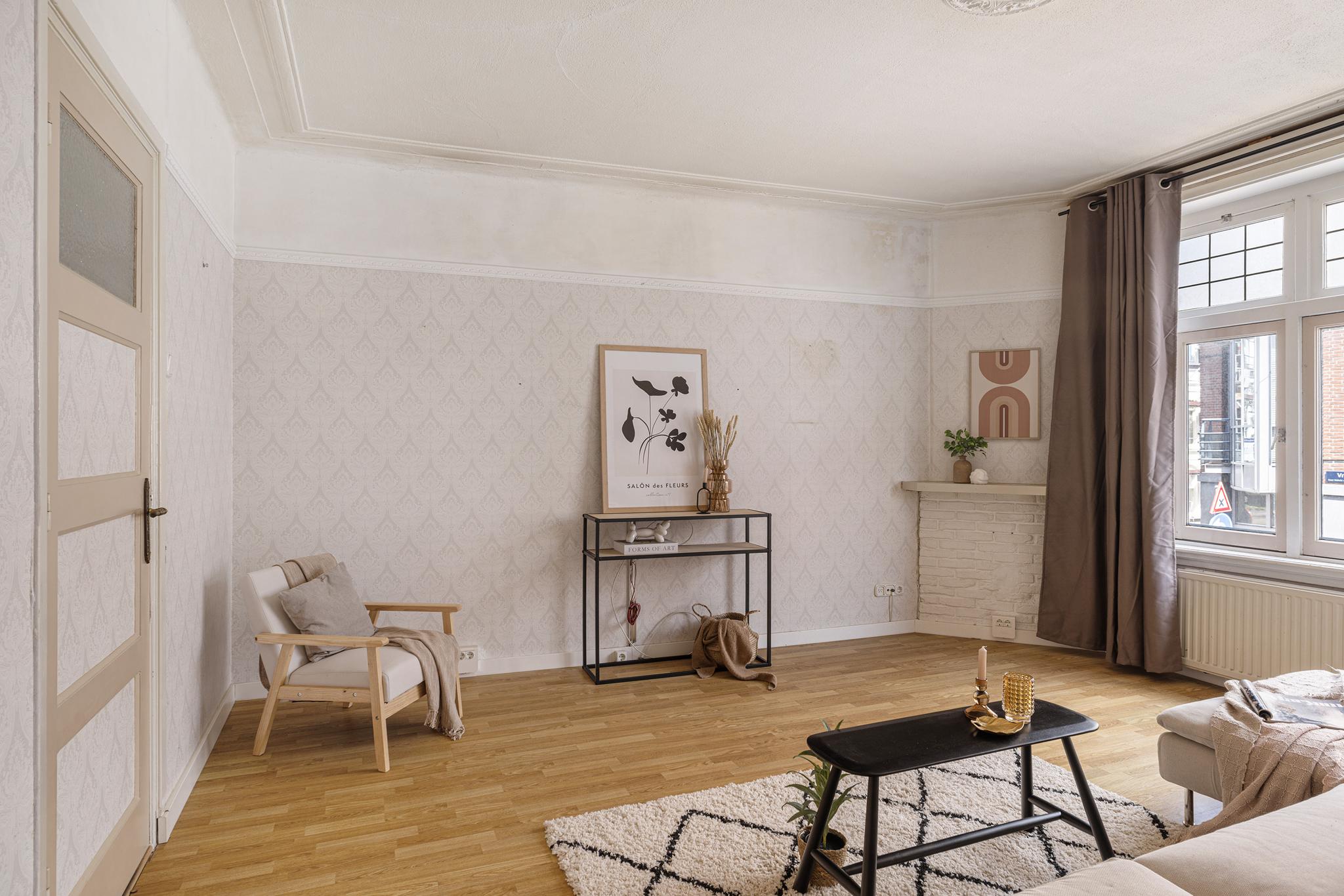 Woonkamer aan de straatzijde met laminaatvloer, behang wanden en houten kozijnen met dubbel glas.