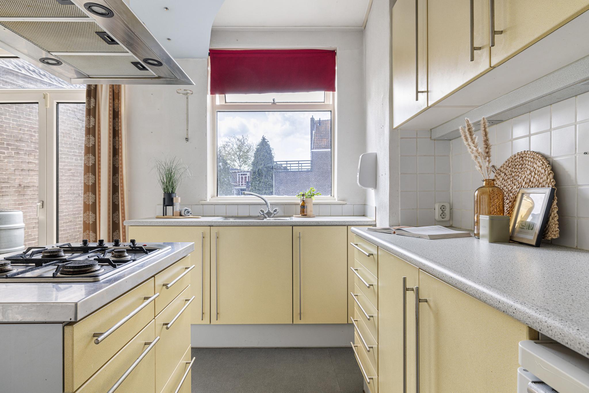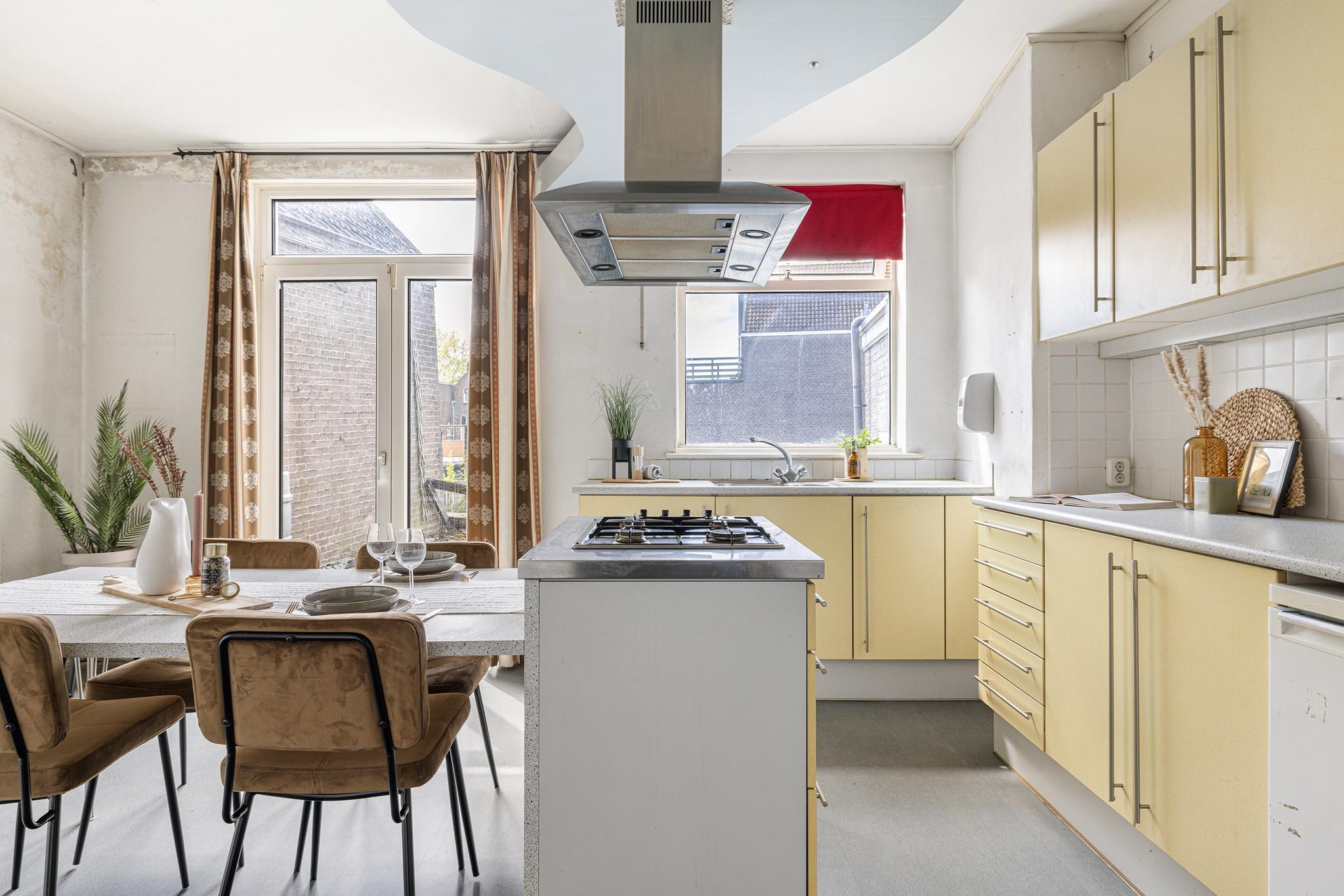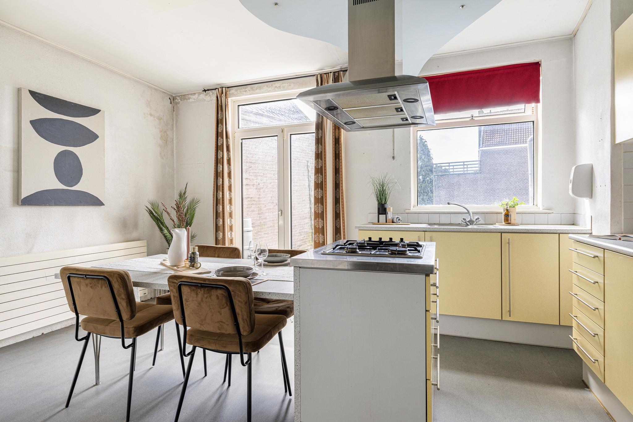 Keuken aan de achterzijde, deze is heerlijk ruim met openslaande deuren naar een mogelijk dakterras. Keuken met oven, losse koelkast, 1,5 spoelbak, kookeiland met vier pits gaskookplaat, RVS schouw en aan grenzende vaste tafel. De kozijnen zijn hier deels hout, deels kunststof met dubbelglas.