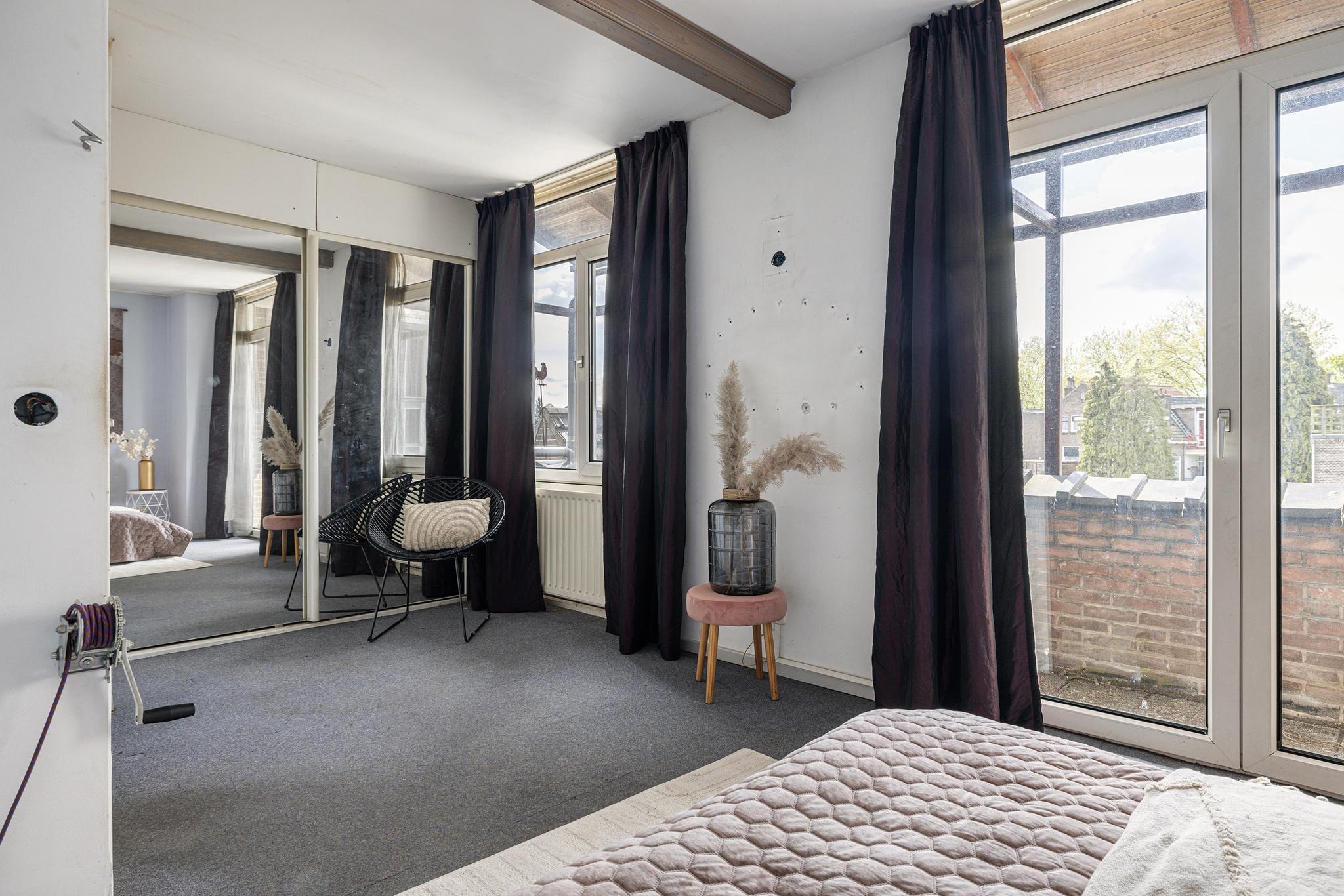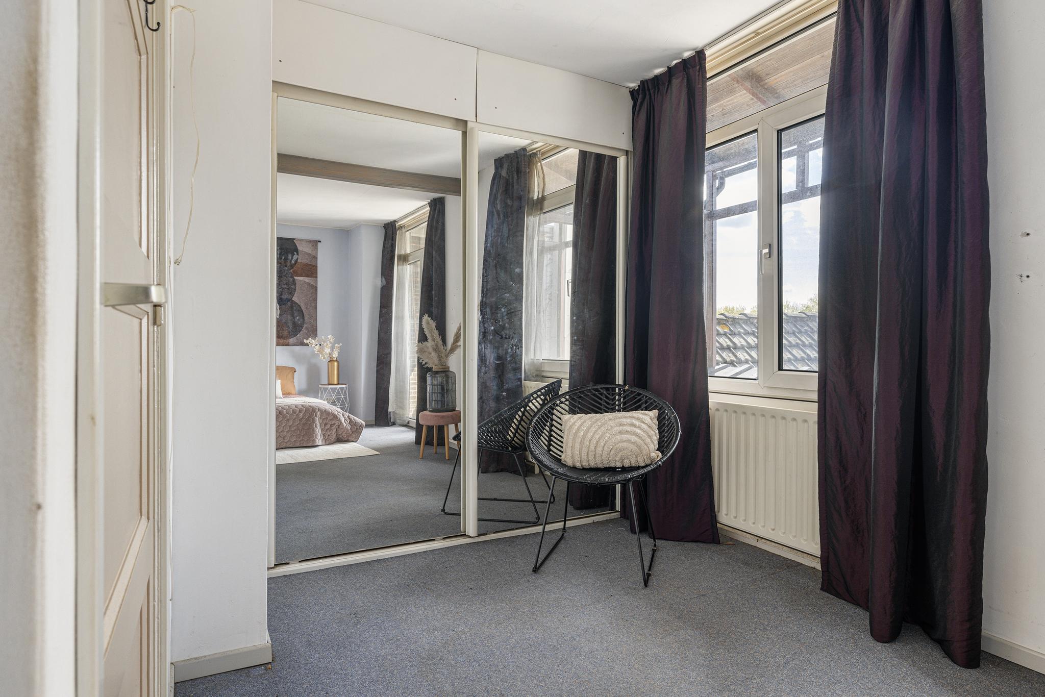 Slaapkamer 1 aan de voorzijde, houten kozijnen met enkel glas en vaste kasten.