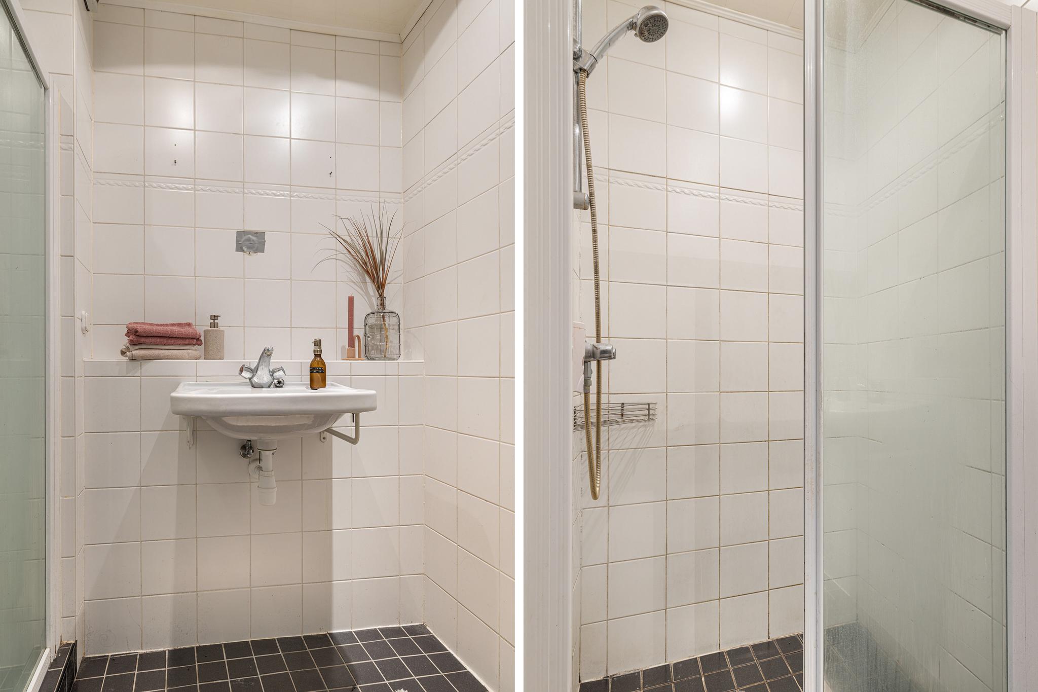 Inpandige badkamer met wastafel en douche, geheel betegeld.