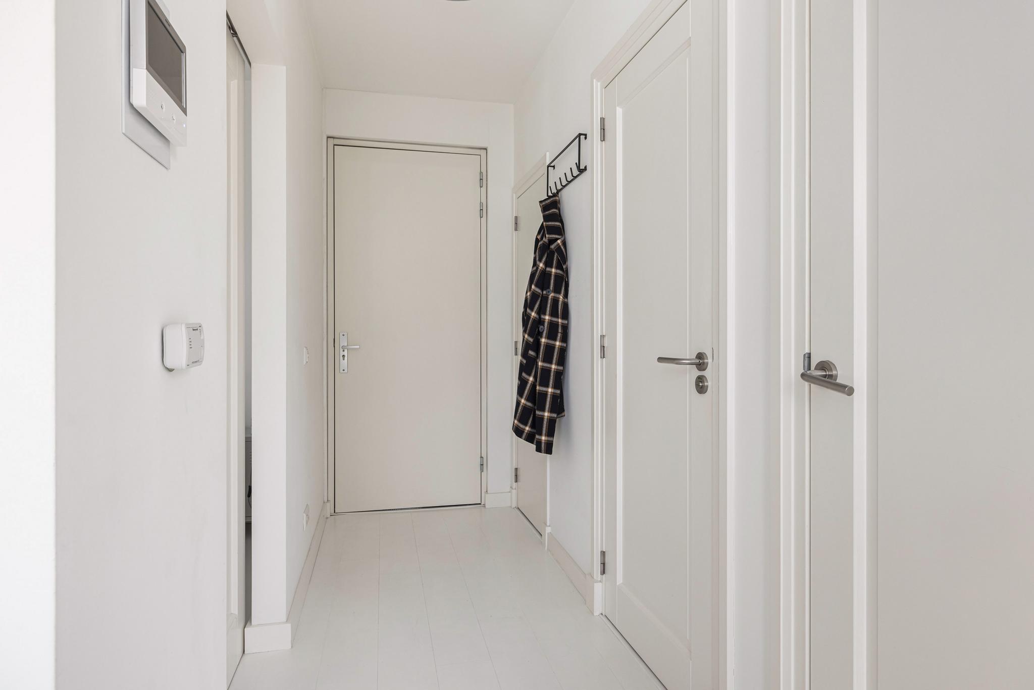 Je loopt de woning binnen in een ruime hal met toegang tot alle vertrekken en intercom met videofoon. Het licht, de strakke afwerking en de hoge plafonds vallen direct op.