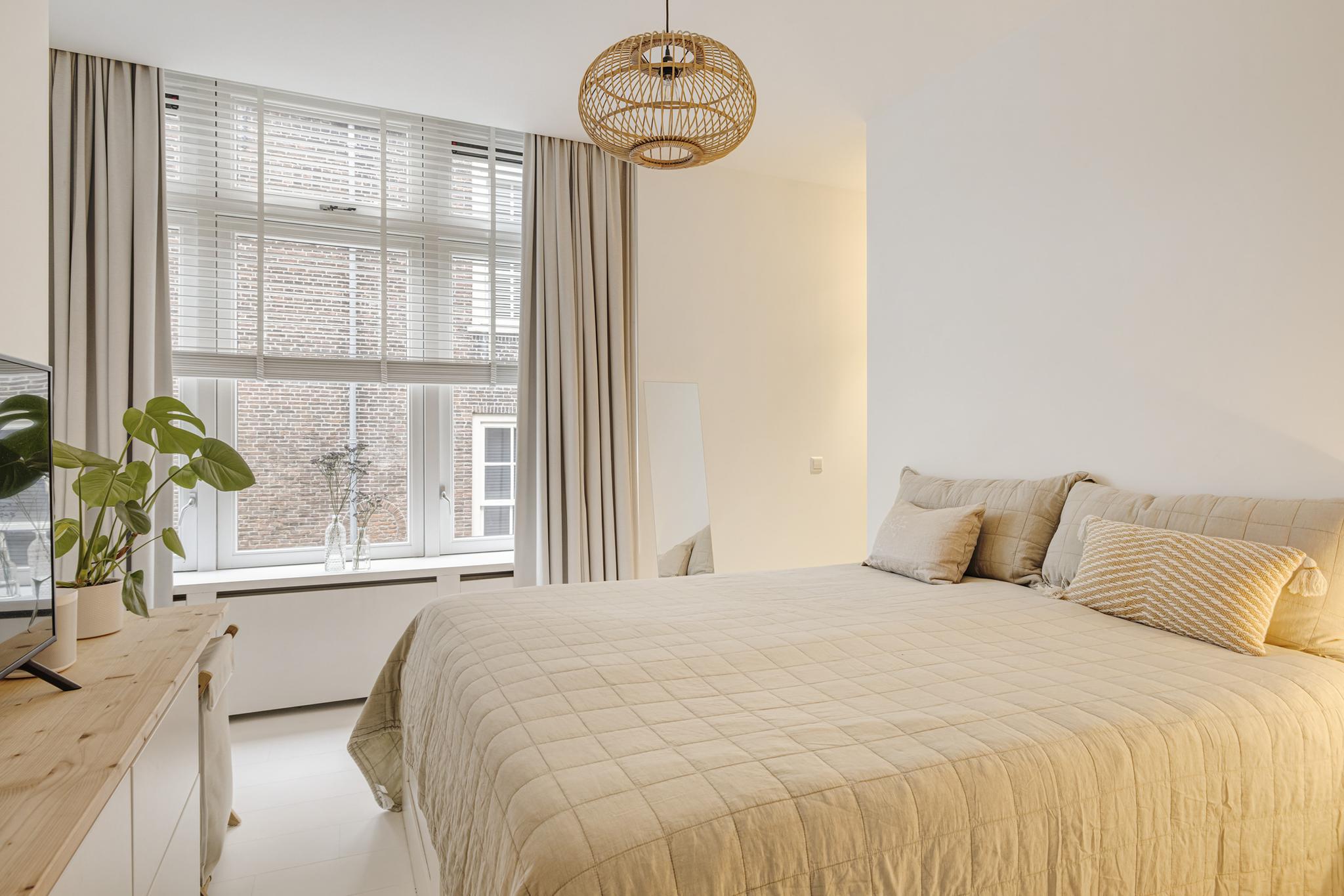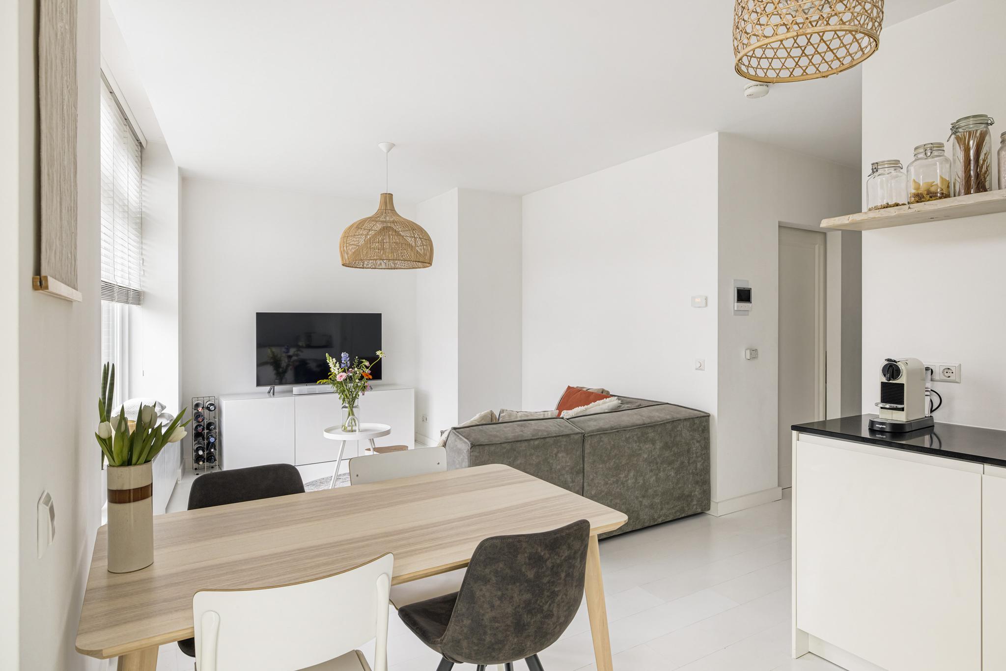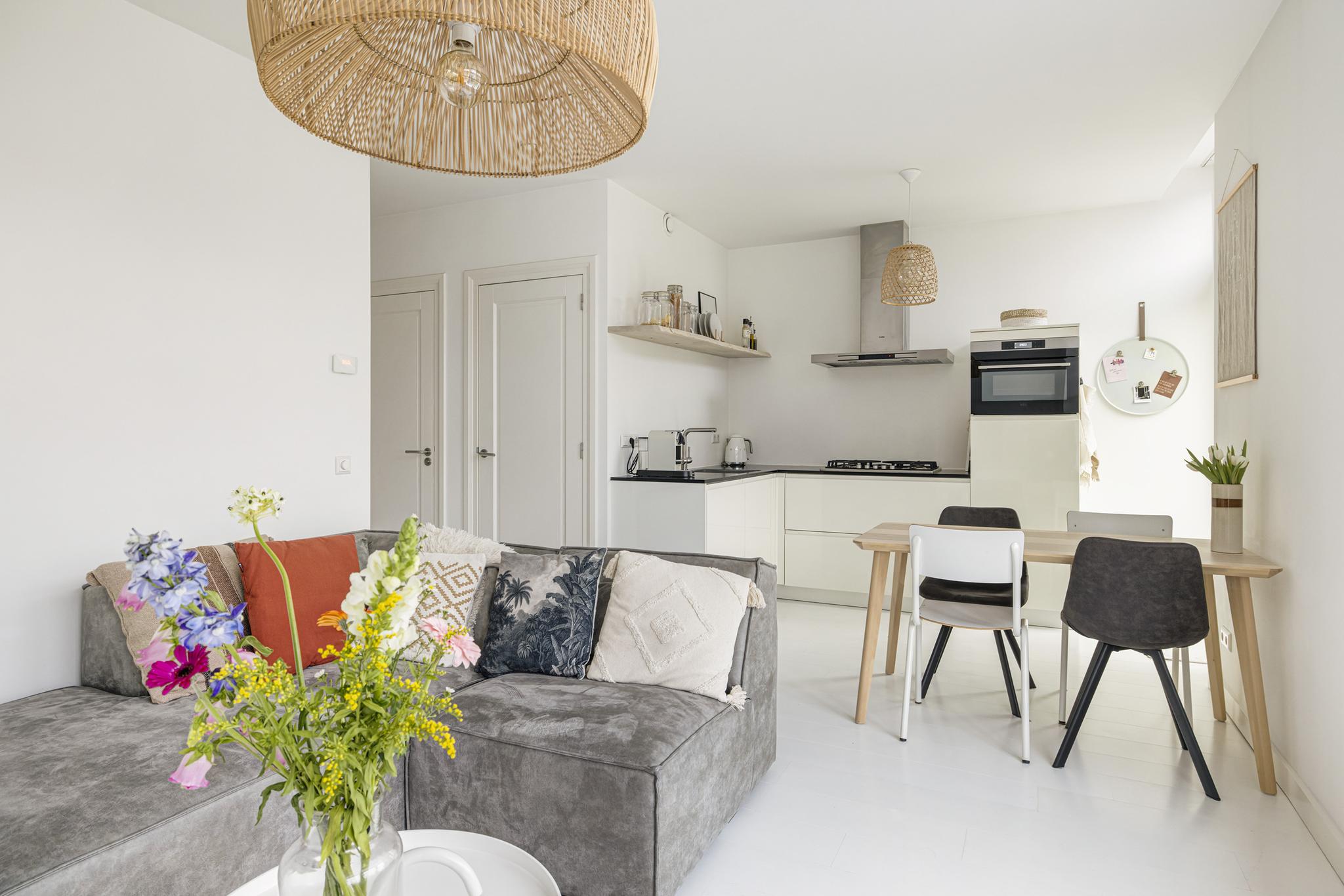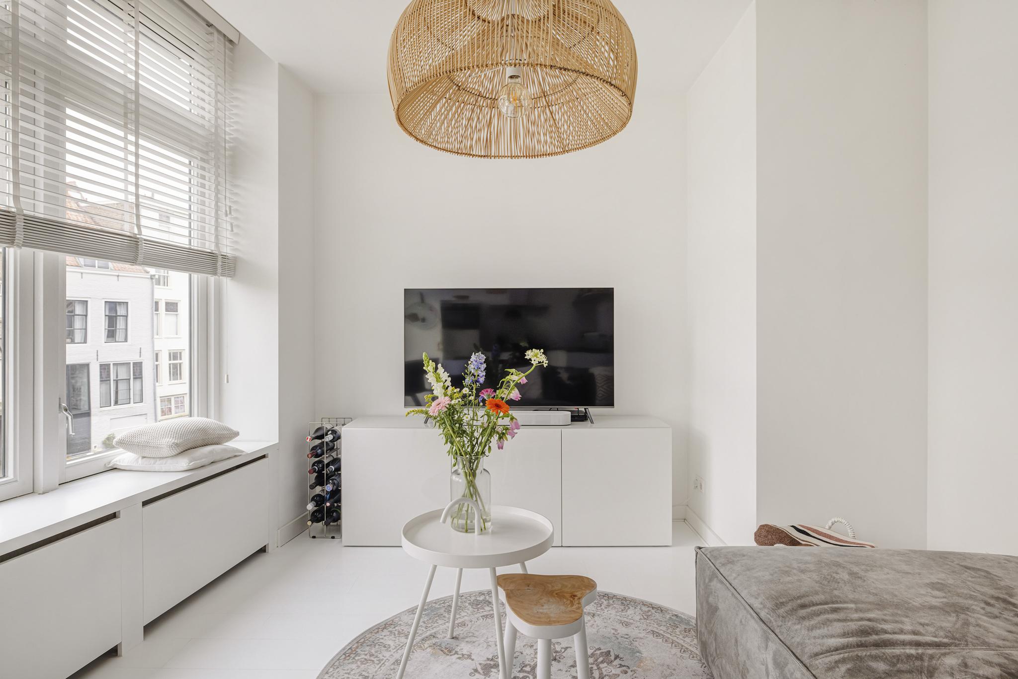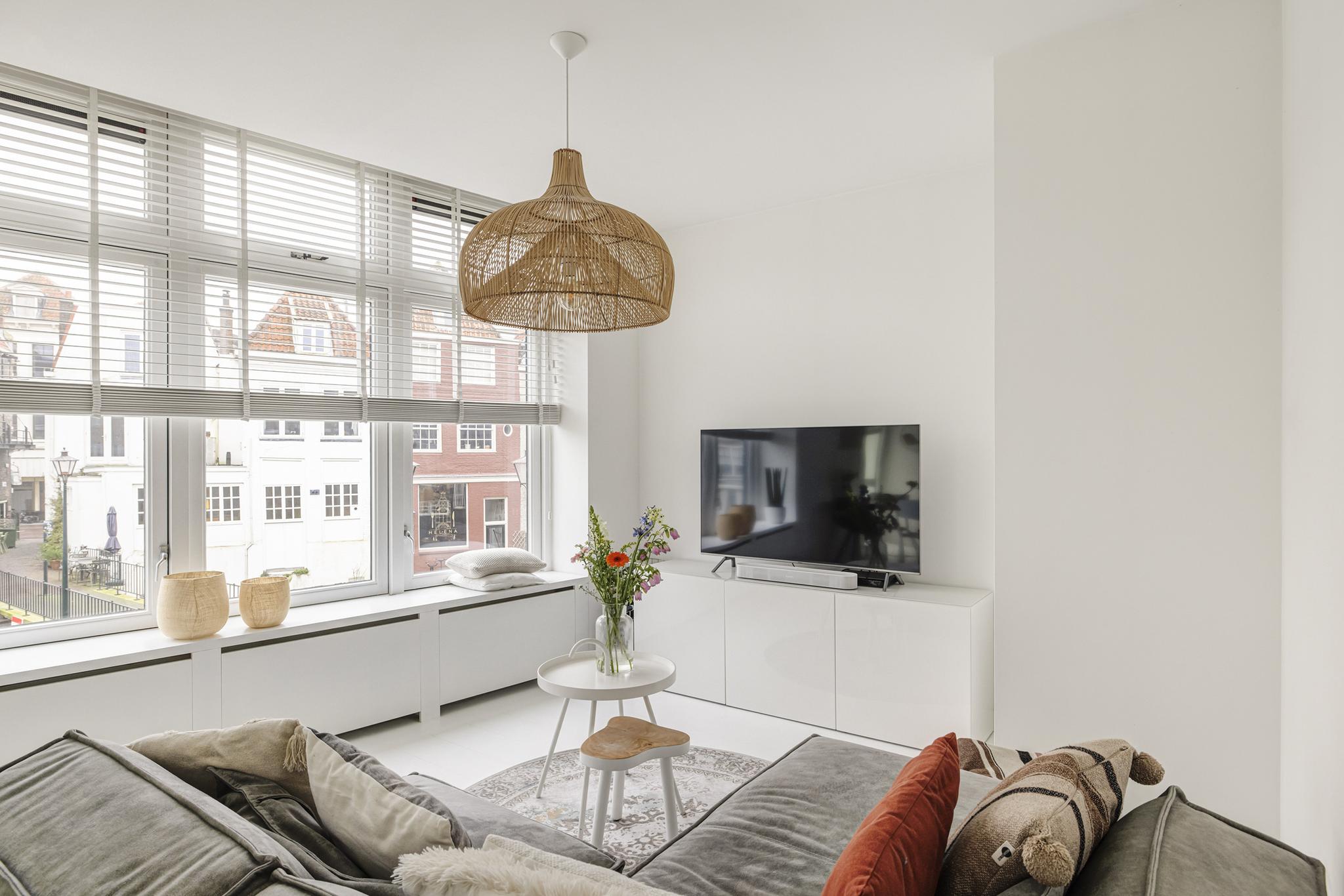 Keurige stucwanden, deur naar het ruime balkon en mooie brede vensterbanken zodat je ook in de woonkamer heerlijk met een paar kussens en een kop thee van het altijd veranderende uitzicht kunt genieten.