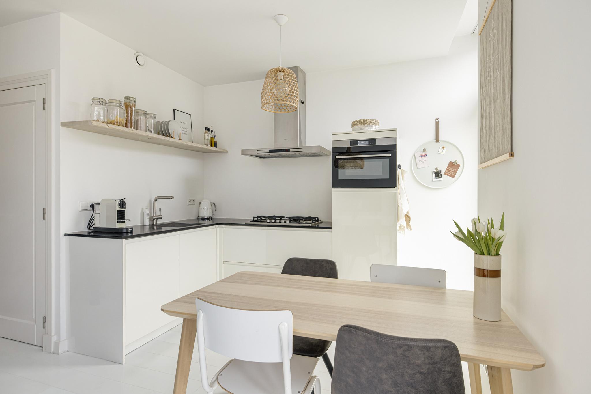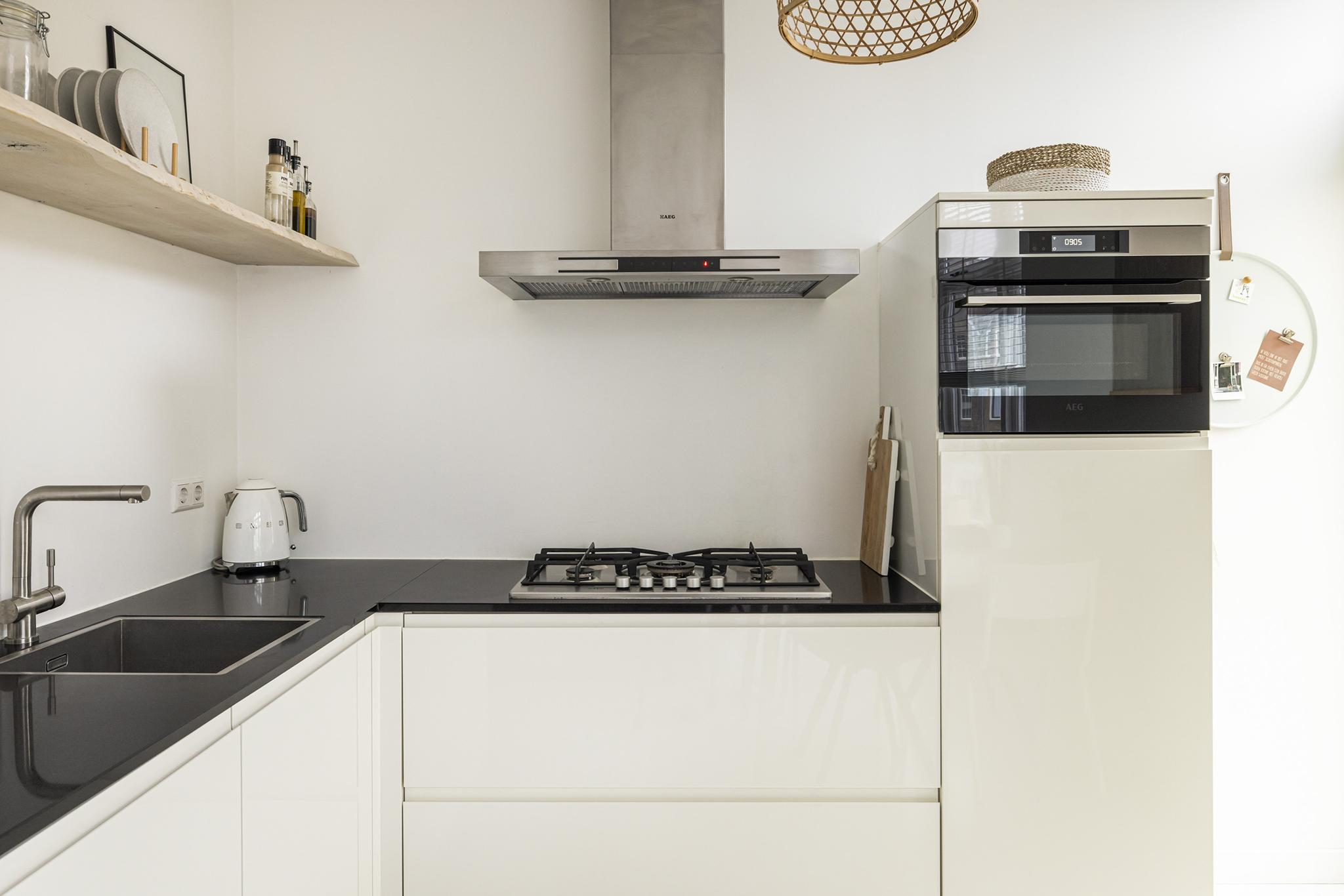 Keuken in moderne hoekopstelling met composiet blad, spoelbak, 5 pits gaskookplaat, oven, koelkast met vriesvak, vaatwasser en rvs schouw. Alle apparatuur is van het merk AEG, de oven is in 2022 vervangen en is zelfs met app te bedienen.