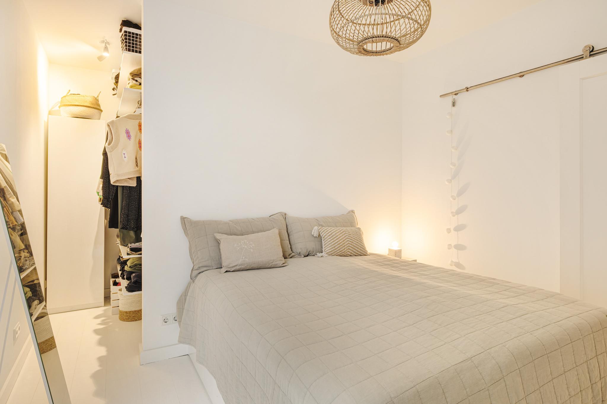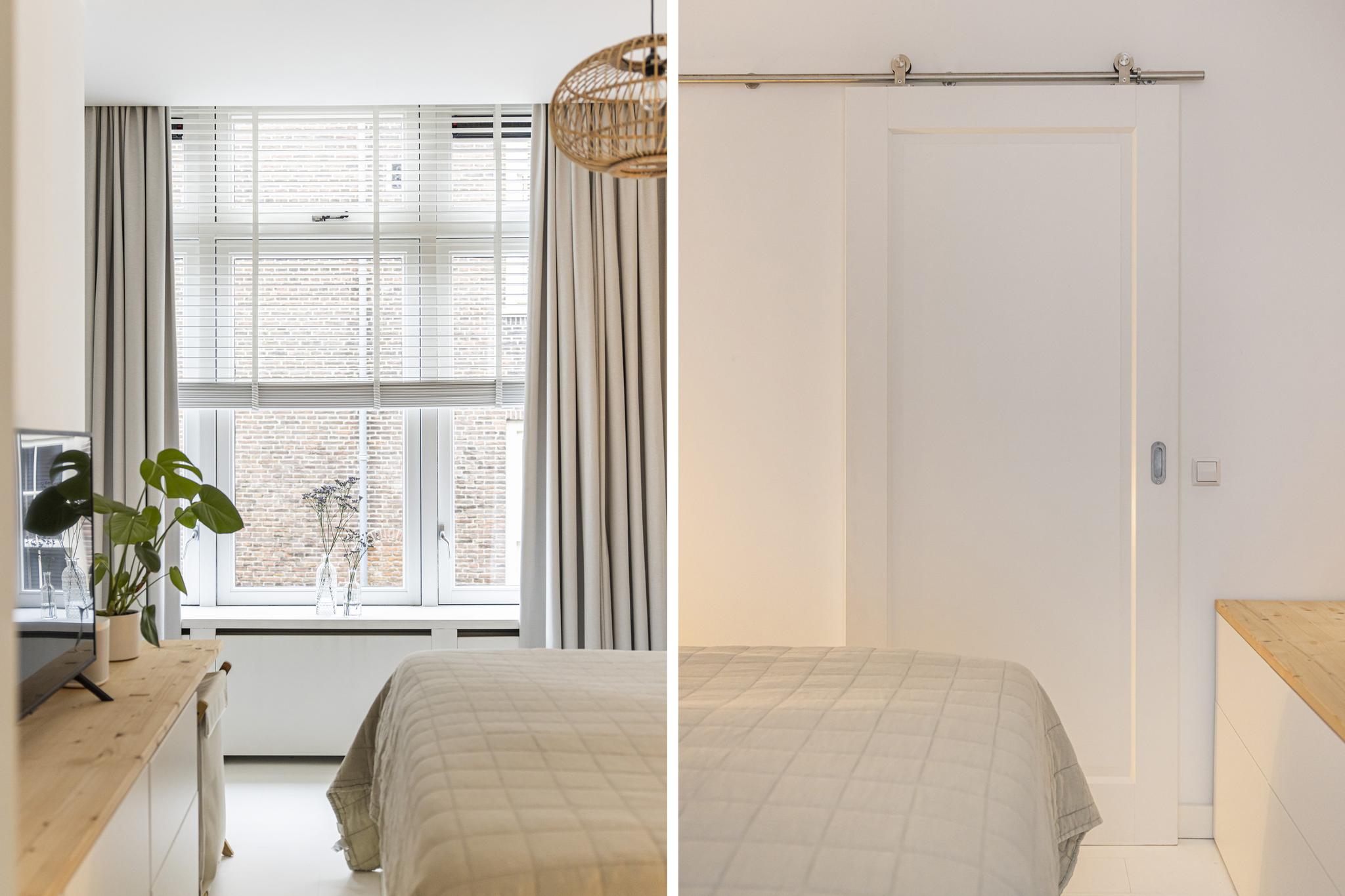 De slaapkamer is voorzien van een schuifdeur, ruimte besparend en een mooie feature tegelijk! De slaapkamer is aan de zijkant van de woning gelegen met een mooie raampartij en een ruimte die in gebruik is als inloopkast. De kamer is slim ingedeeld en ook hier is het stucwerk doorgetrokken.
