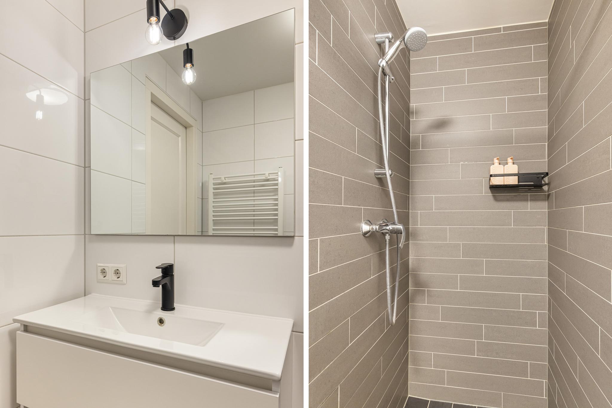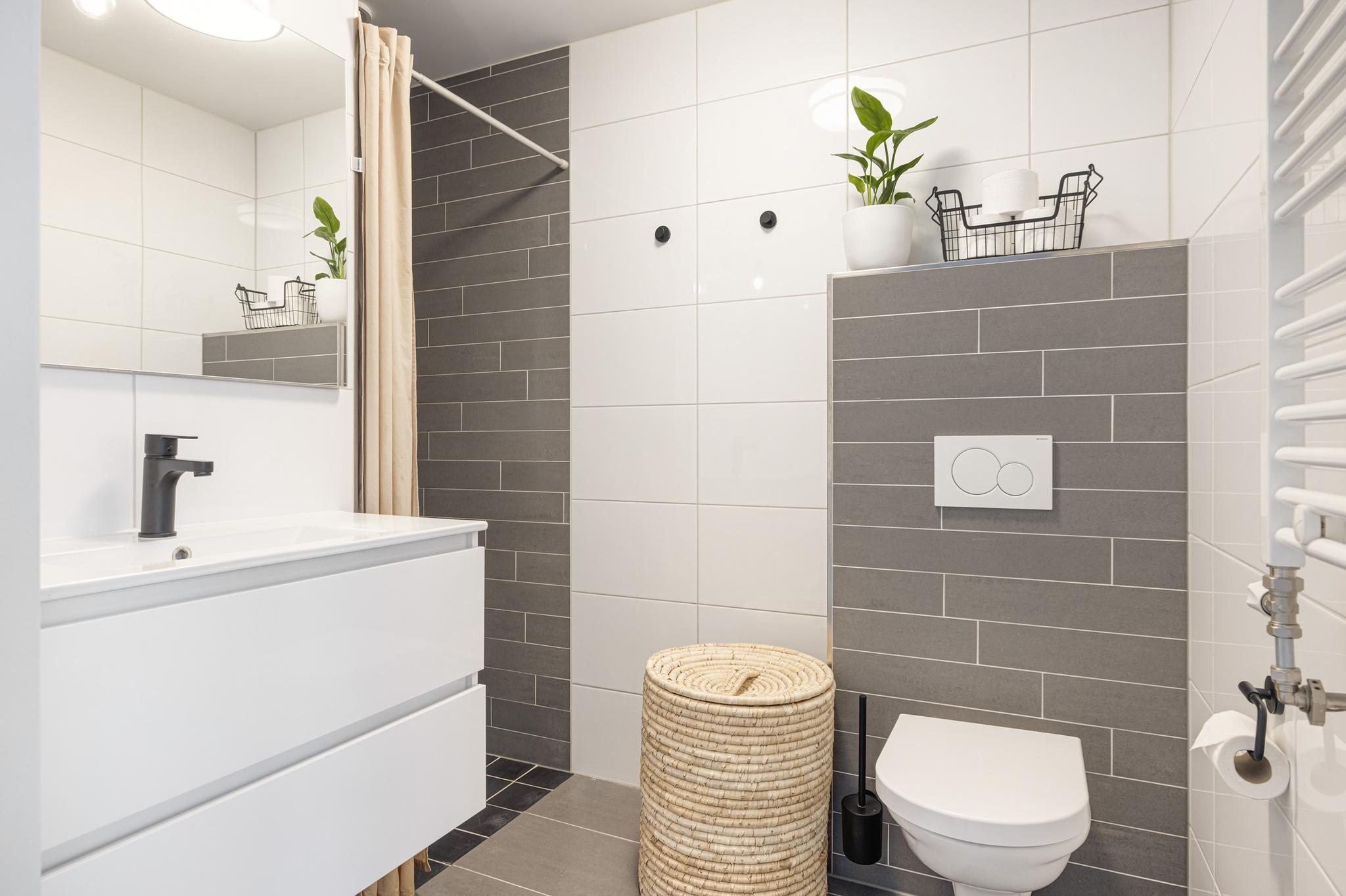 De inpandige badkamer is strak afgewerkt met antraciet vloertegels en fris witte wandtegels. Ruime inloop douche, vrijhangend toilet, wastafel met meubel, design radiator en gestuct plafond.
