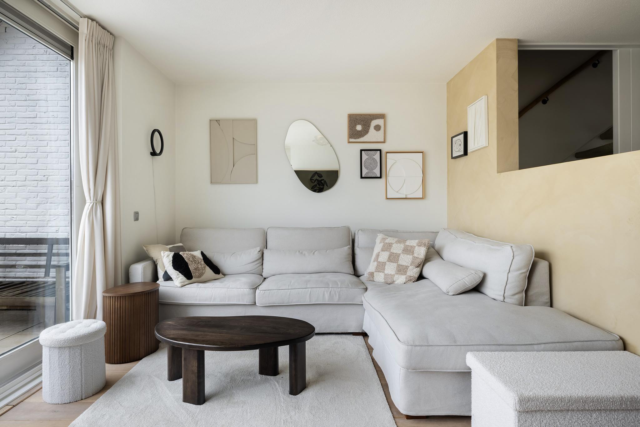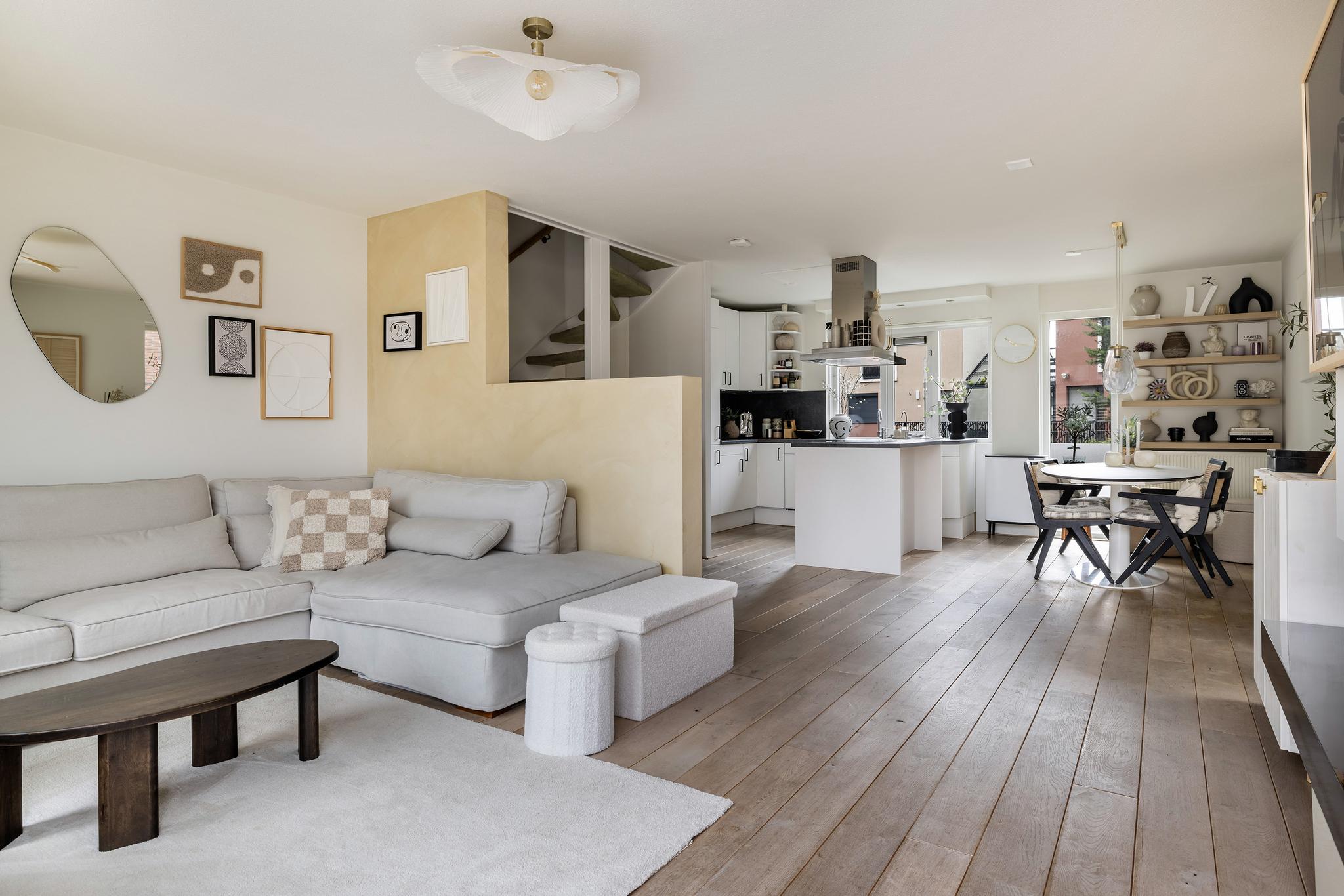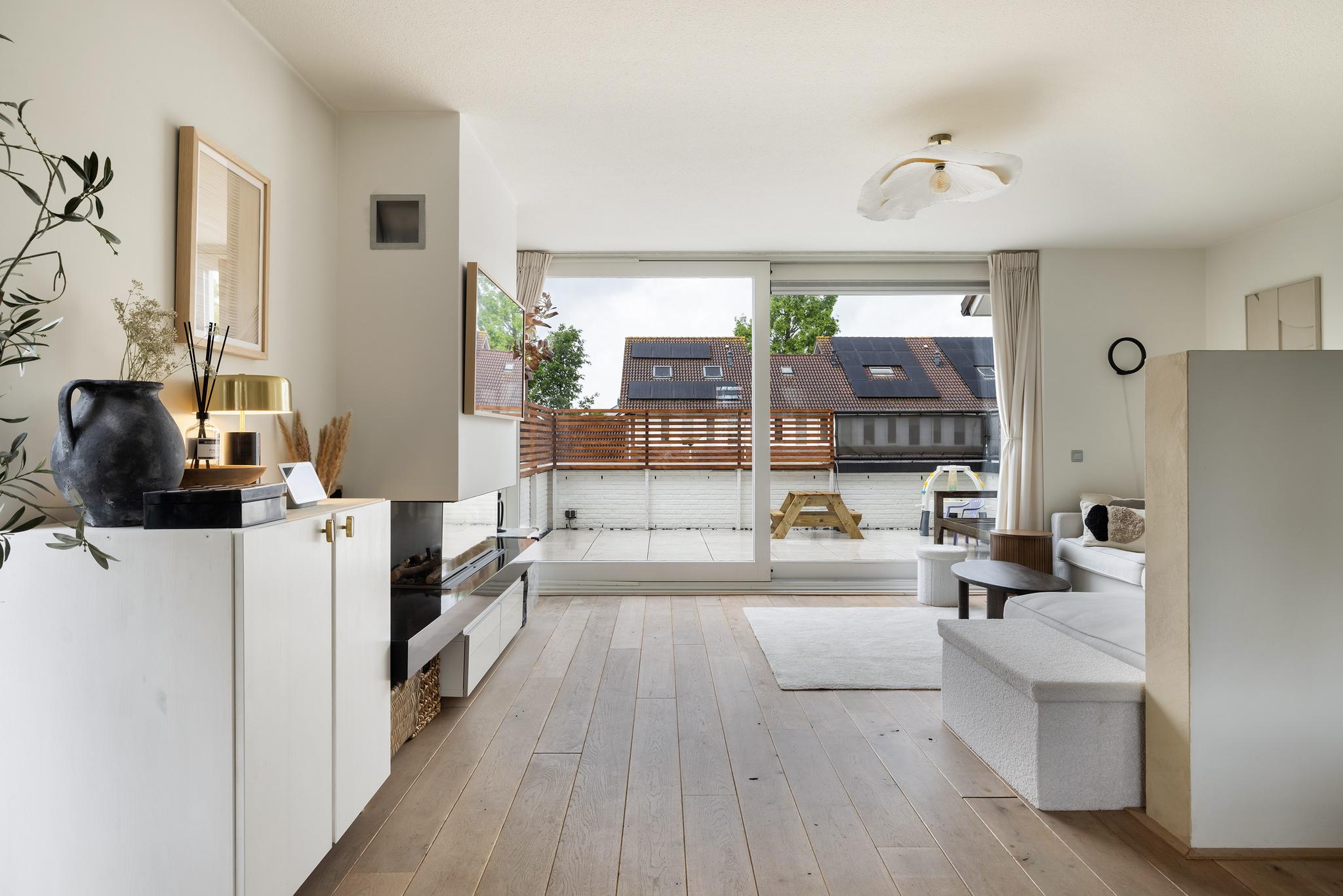Een heerlijk lichte en ruime woonverdieping met aangrenzend dakterras. De gehele verdieping is voorzien van een eikenhouten parketvloer en stucwerk wandafwerking.