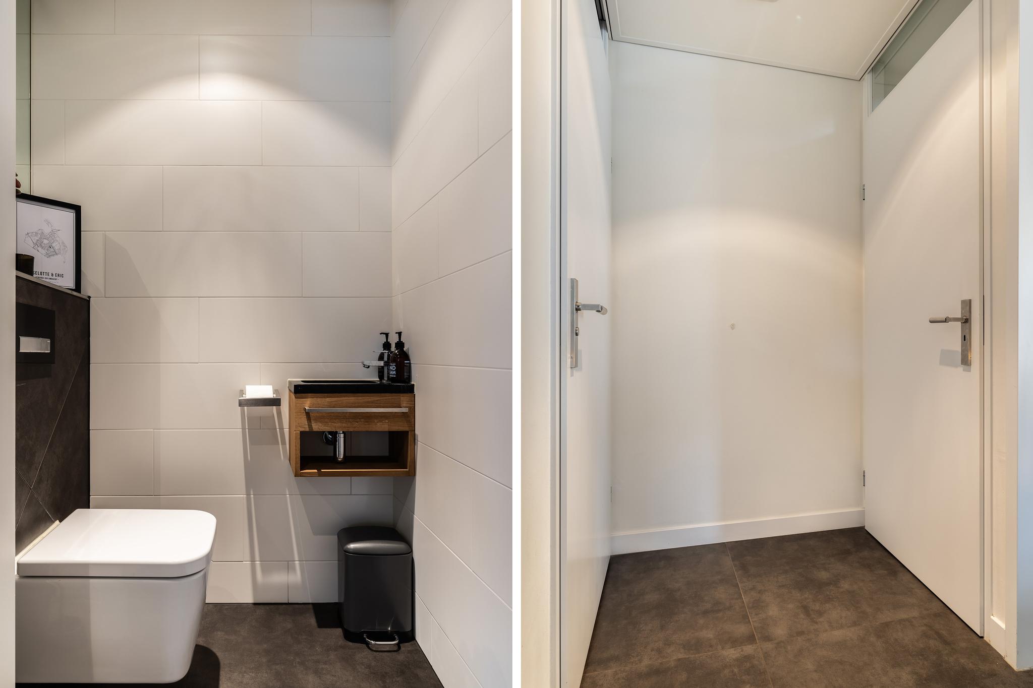 Toilet, volledig betegeld, voorzien van hangend closet en fontein.