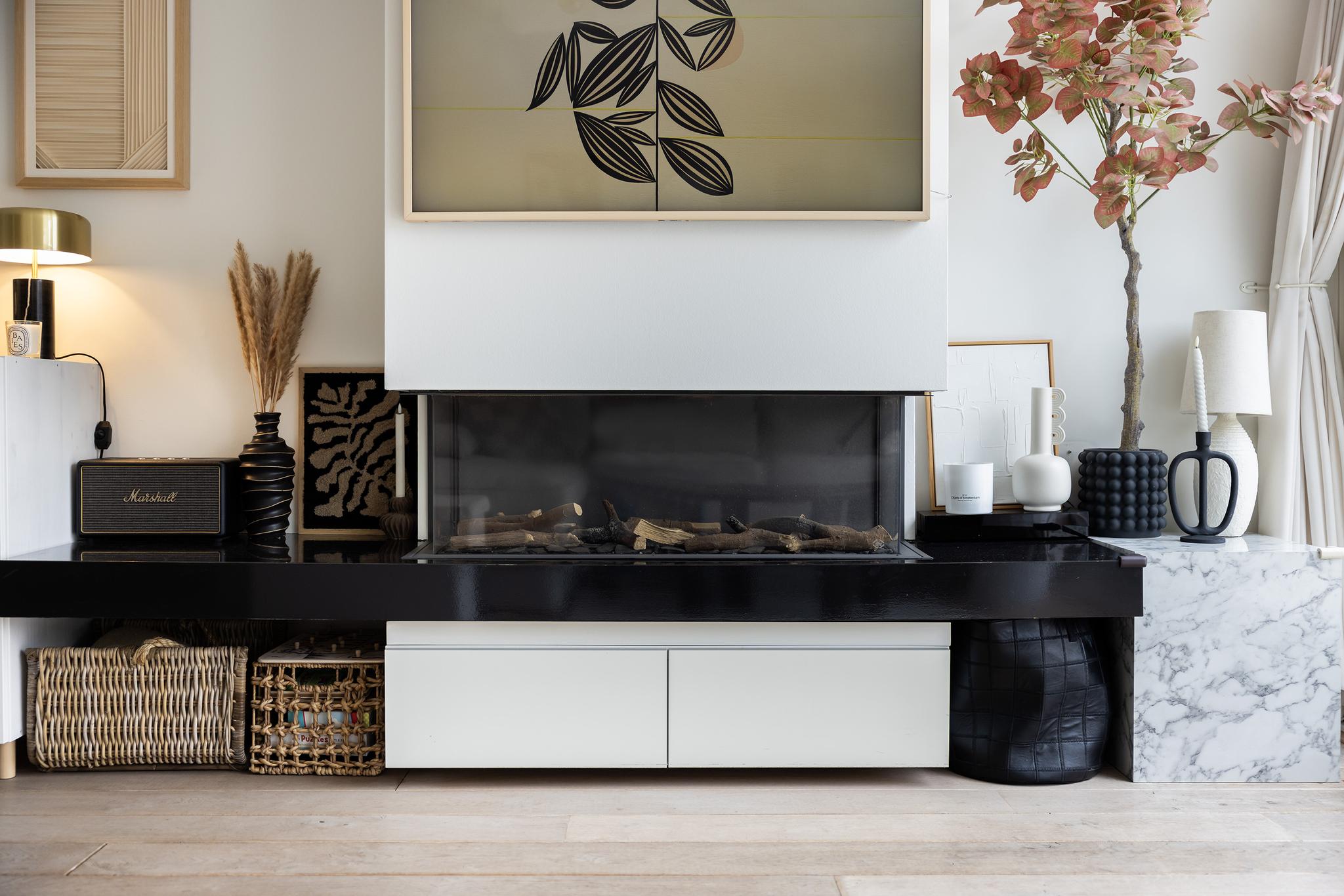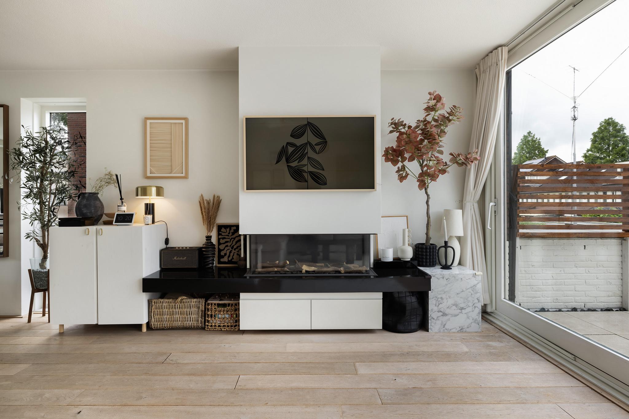 De woonkamer is gelegen aan achterzijde en beschikt over een fraaie sfeerhaard (gas) met inbouwkasten en een schuifpui naar het dakterras.