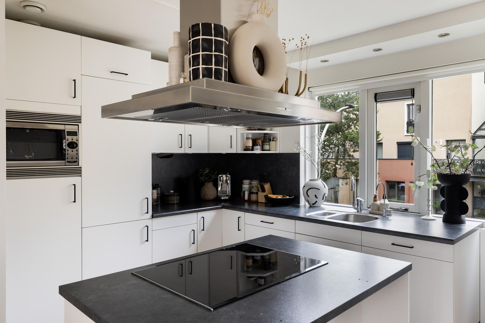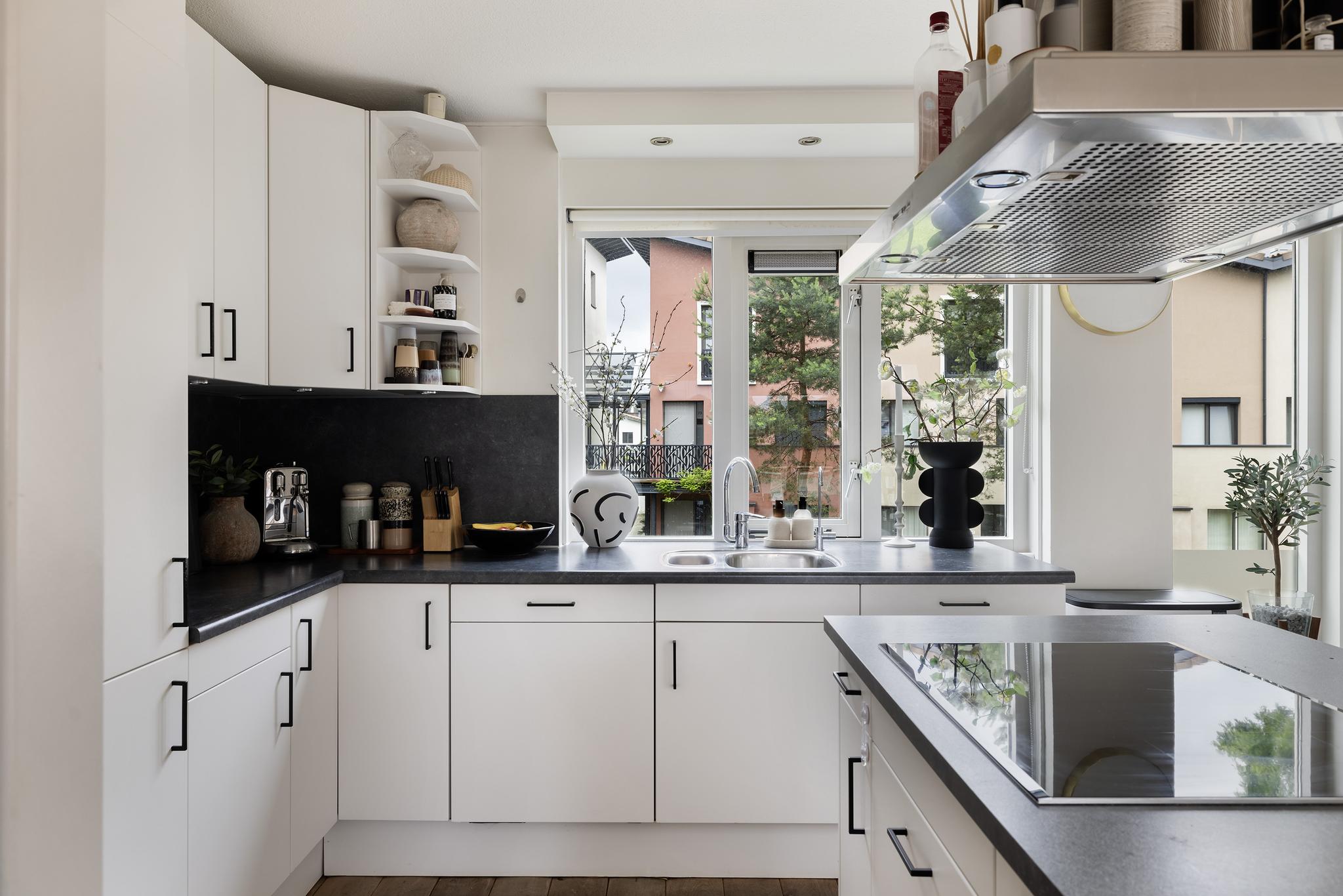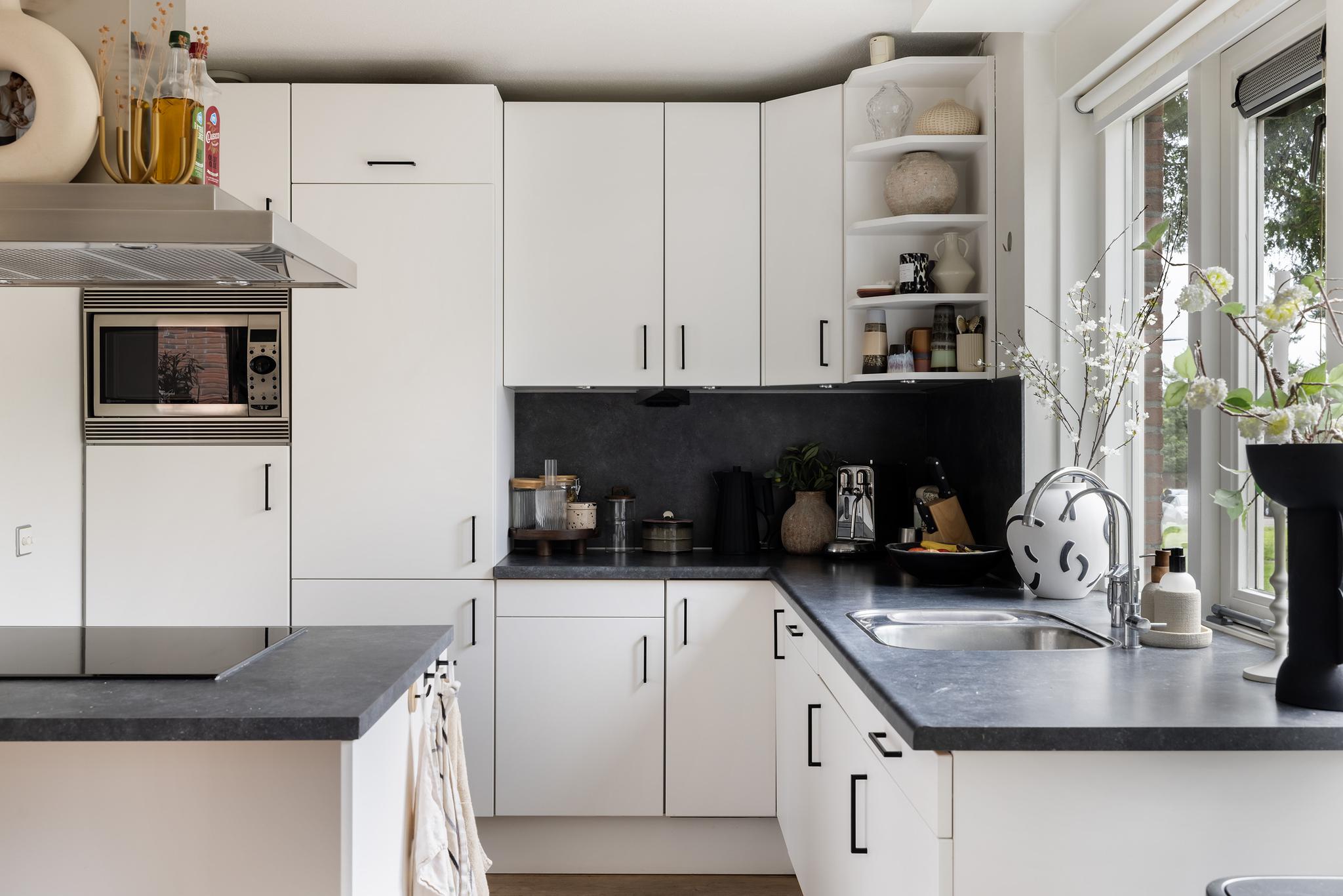De open keuken aan voorzijde is ruim opgezet in een hoekopstelling met kookeiland. De keuken beschikt over een inductie kookplaat (Bosch, 2019), afzuigkap (recirculatie), koelkast (2019), vriezer, combimagnetron, vaatwasser (2019), een kunststof werkblad, 1,5 spoelbak, inbouw verlichting en veel bergruimte.