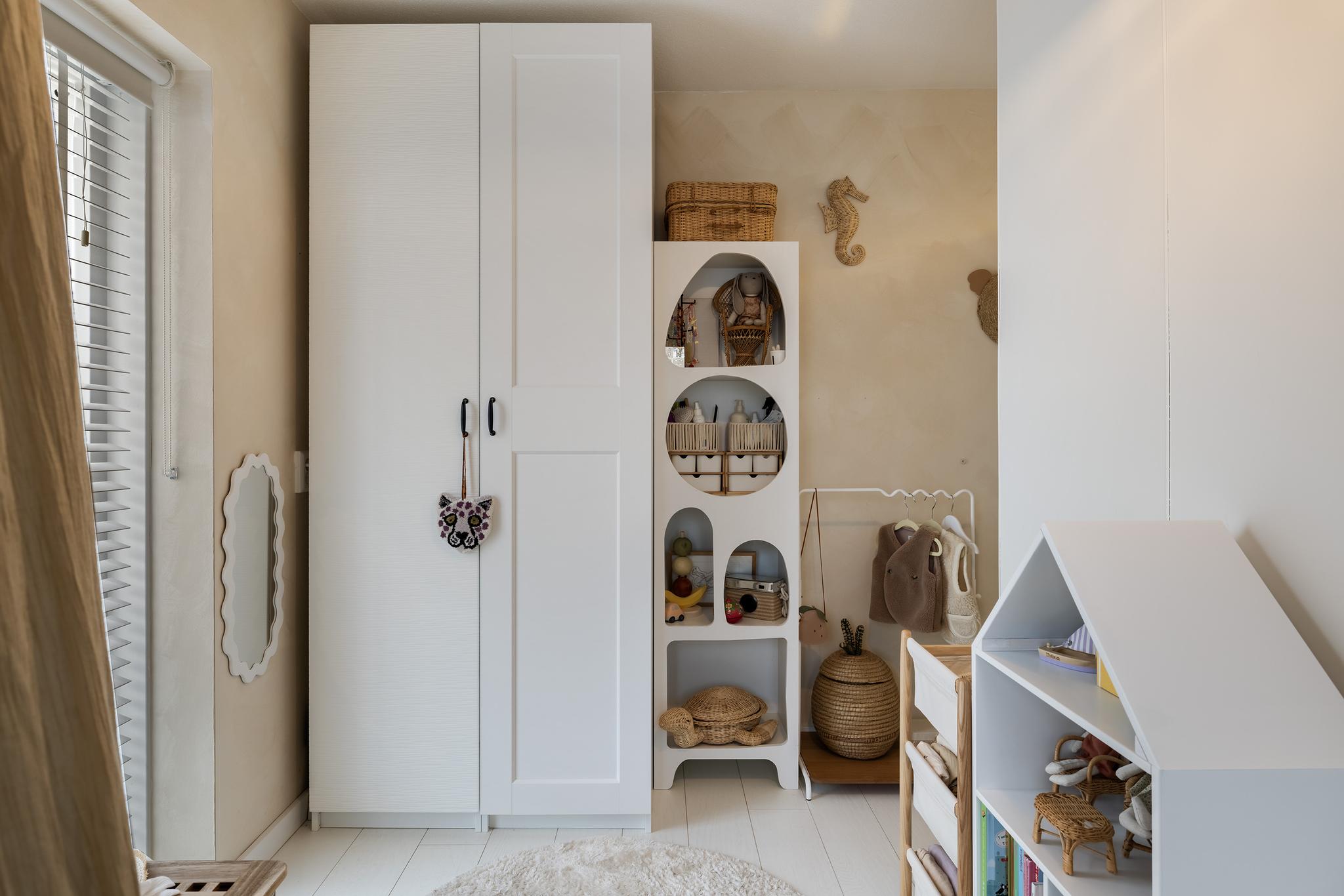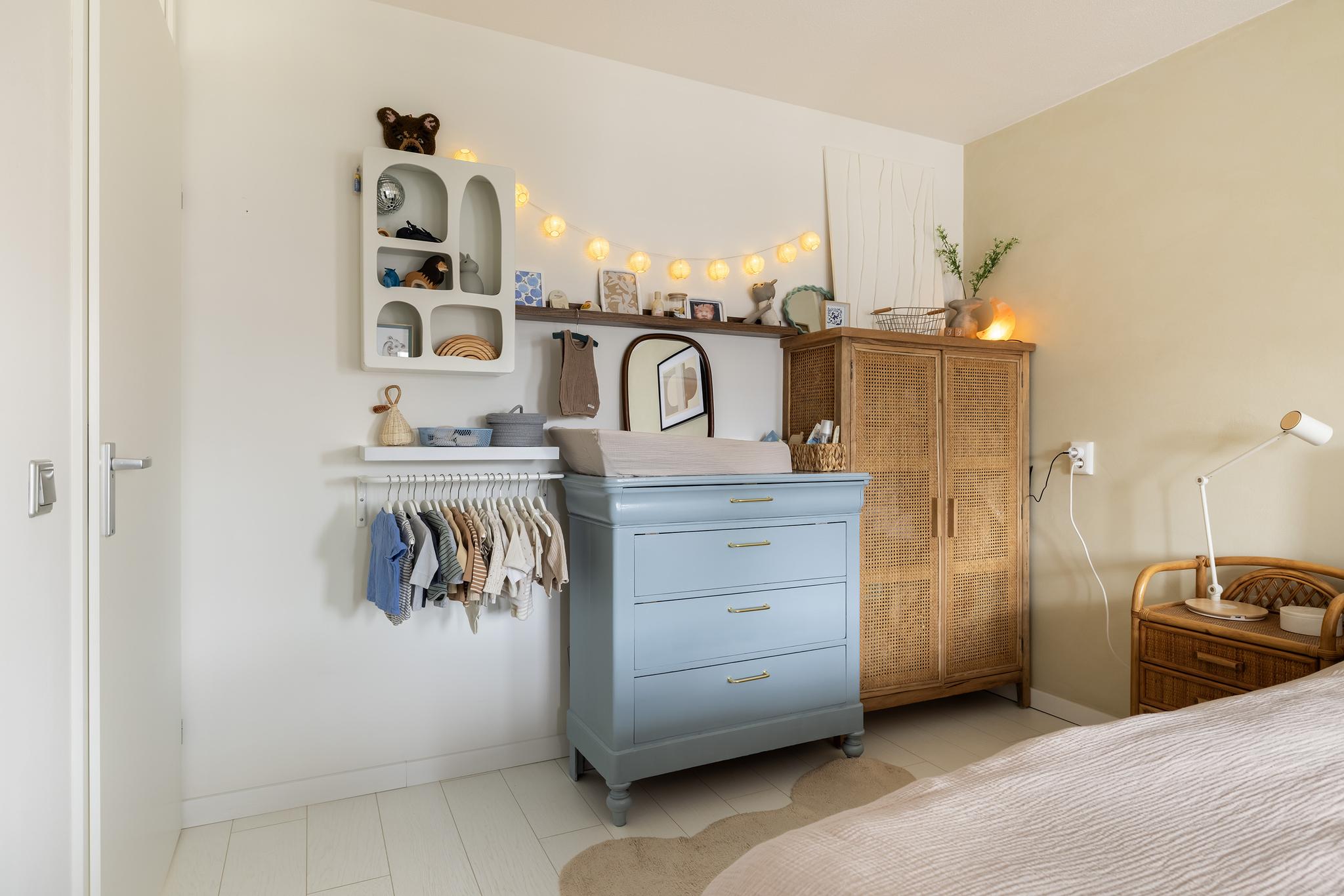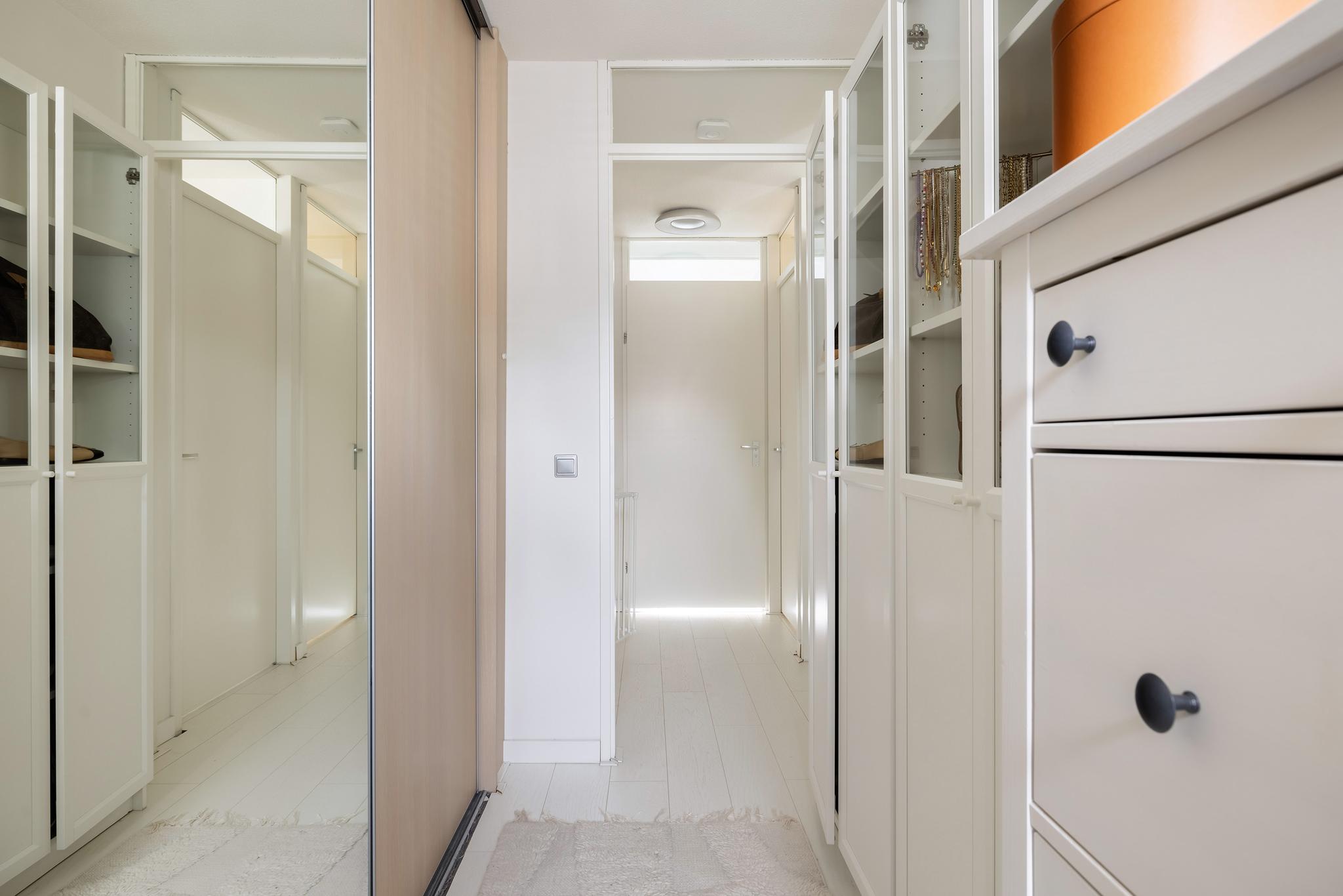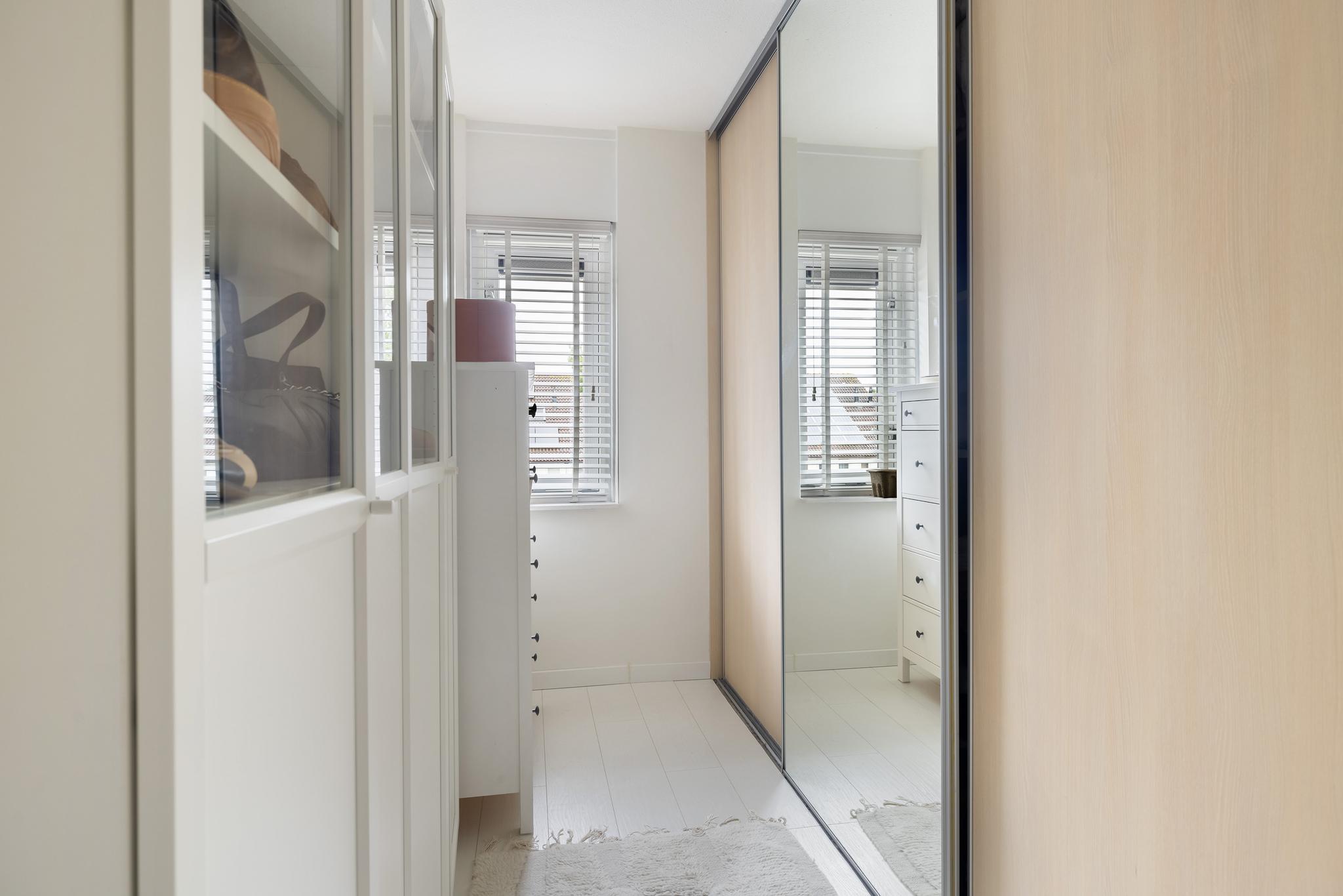 Slaapkamer aan achterzijde, in gebruik als kledingkamer, voorzien van een vaste schuifkastenwand, laminaatvloer en stucwerk wandafwerking.