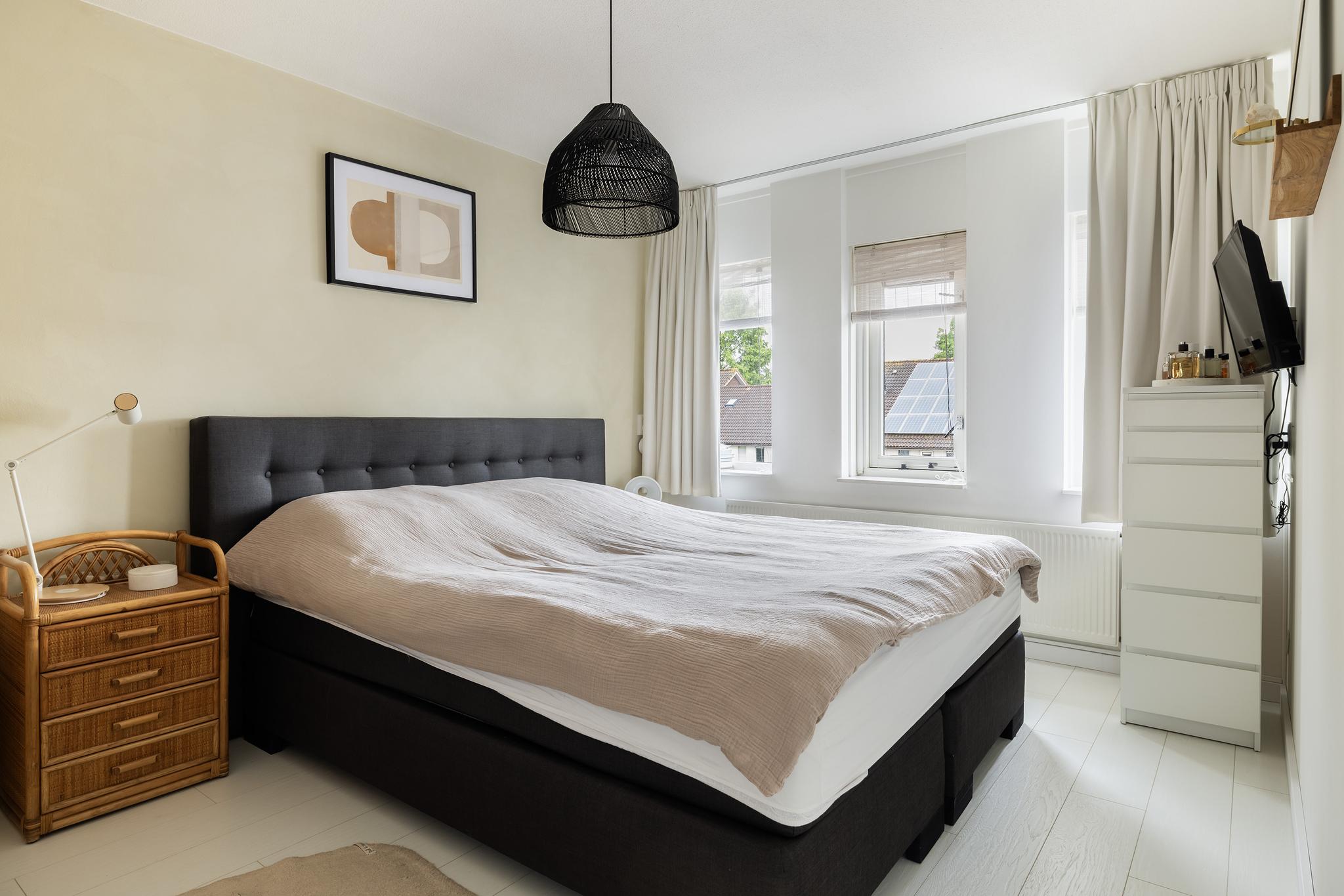 Ruime slaapkamer aan achterzijde, voorzien van een laminaatvloer en stucwerk wandafwerking.