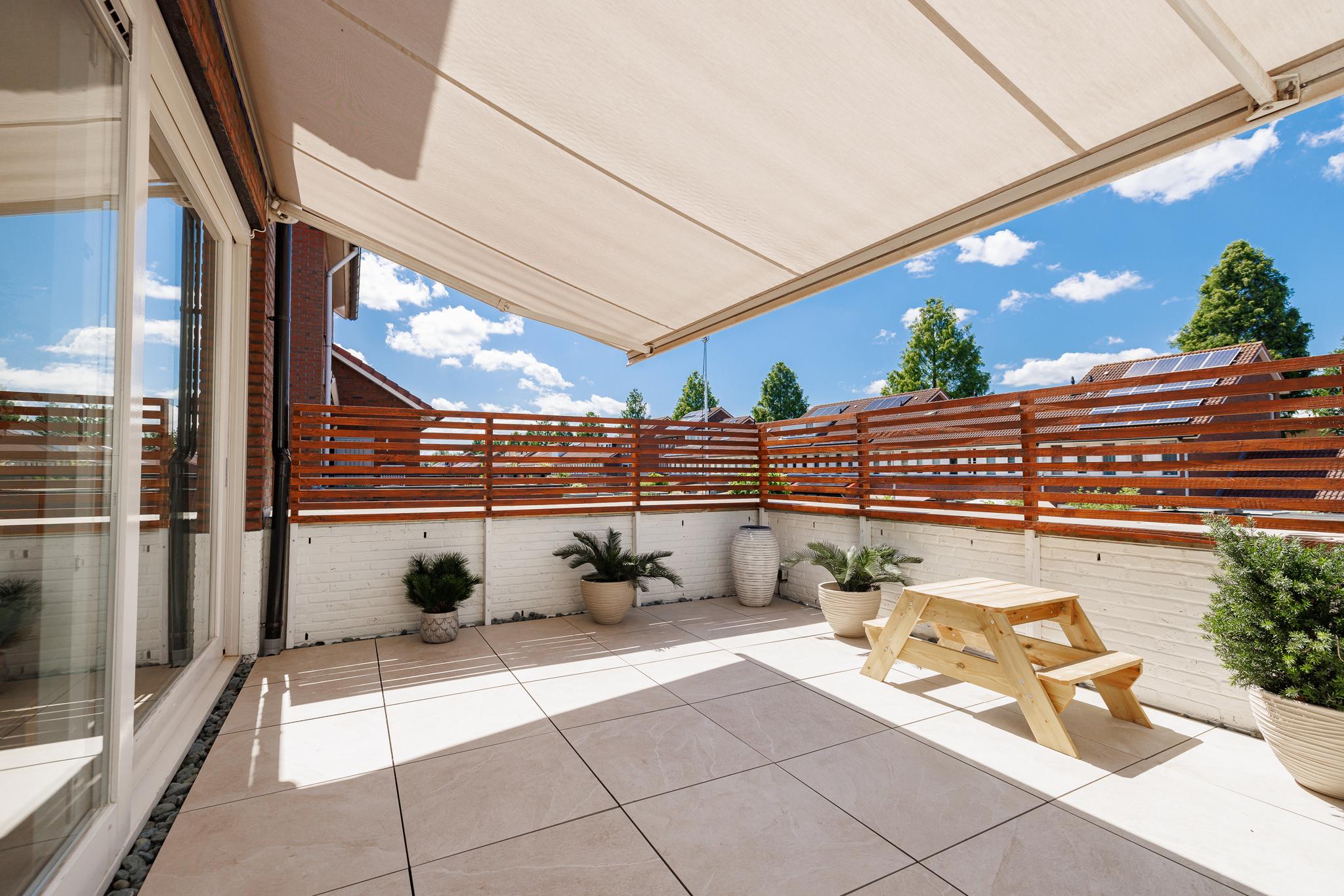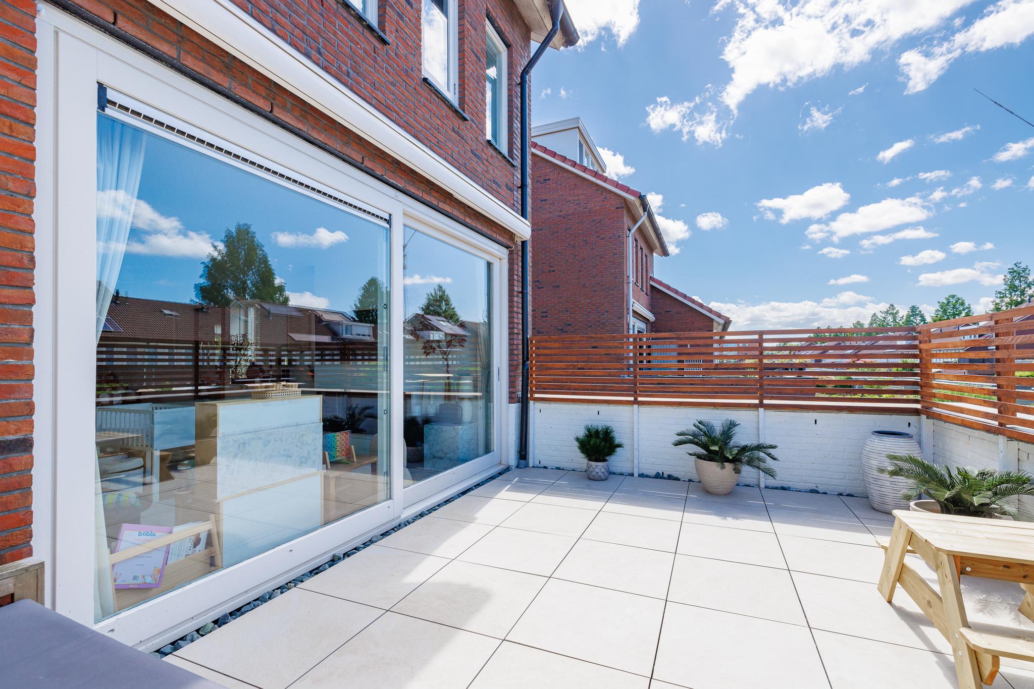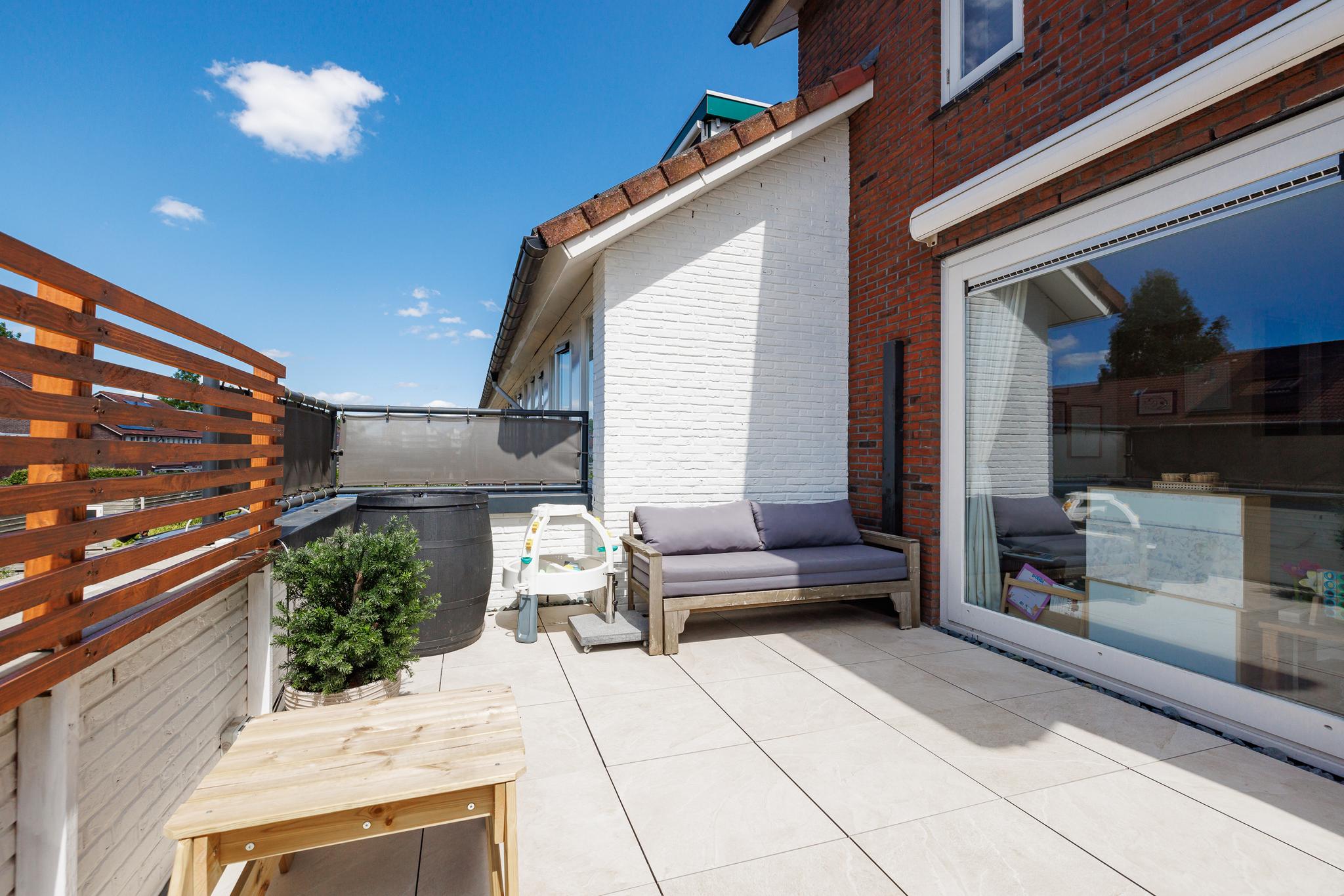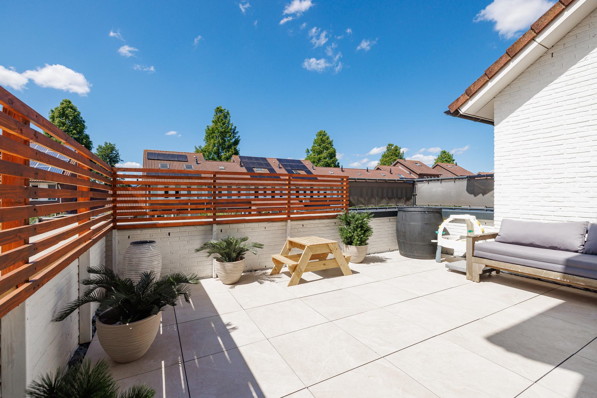 Het dakterras is aangrenzend bij de woonkamer en is gelegen op het noordwesten. Je hebt hier de lusten van een fijne buitenruimte, maar niet de lasten van onderhoud van een tuin! Het terras in 2024 vernieuwd, daarbij is nieuwe isolatie en dakbedekking geplaatst, is de hemelwaterafvoer vernieuwd en zijn nieuwe tegels geplaatst. Verder is het dakterras voorzien van een zonnescherm (elektrisch).