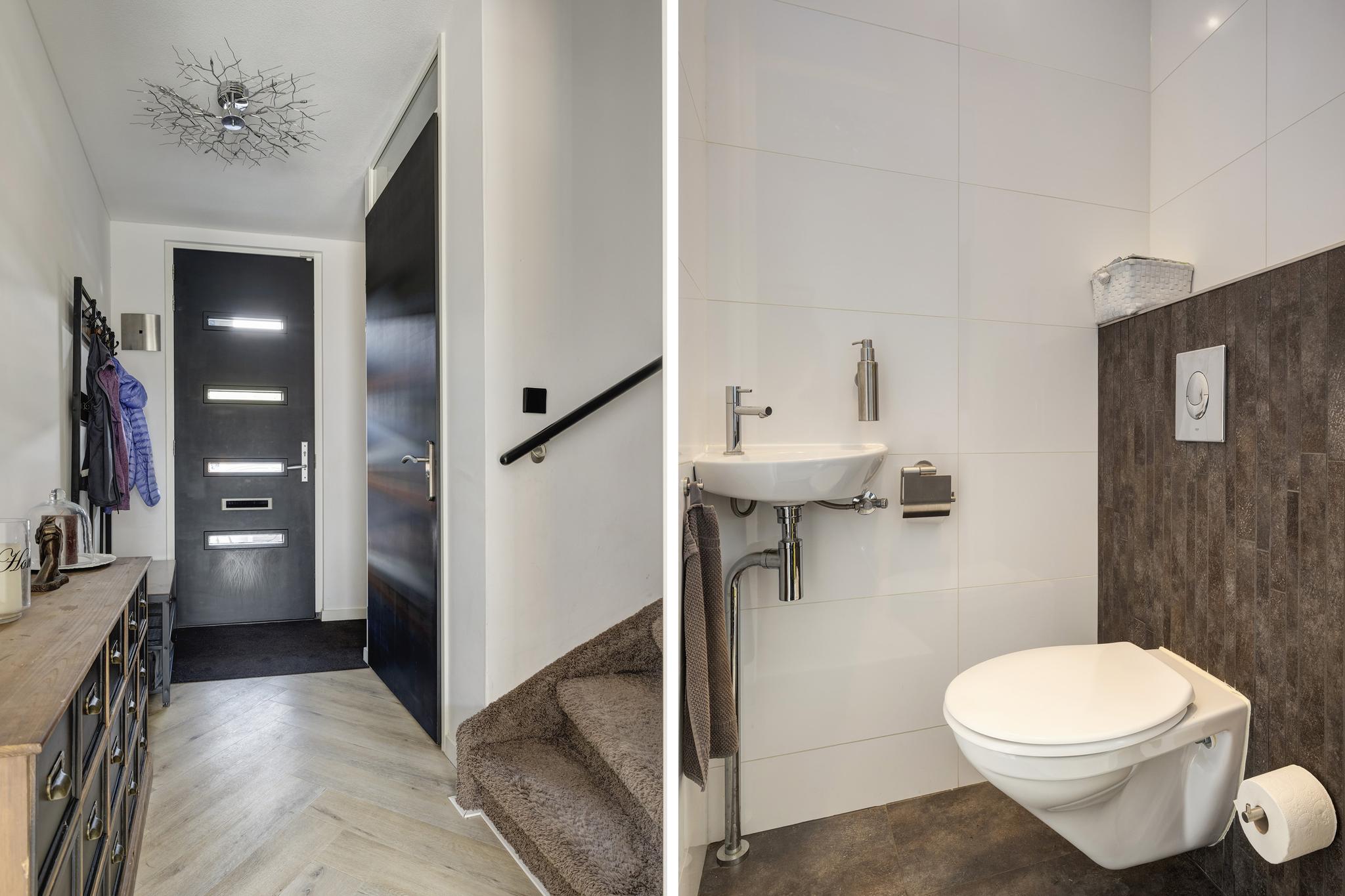 Hal met toilet (volledig betegeld, hangend closet met fontein), meterkast (8 groepen, 3 aardlekschakelaars, krachtstroom aanwezig, glasvezel aansluiting, slimme meters).