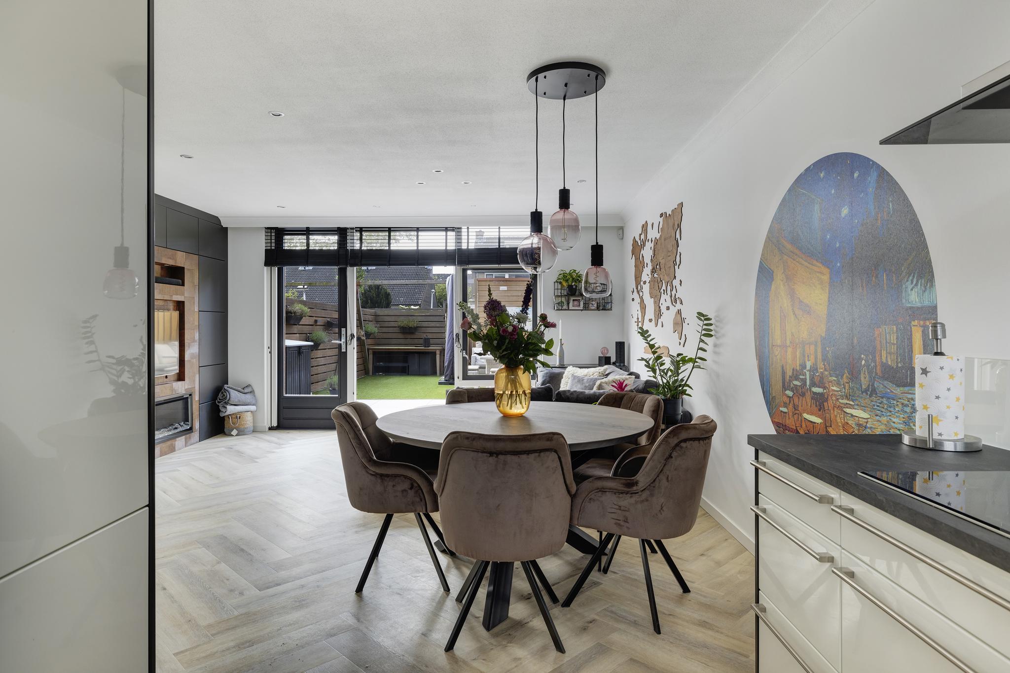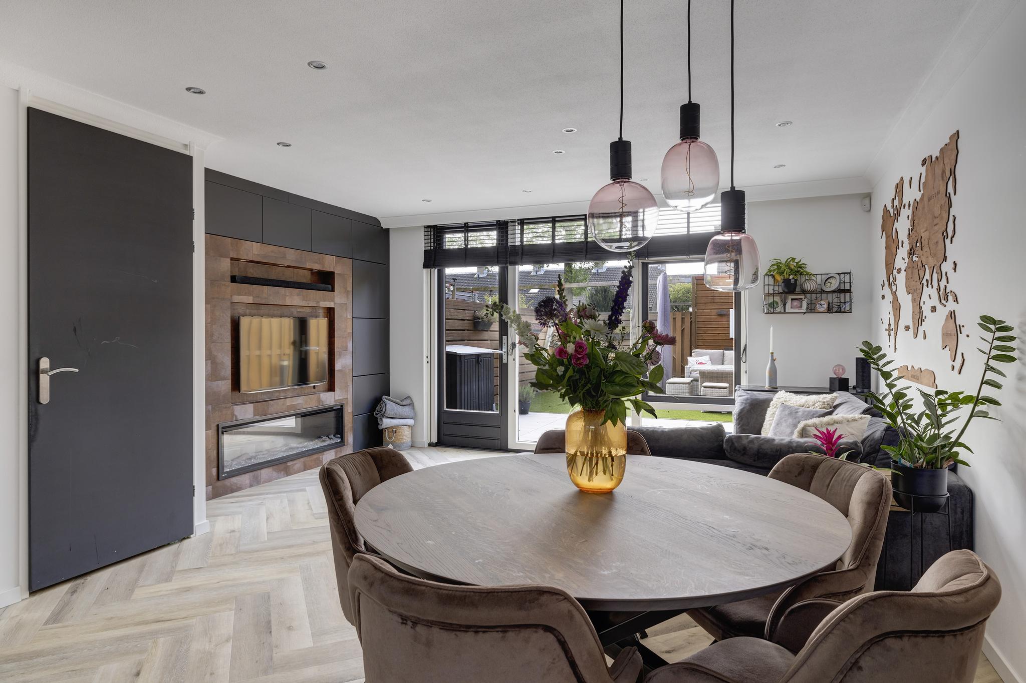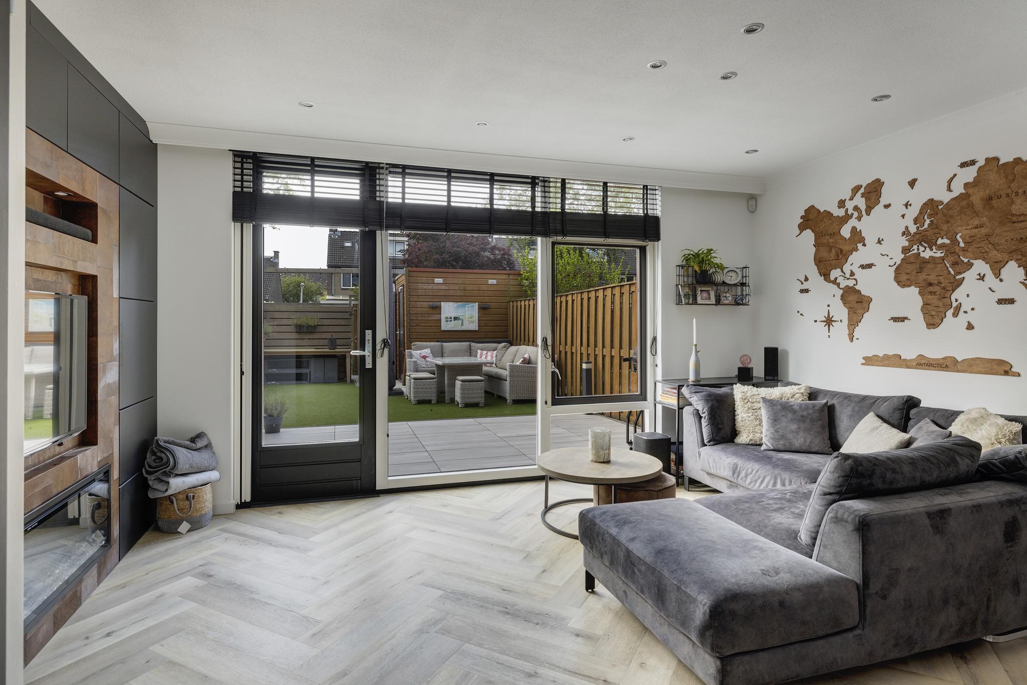 Via een glazen tussendeur betreden we de ruime woonkamer. De woonkamer beschikt over een mooie PVC visgraatvloer met vloerverwarming, renovlies wandafwerking, een trapkast en deur naar de achtertuin. Een wand in de woonkamer is voorzien van een cinewall met elektrische sfeerhaard met led verlichting, met rondom inbouwkasten- en lades en bekleed met stijlvol leder behang. De inbouwspots in woonkamer zijn naar een lichtplan geplaatst en verdeeld over verschillende groepen, dus je kan naar eigen wens de verlichting bedienen.