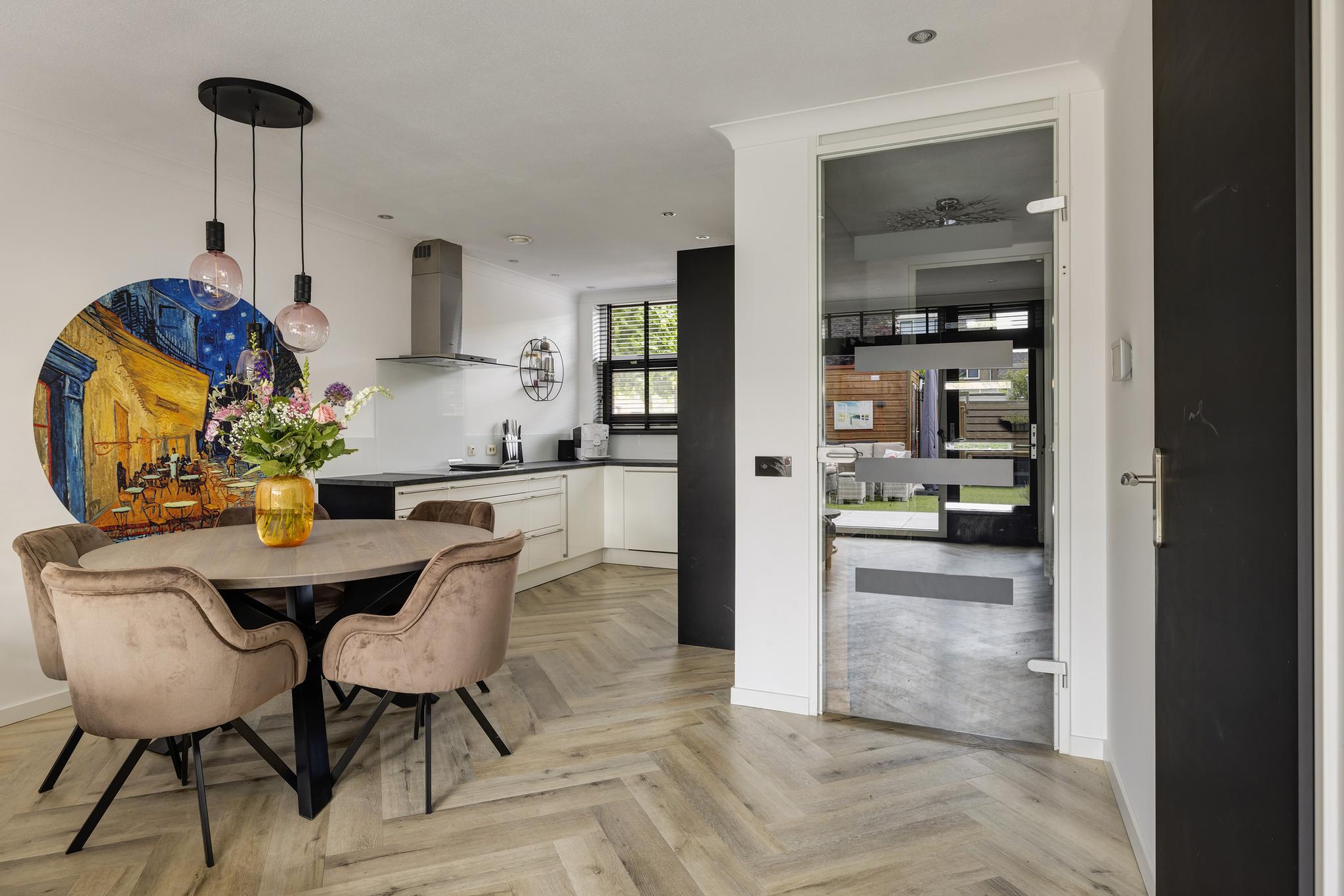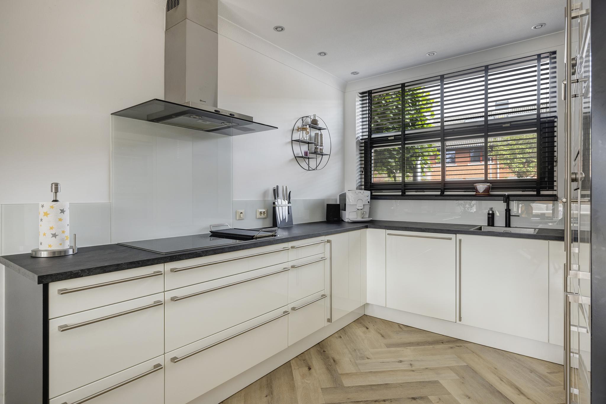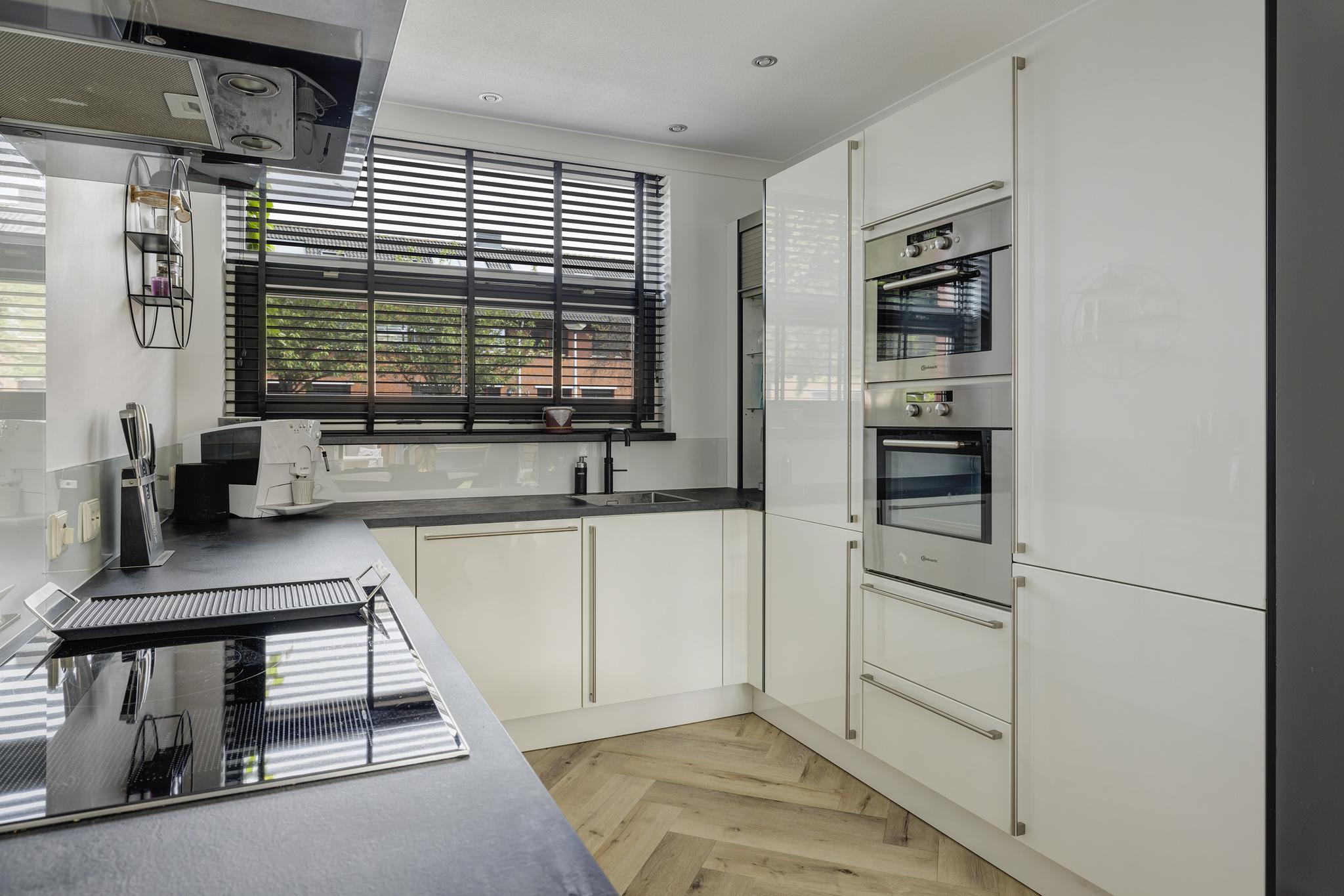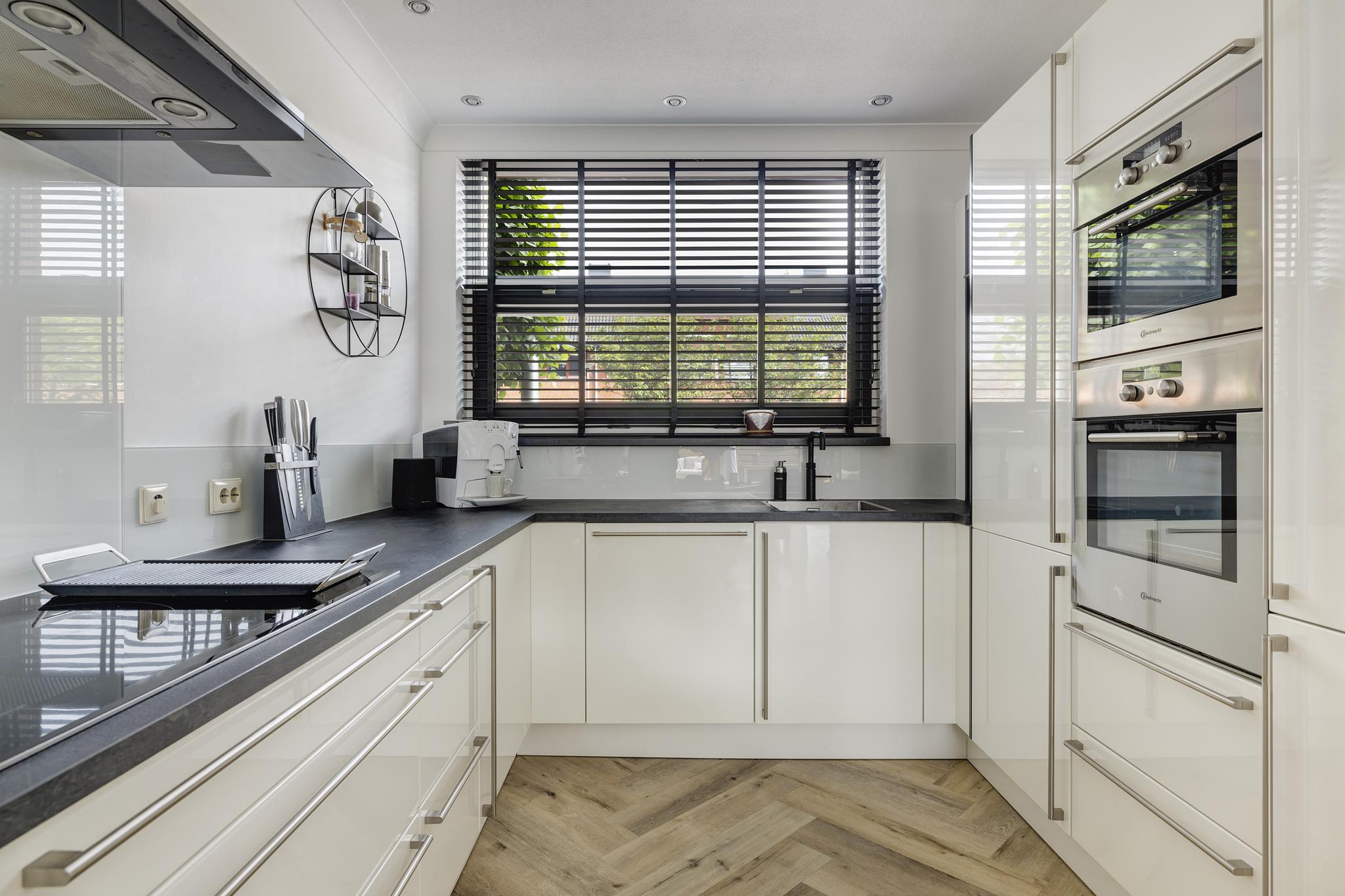 De moderne keuken in U-opstelling bevindt zich aan voorzijde en beschikt over een 5-pit inductie kookplaat met grillplaat (aangesloten op krachtstroom), afzuigkap, vaatwasser (2020), oven, combi-magnetron, koelkast, vriezer, Quooker kraan (2020) en kunststof werkblad (2020). Alle apparatuur is van A-merken Bauknecht en Siemens.