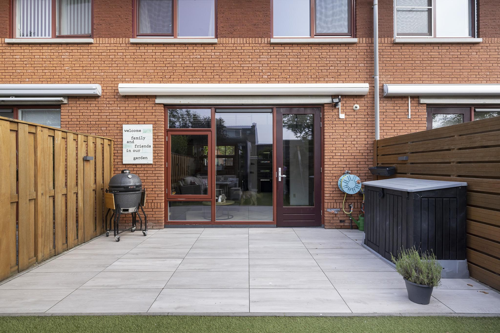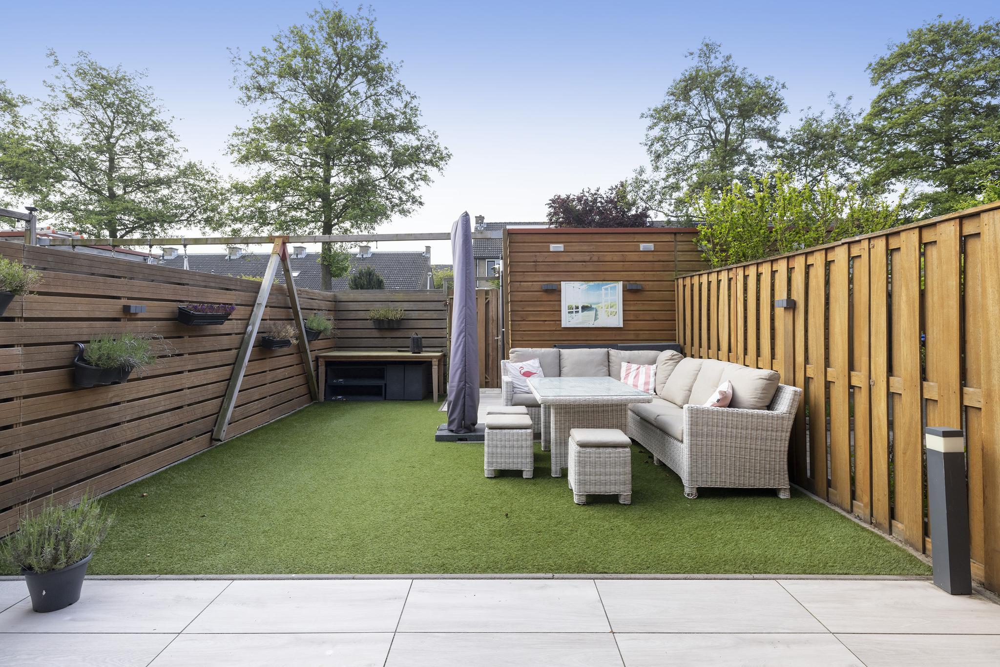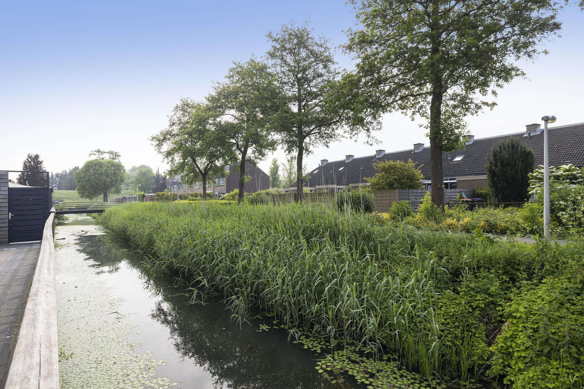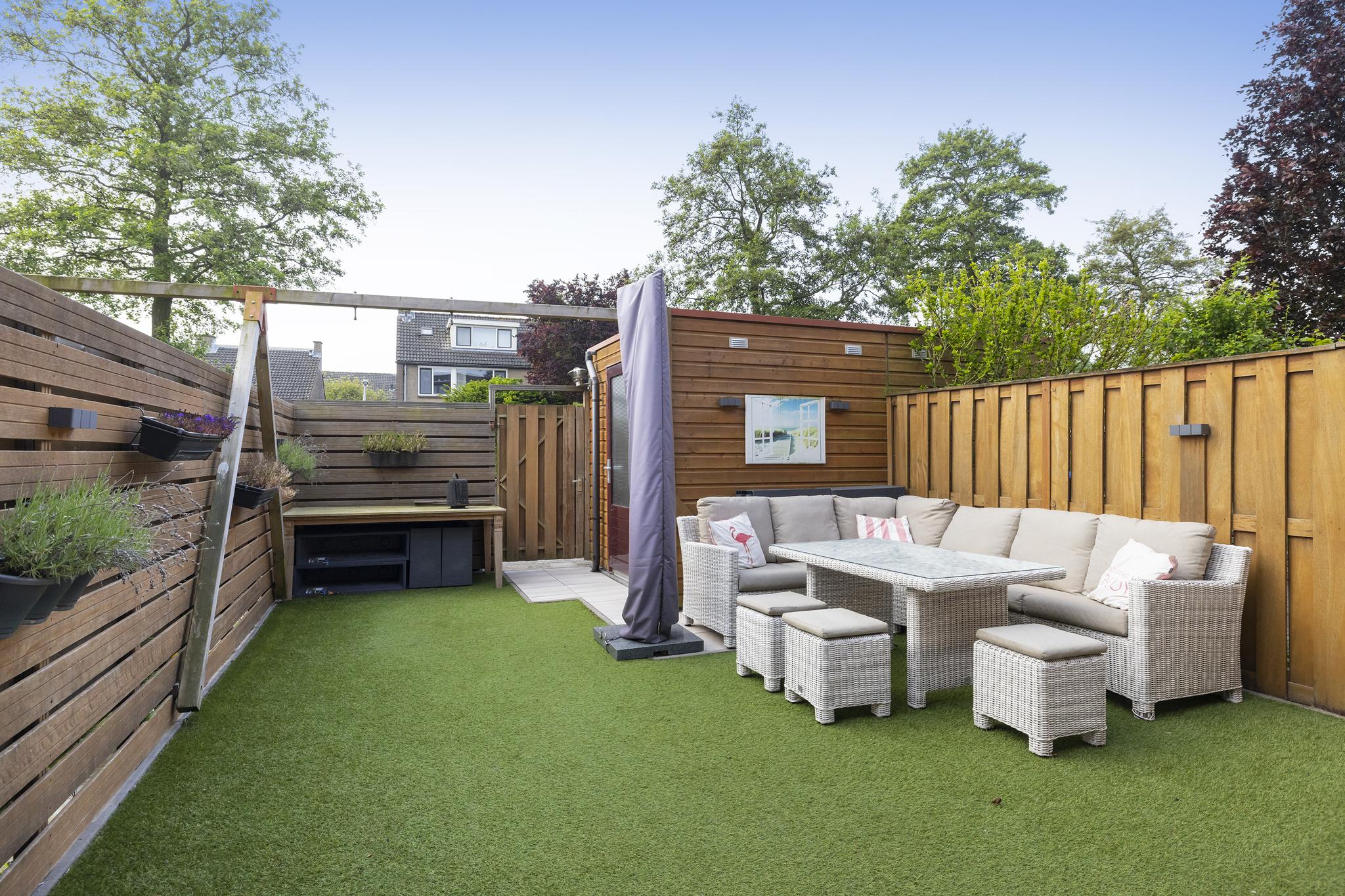 De diepe achtertuin (10 meter maar liefst) is gelegen op het zuiden en beschikt over een elektrisch zonnescherm, verlichting, een buitenkraan, keramische siertegels en deels kunstgras. Tijdens de bouw van de woning zijn extra palen geslagen voor een eventuele uitbouw, ideaal dus als je dit overweegt! Achterin de tuin bevindt zich een houten berging (eveneens onderheid en voorzien van elektra) en een achterom. Achter de woning ligt een brede sloot, waardoor er nagenoeg geen inkijk mogelijk is. Je kan hier dus optimaal genieten van rust, privacy en natuurlijk het zonnetje!