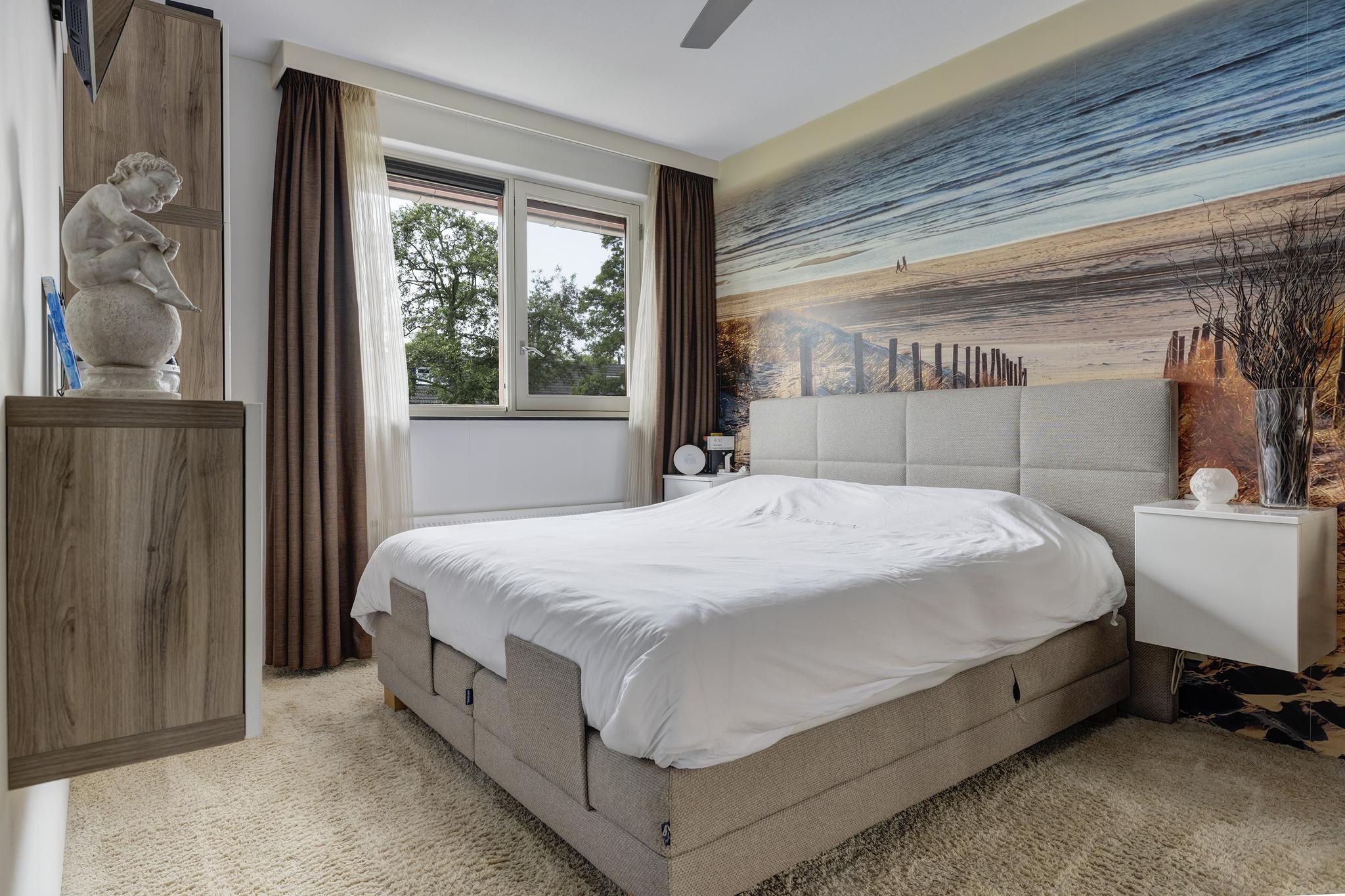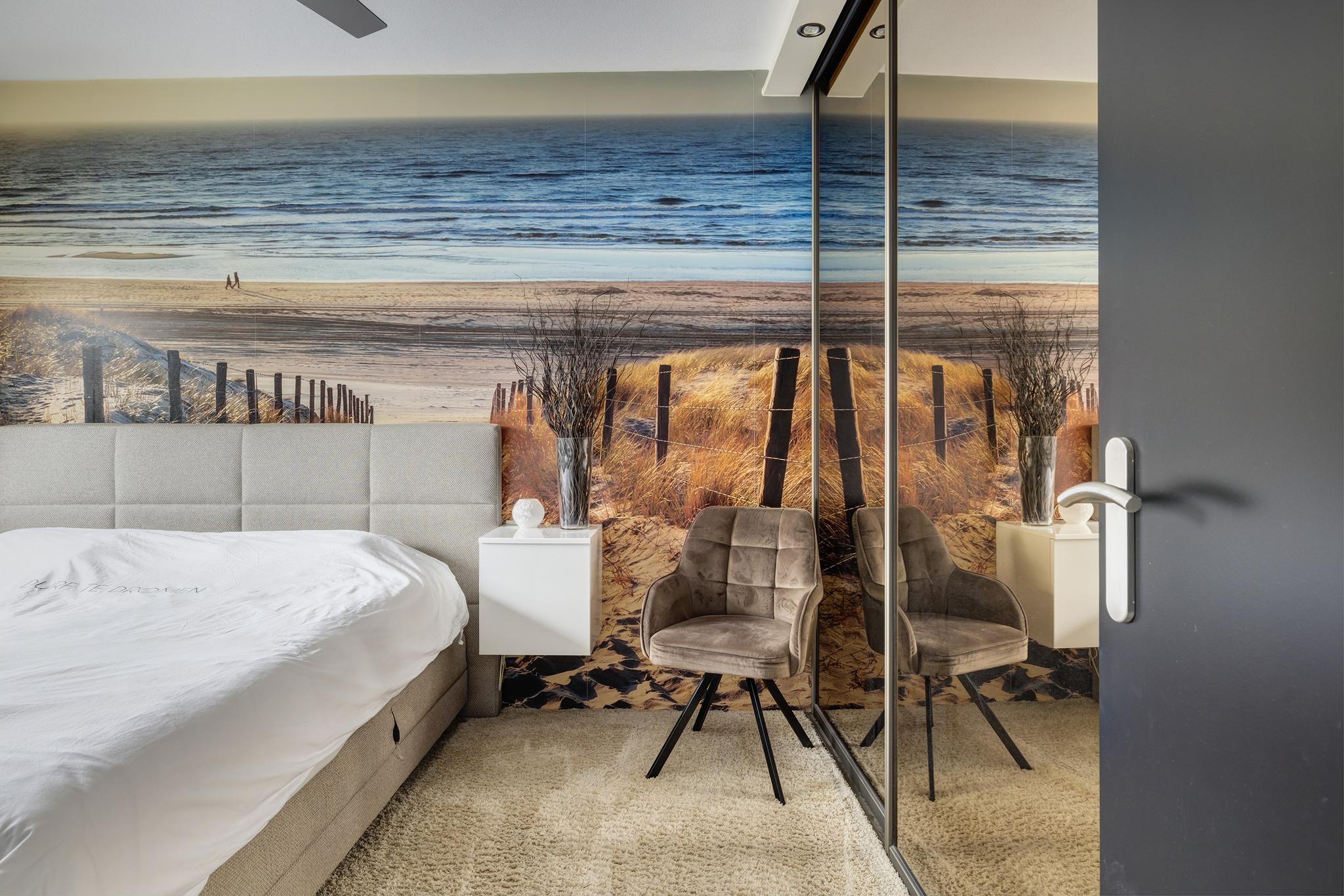 De grote slaapkamer aan achterzijde, voorzien van een vaste schuifkastenwand, renovlies behang en een mooi foto behang op de achterwand. Deze kamer beschikt tevens over een sunscreen.