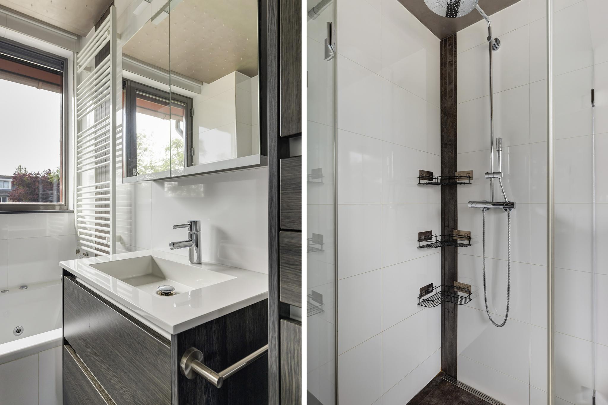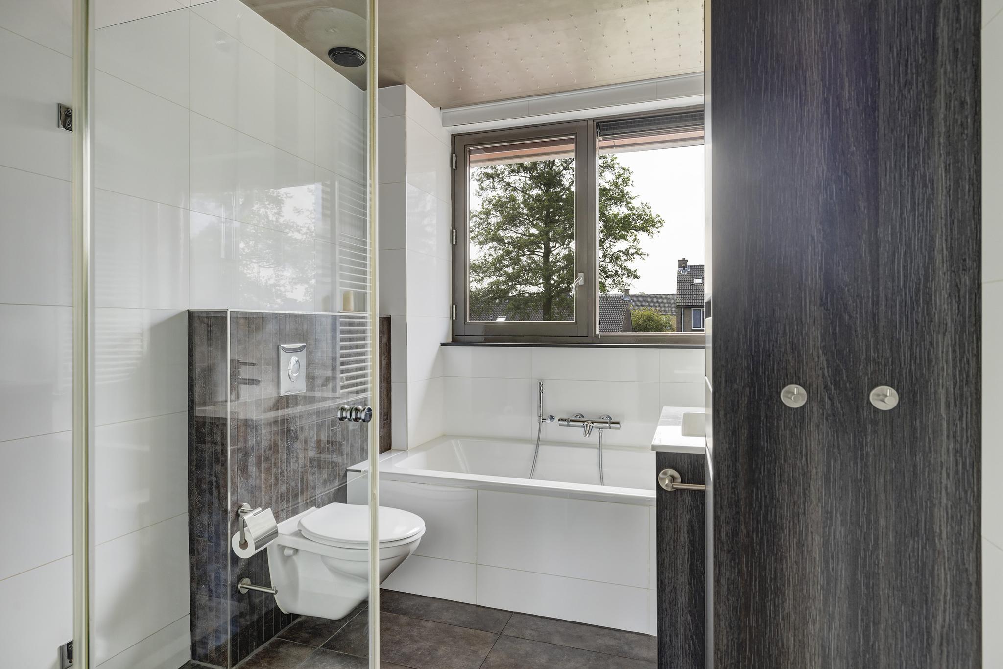De ruime badkamer beschikt over een breed ligbad met whirlpool systeem en prachtige sterrenhemel, een douchecabine met regendouche, toilet, wastafel met meubel, spiegelkast, designradiator en vloerverwarming. De badkamer is zelfs voorzien van ingebouwde muziekboxen. Een snelle douche of toch urenlang bubbelen onder de sterrenhemel onder het genot van je lievelingsmuziek, het kan hier allemaal! Ook zitten er nog sunscreens in de badkamer, deze zijn te bedienen vanuit de slaapkamer.