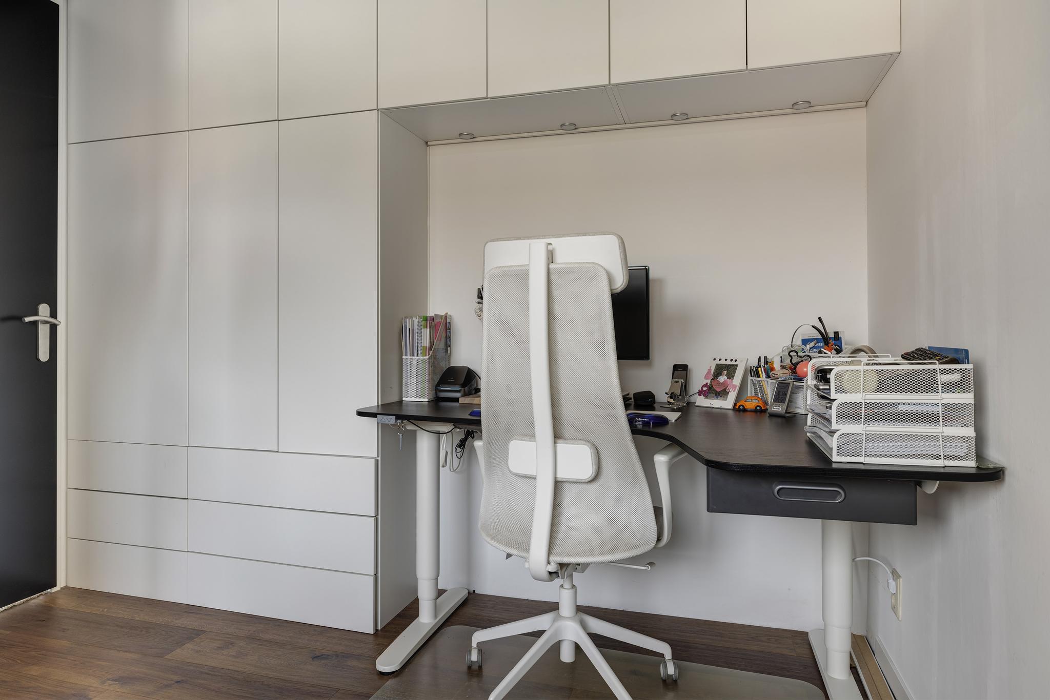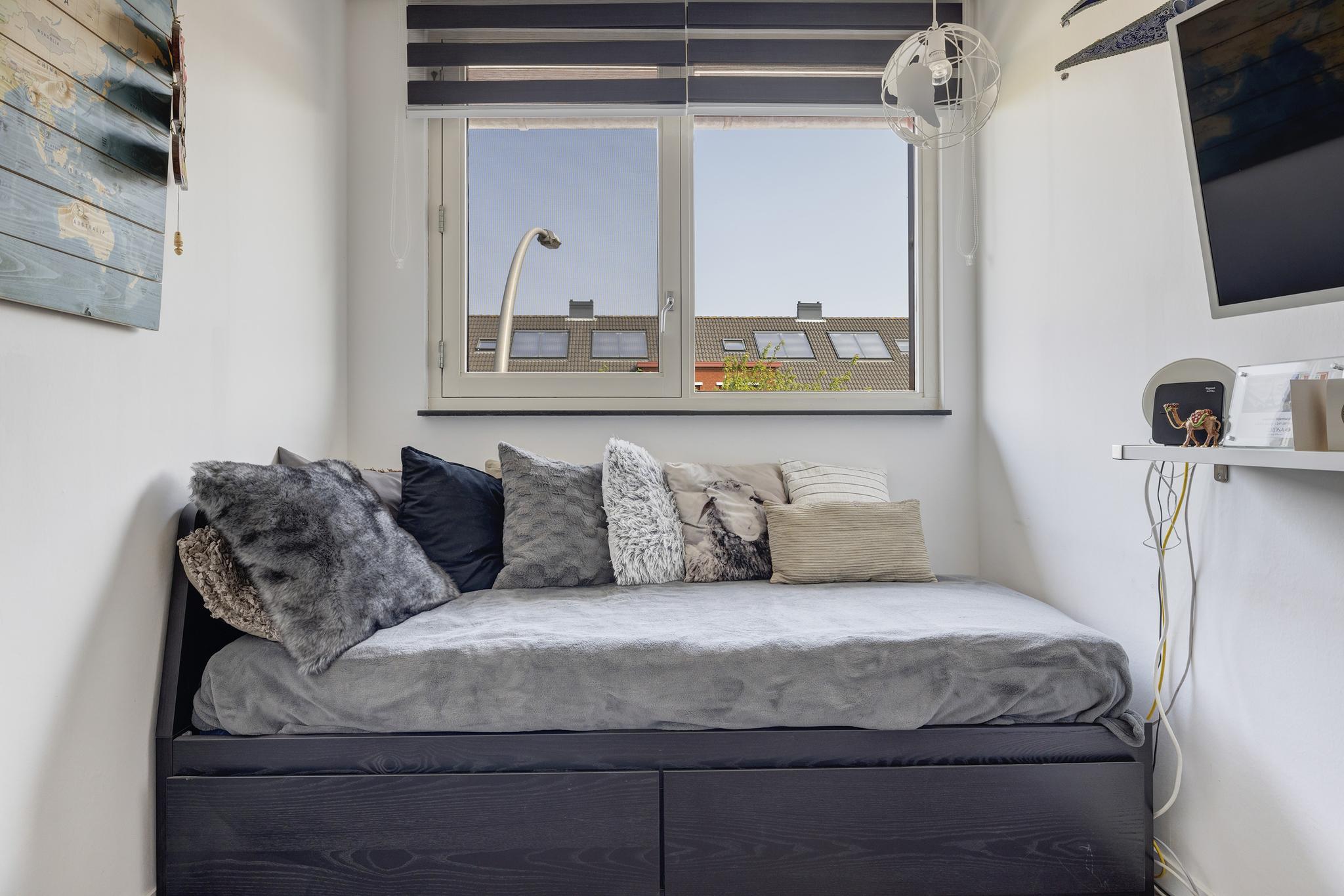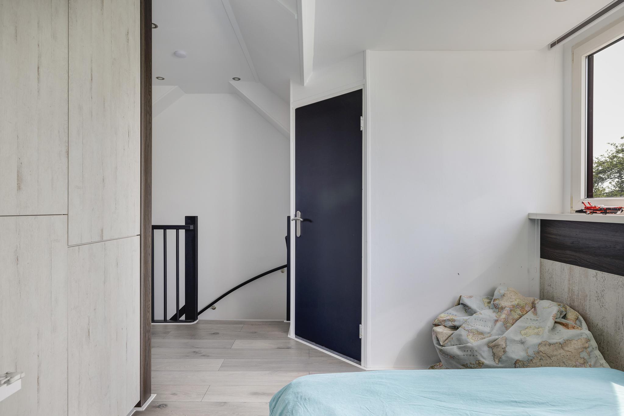 De ruime voorzolder met dakkapel is ingericht als fijne slaapkamer met inbouwkasten. Deze kamer is voorzien van een PVC vloer, renovlies wandafwerking, plissé gordijnen en knieschotten voor extra bergruimte. De dakkapel met kunststof kozijnen beschikt over een sunscreen.