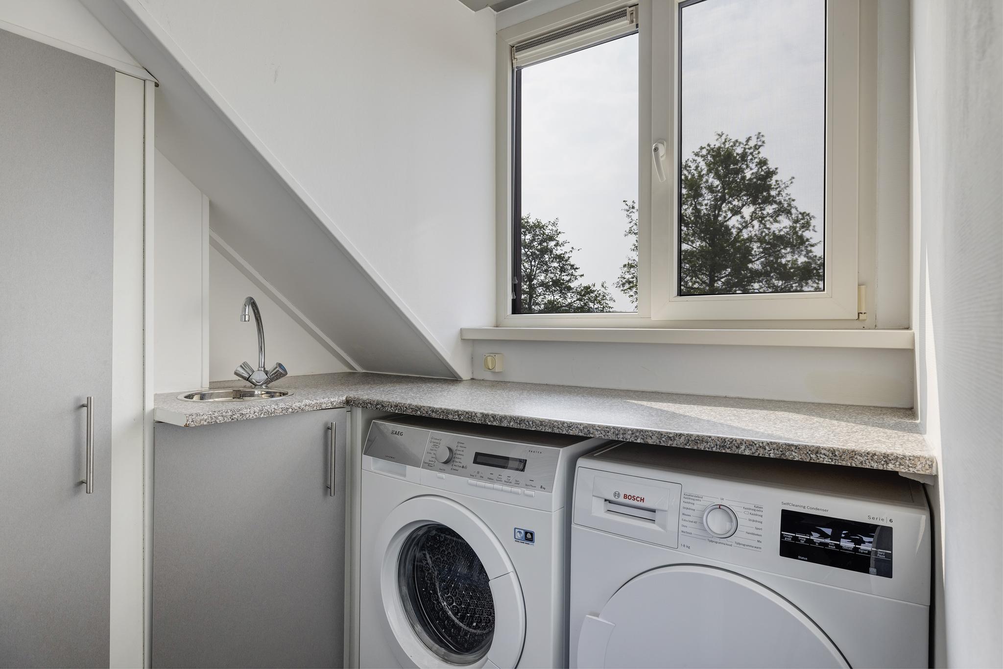 Overloop, aparte ruimte met was aansluiting, deze ruimte is geïsoleerd om het geluid van de wasmachine te verminderen, opstelplaats CV-ketel (Remeha Tzerra CW5, 2020), spoelbak met koud en warm water, sunscreen en PVC vloer. De droger en wasmachine staan op een aparte groep!