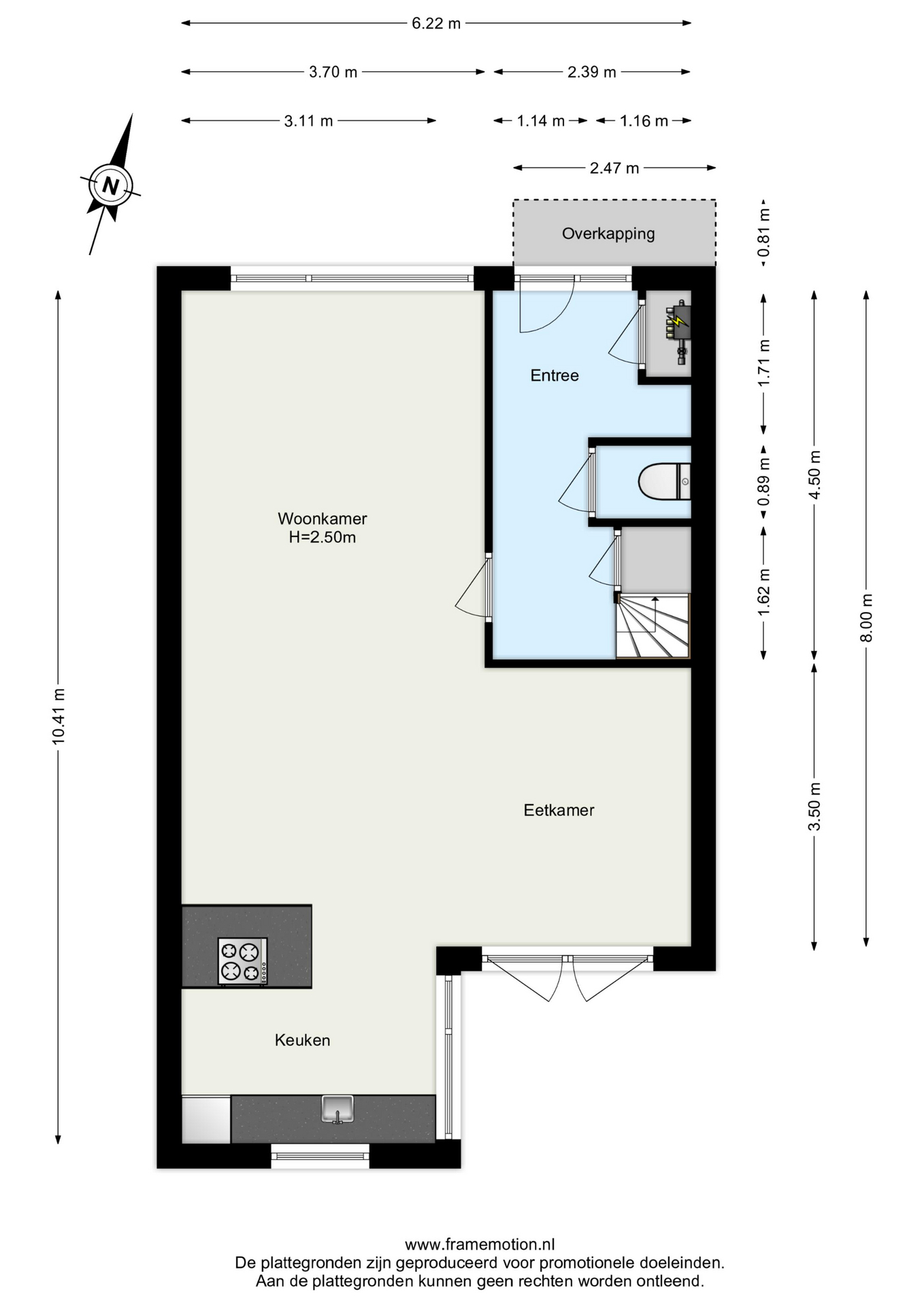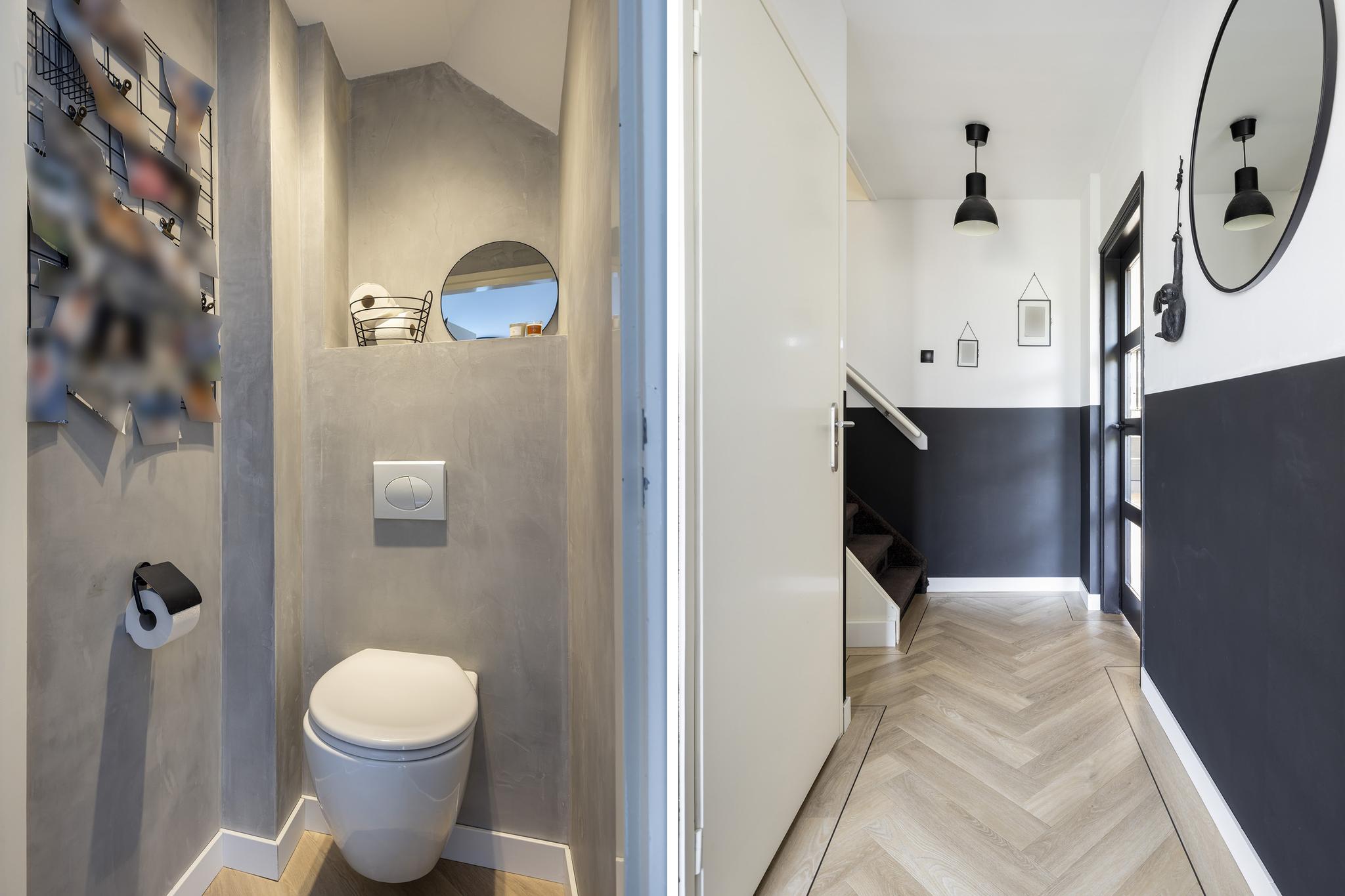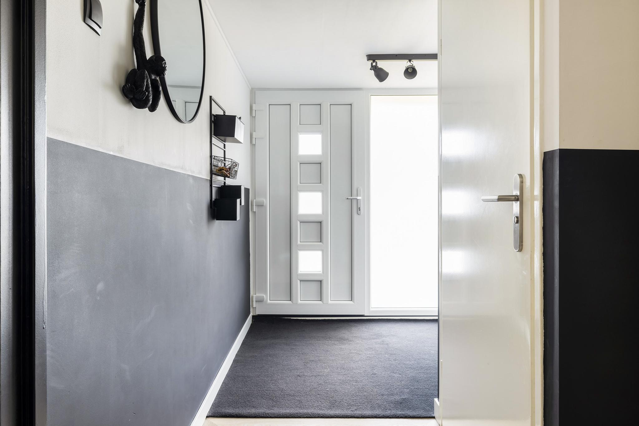 Entree in de hal met meterkast en vaste kast, toilet, trapopgang en toegang tot de woonkamer.