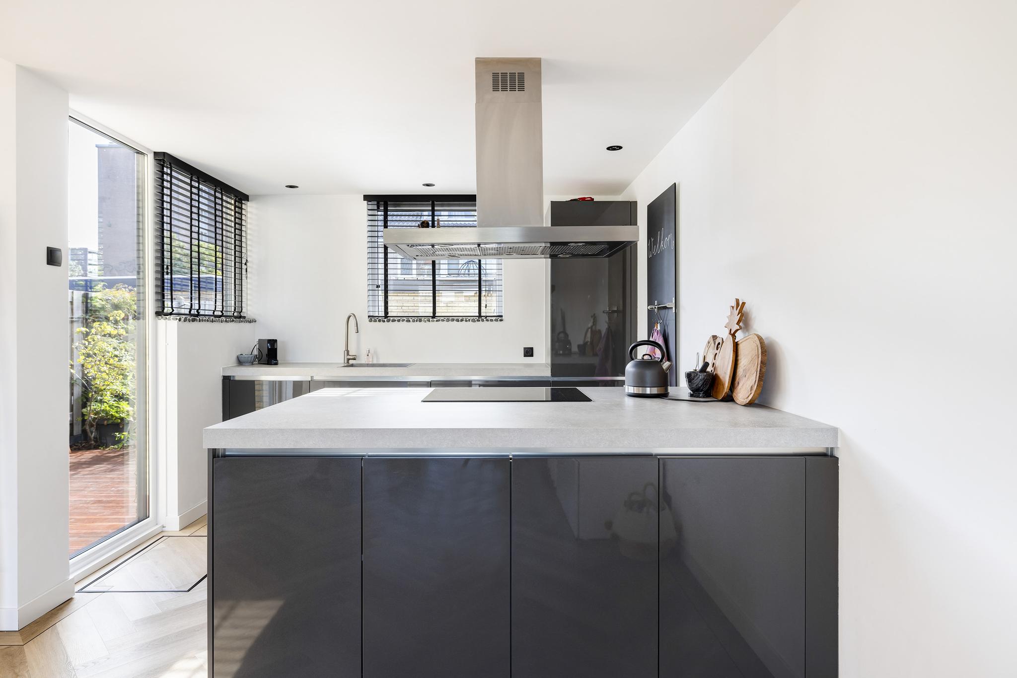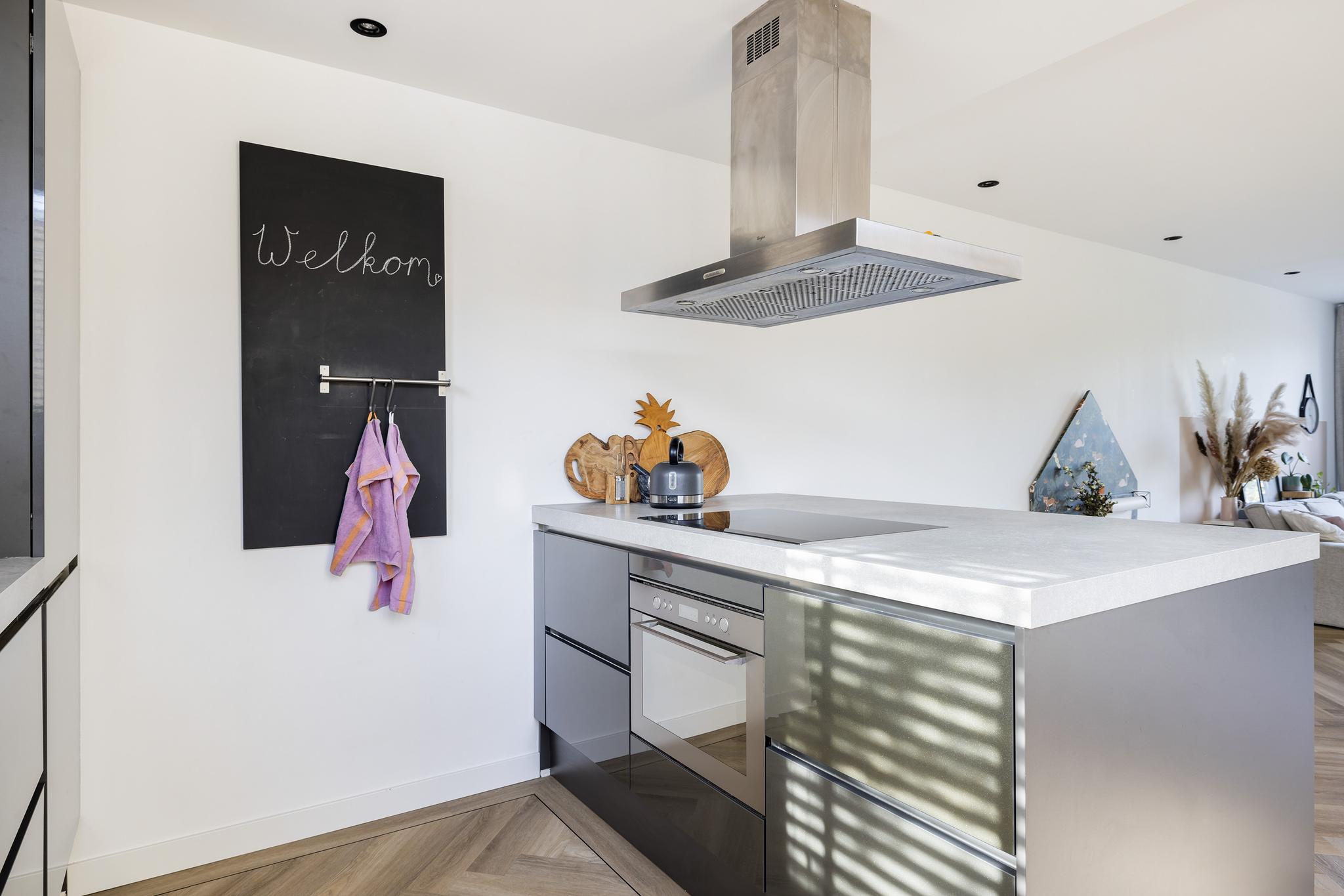 De keuken is voorzien van een vaatwasser (2021), keramische kookplaat (2021), spoelbak, koelkast met vriezer, combimagnetron, en eiland afzuigkap welke een uitvoer naar buiten heeft.