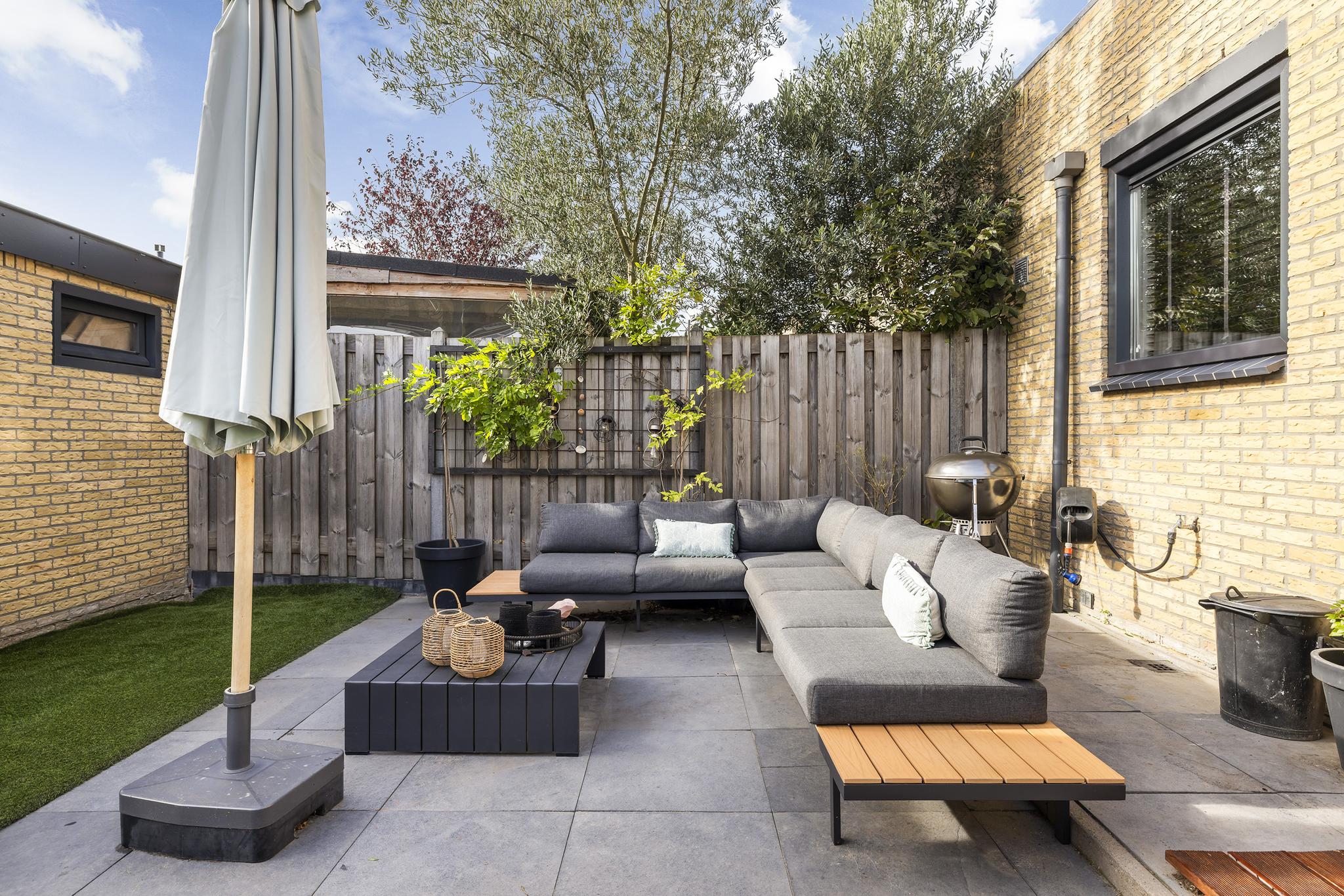 Achtertuin met achterom, vrijstaande stenen berging en mooie combinatie tussen loungen en speelplekken van de kinderen.