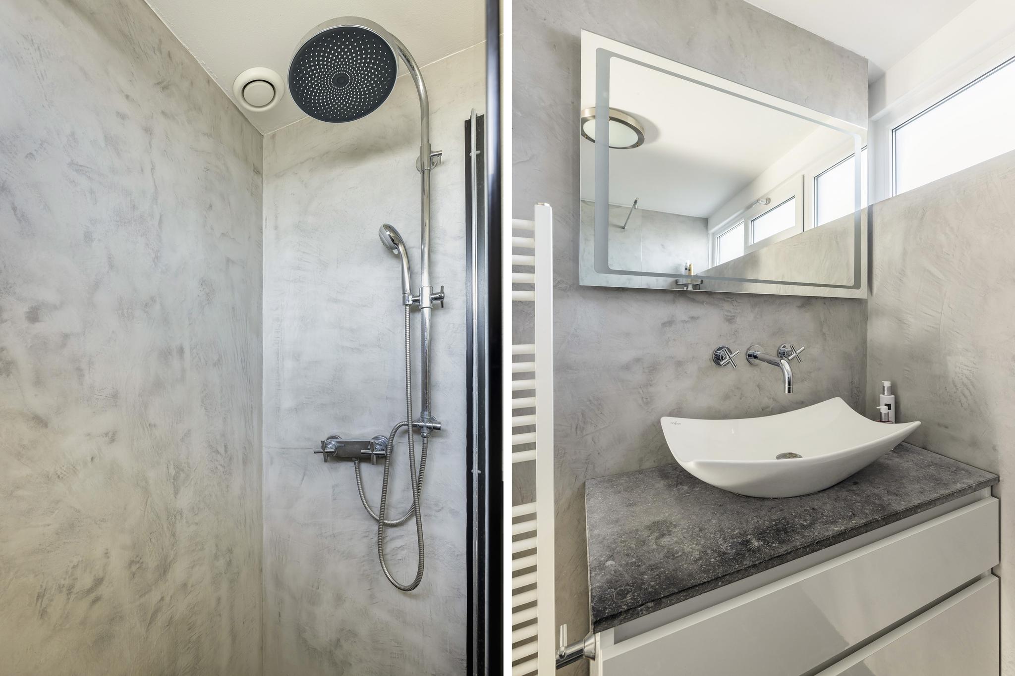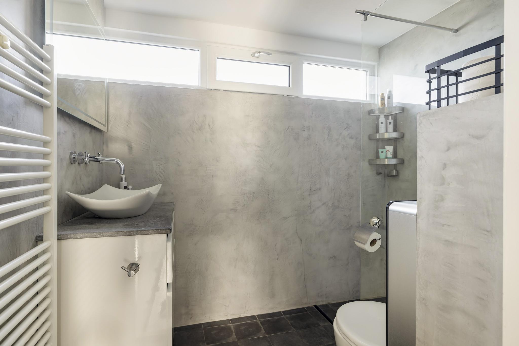 Badkamer met inloopdouche, vrij hangend toilet, wastafel en meubel, designradiator, beton ciré wanden ideaal om schoon te houden.