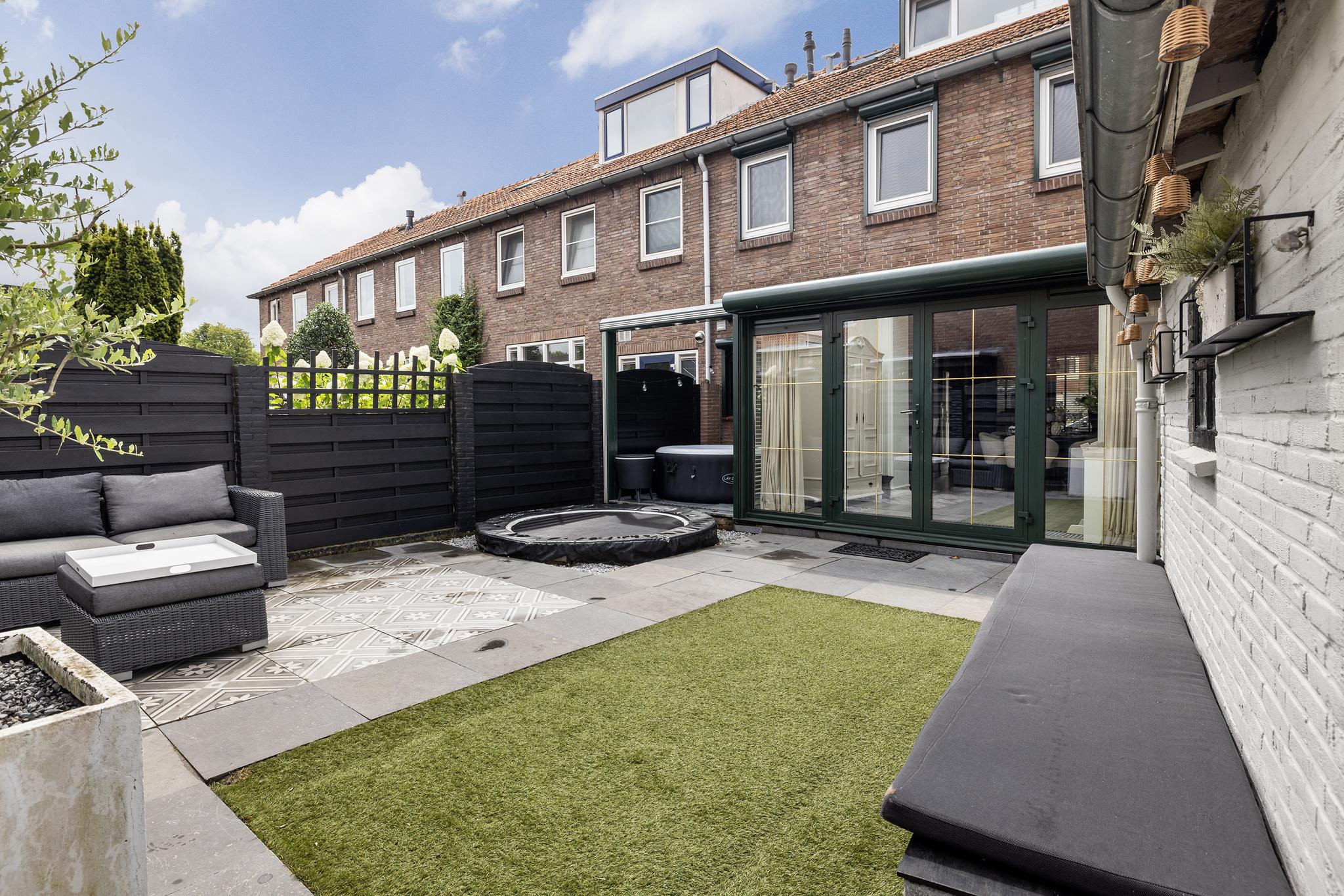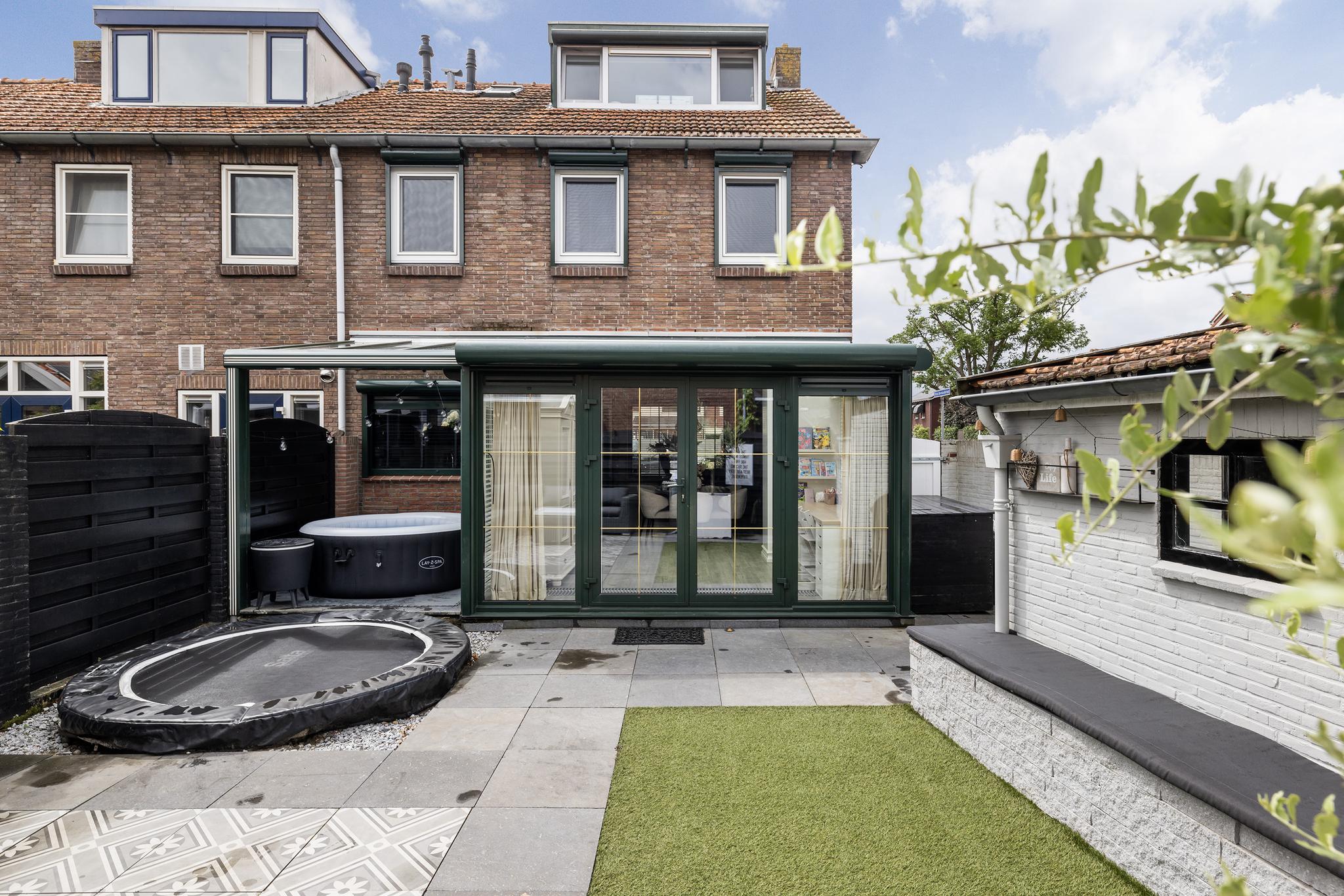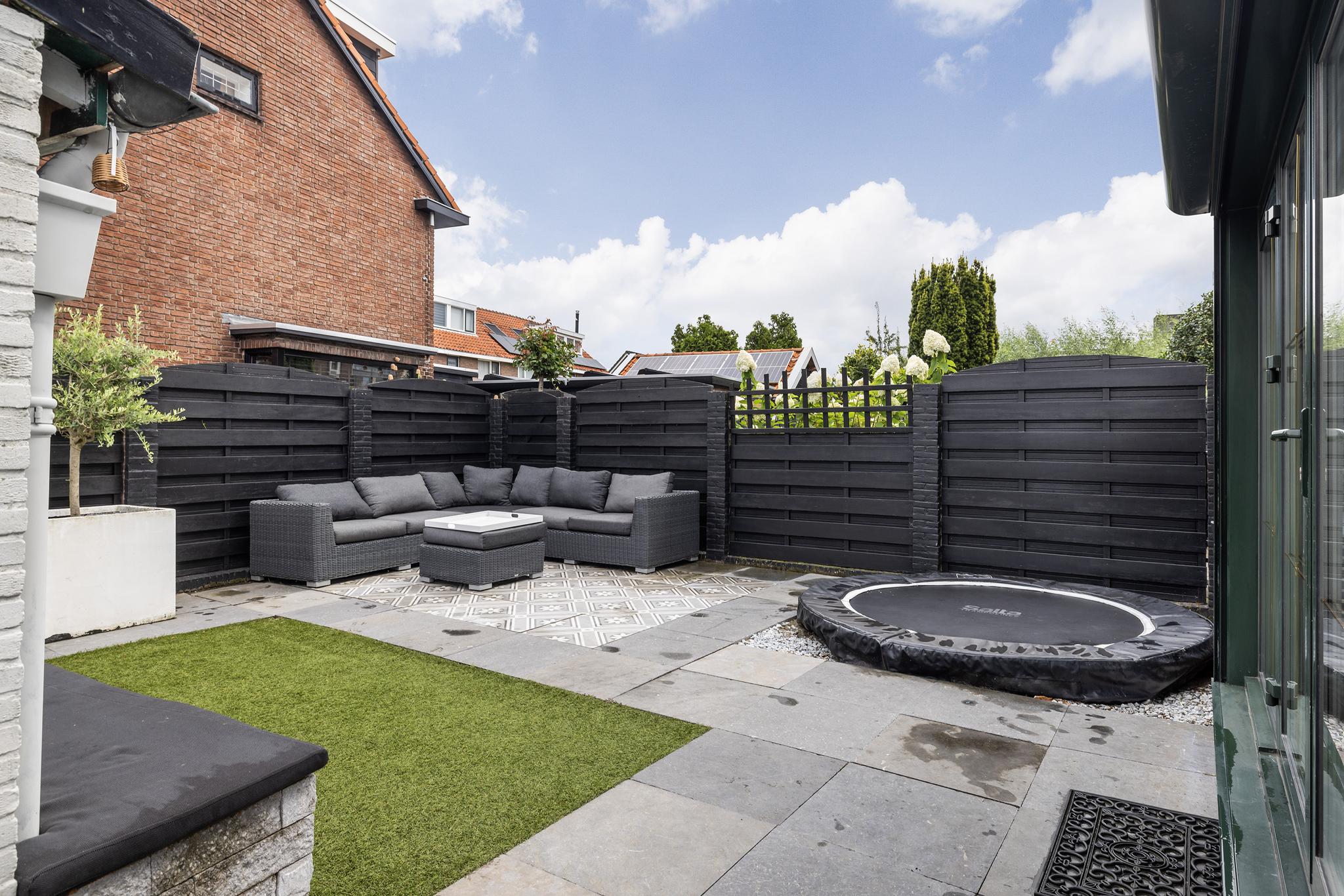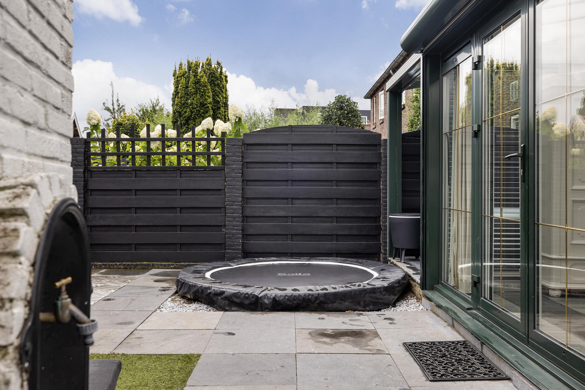 Heerlijke ruime en zonnige tuin, eigen stenen berging met elektra en water aan-en afvoer (hier kan dus de wasapparatuur staan). Voor de plek waar nu de trampoline staat zijn tegels aanwezig.